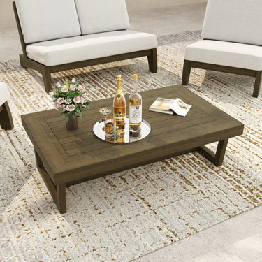 From coffee to cocktails, keep it centered with our Gideor Teak Wood Outdoor Rectangular Coffee Table. The clean rectangular top helps seating areas feel organized, giving everyone a shared surface for snacks, pitchers, and game-night extras. A low, sled-style base with sturdy end supports keeps the look grounded and stable outdoors. Plank-style tabletop detailing adds a crafted finish and a touch of texture up top. Slide it between loveseats and chairs, and the whole patio feels more ready for easy company.