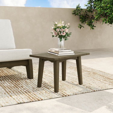 No more balancing cups on armrests with our Gideor Teak Wood Outdoor Rectangular Side Table. This compact rectangular surface slides beside chairs and loveseats to hold drinks, sunglasses, and the little things that make outdoor time feel easier. Plank-style detailing adds a crafted look up top, while tapered legs keep the profile light and steady. Teak brings a warm, clean finish that looks right outside without trying too hard. Pull it close, set it down, and keep the lounging uninterrupted.