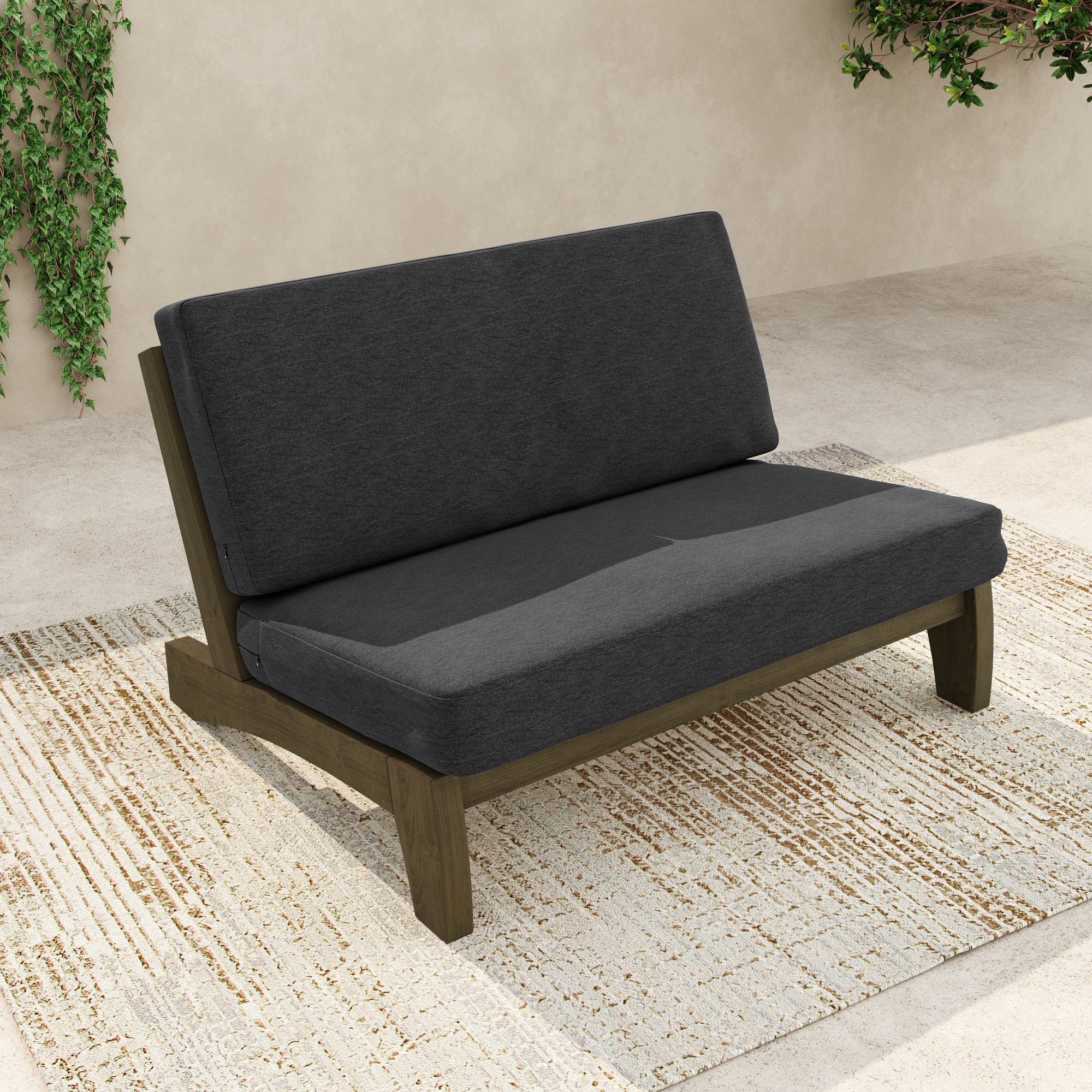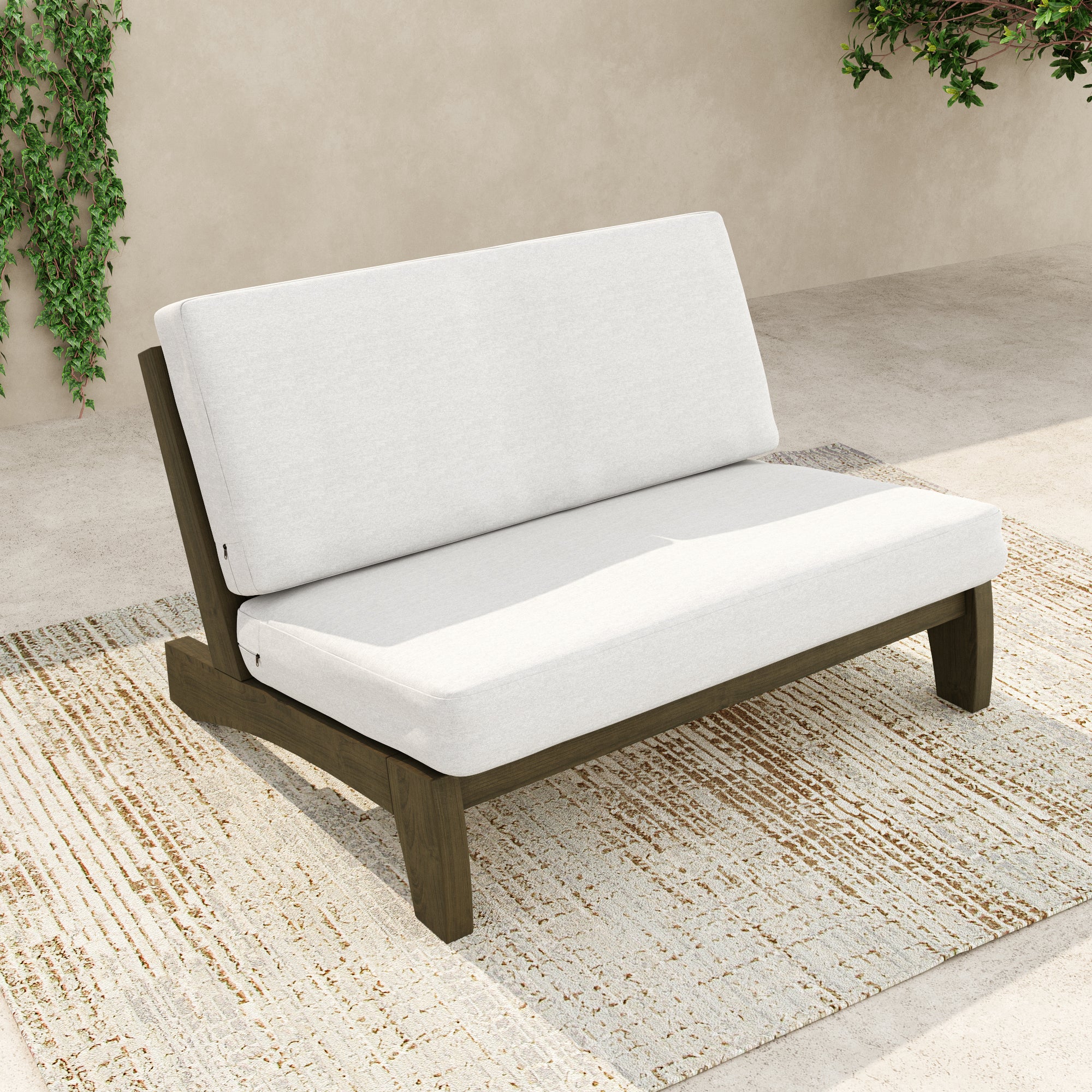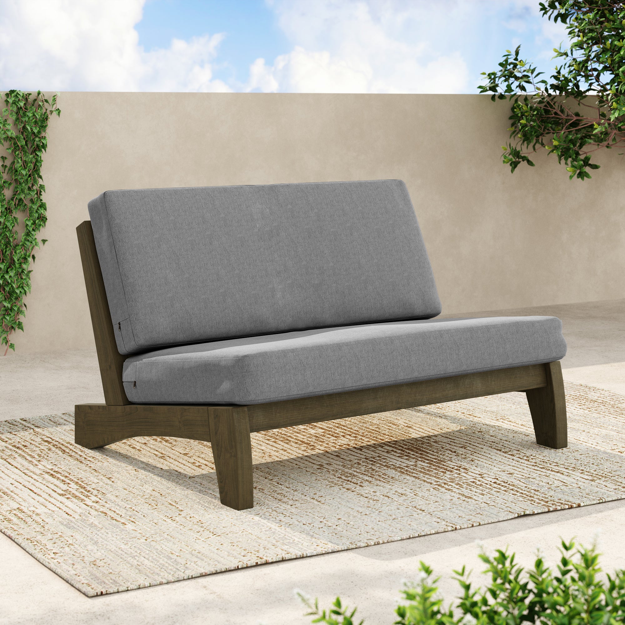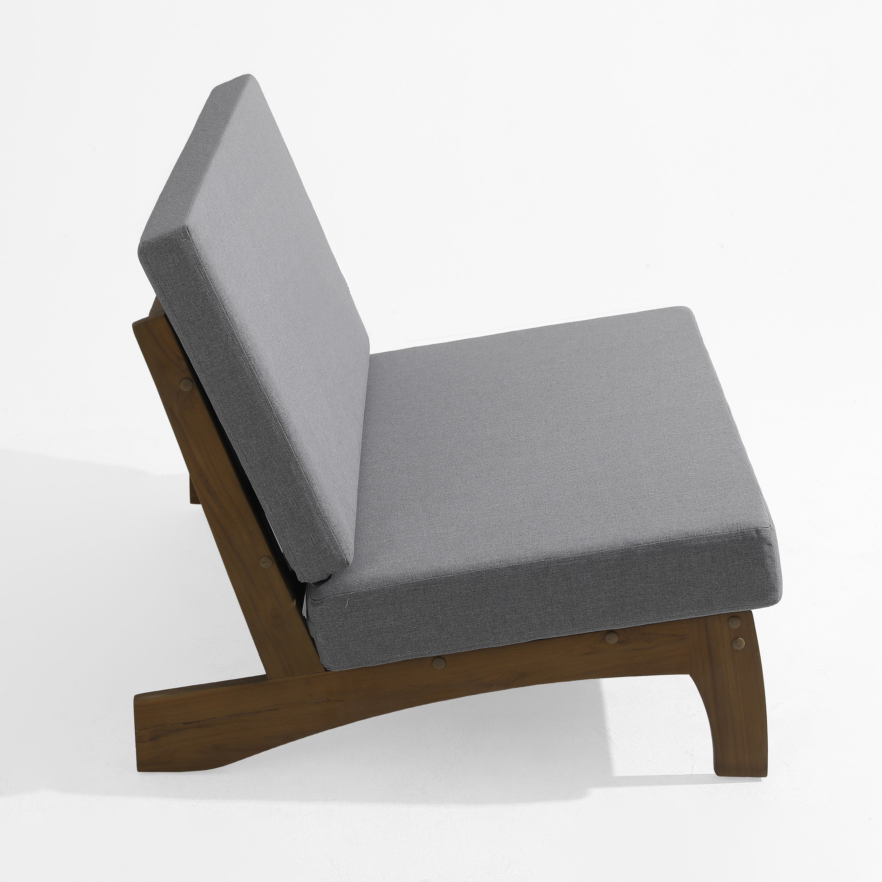 Steal a little golden hour for yourself with our Gideor Modern Teak Outdoor Armless Loveseat. The seamless back keeps the silhouette smooth and uninterrupted, perfect for clean-lined patios and modern outdoor spaces. A slanted ladder-back adds a relaxed recline, while foam-padded cushions bring the kind of comfort that makes "one more minute" happen. Spill-resistant cotton-blend upholstery helps with everyday drips, and zippered covers make upkeep feel simple. Finished in warm teak, it's an easy anchor piece that looks good in daylight and even better when the string lights come on.
