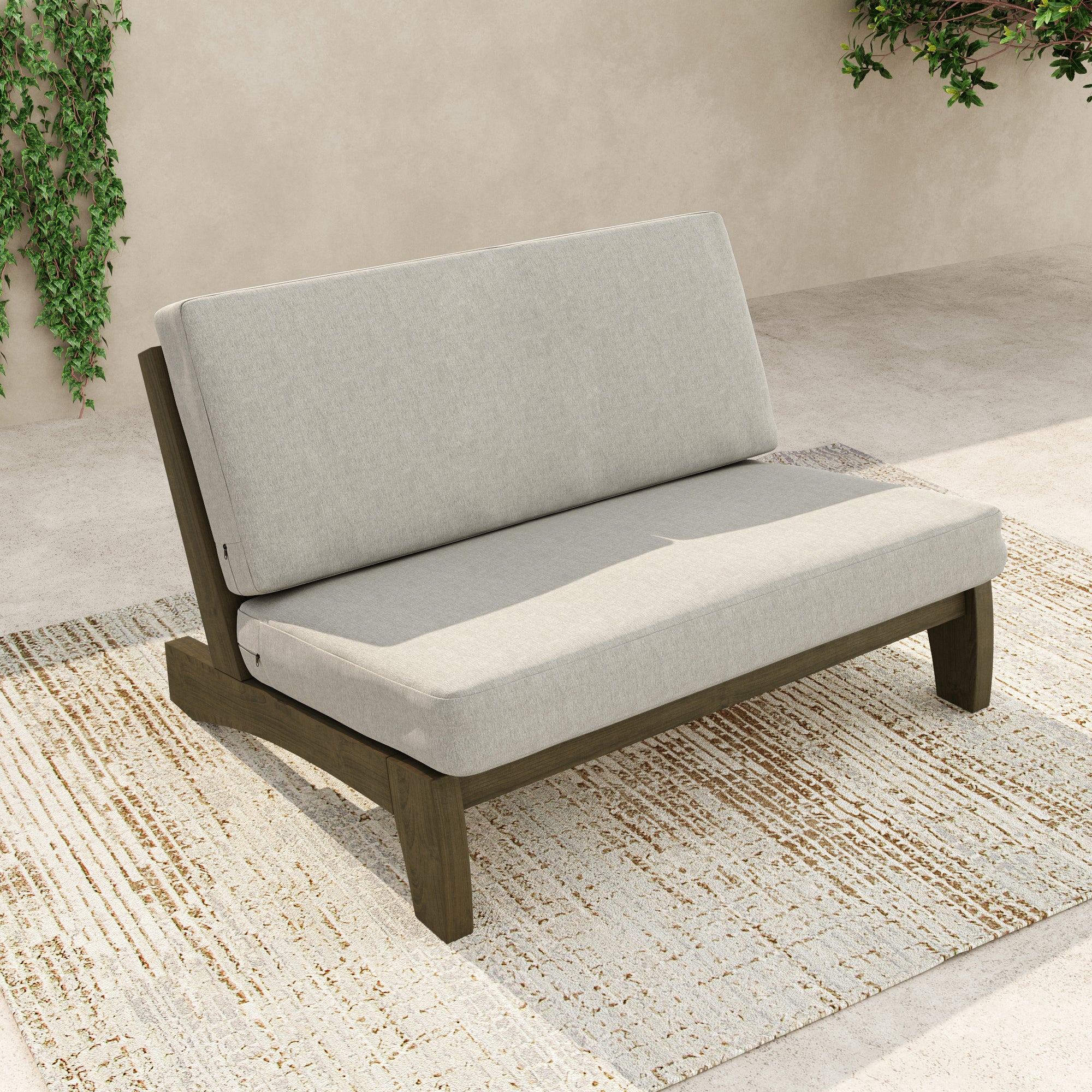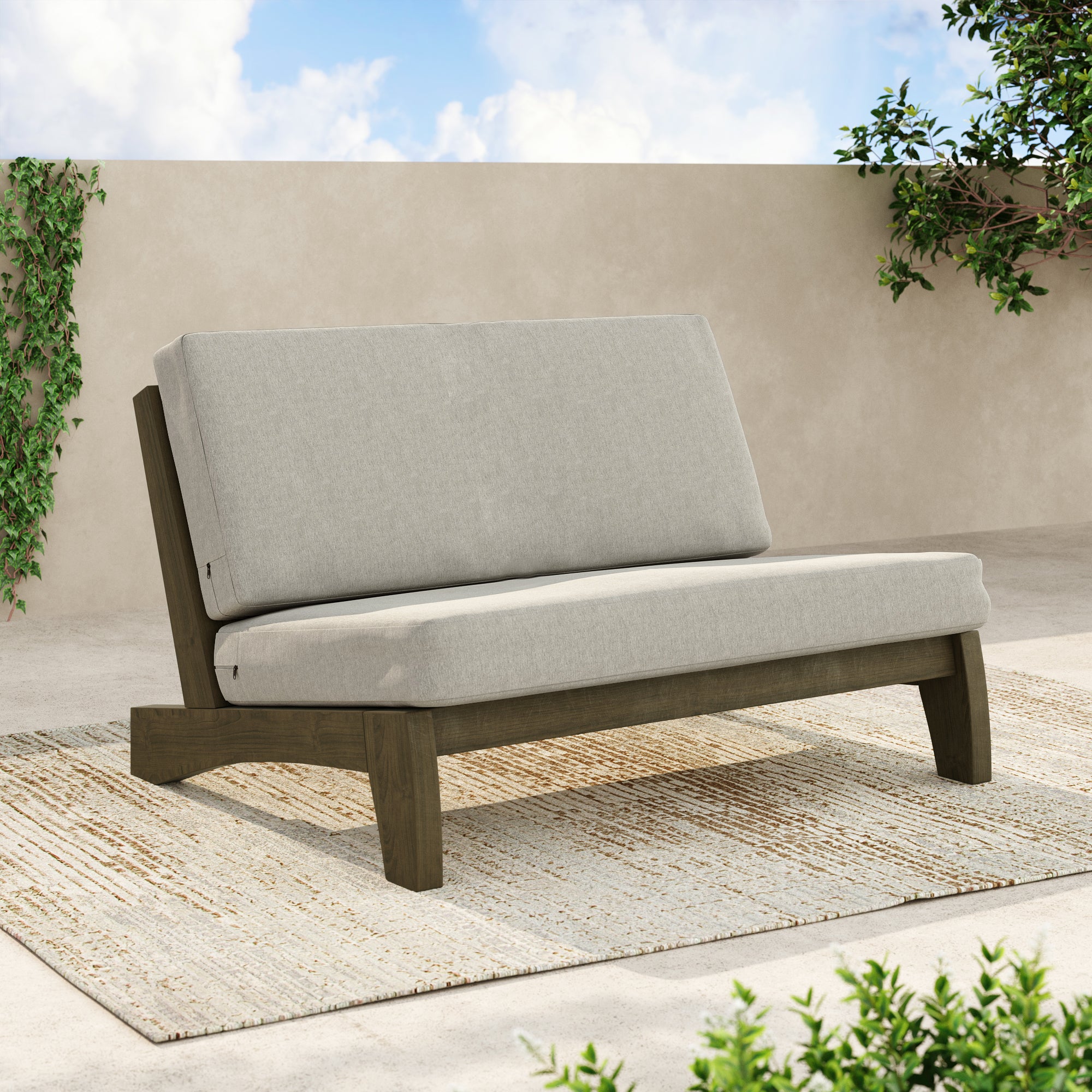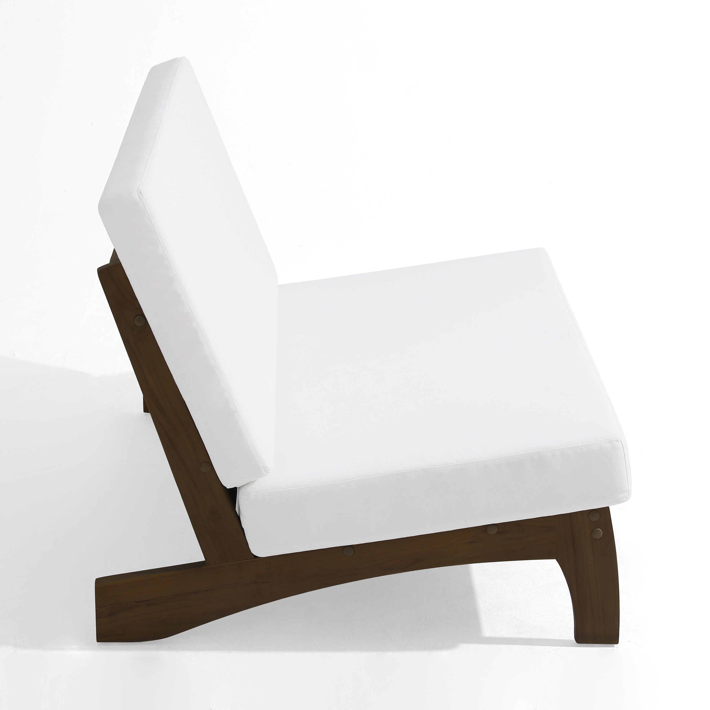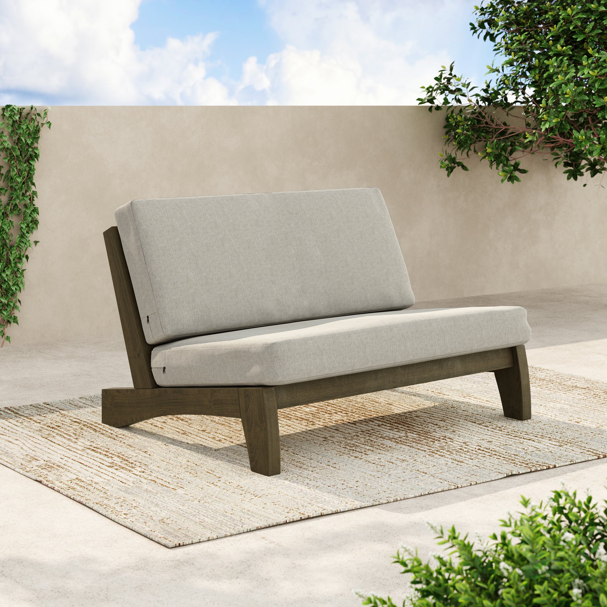 Steal a little golden hour for yourself with our Gideor Modern Teak Outdoor Armless Loveseat. The seamless back keeps the silhouette smooth and uninterrupted, perfect for clean-lined patios and modern outdoor spaces. A slanted ladder-back adds a relaxed recline, while foam-padded cushions bring the kind of comfort that makes "one more minute" happen. Spill-resistant cotton-blend upholstery helps with everyday drips, and zippered covers make upkeep feel simple. Finished in warm teak, it's an easy anchor piece that looks good in daylight and even better when the string lights come on.