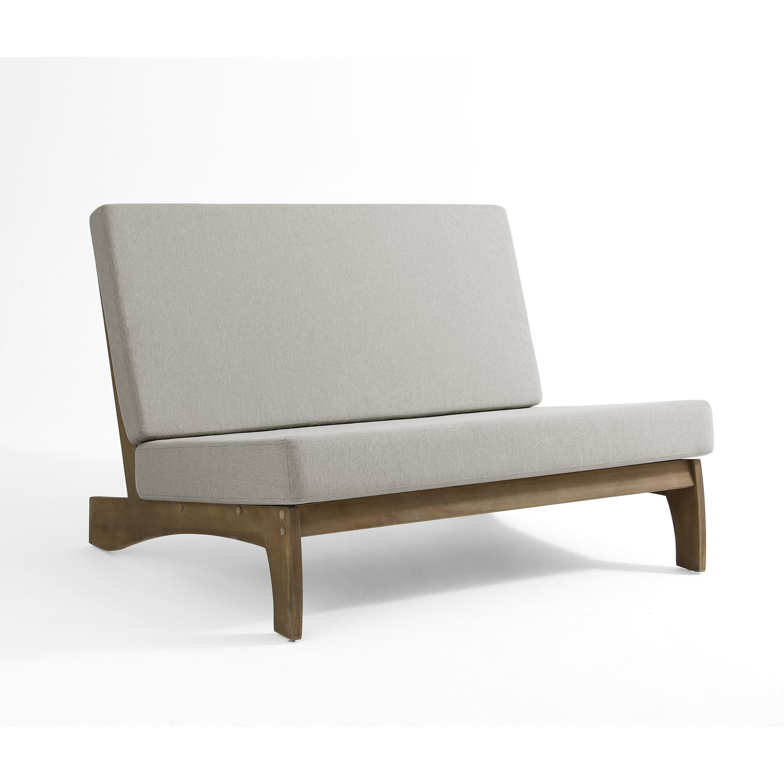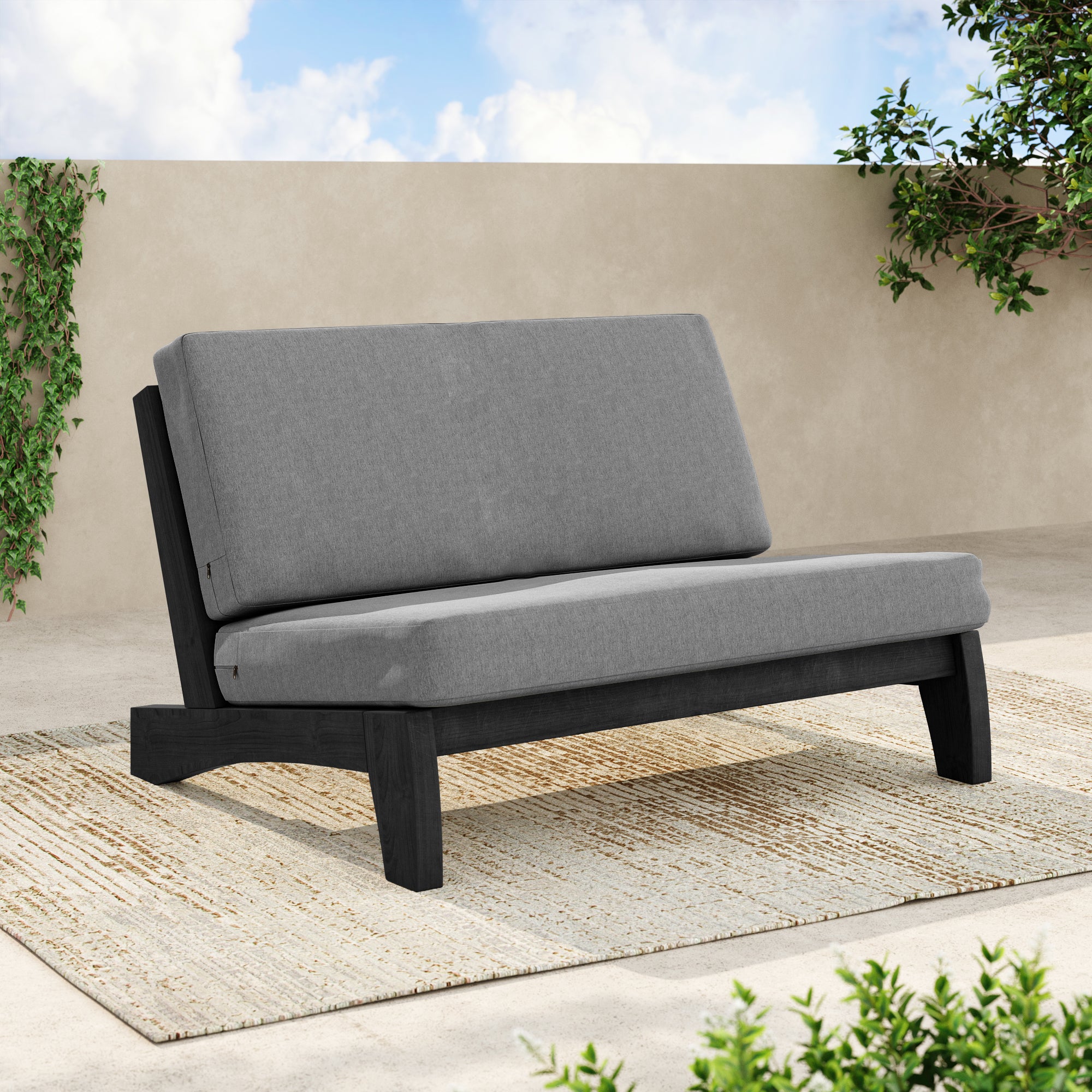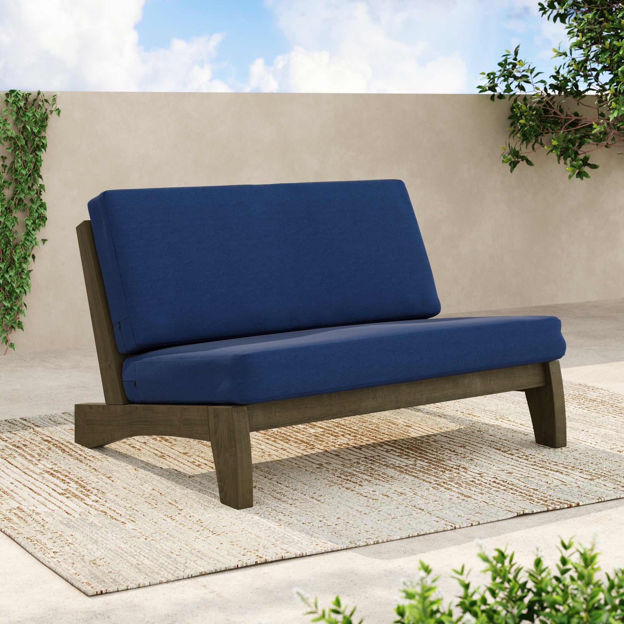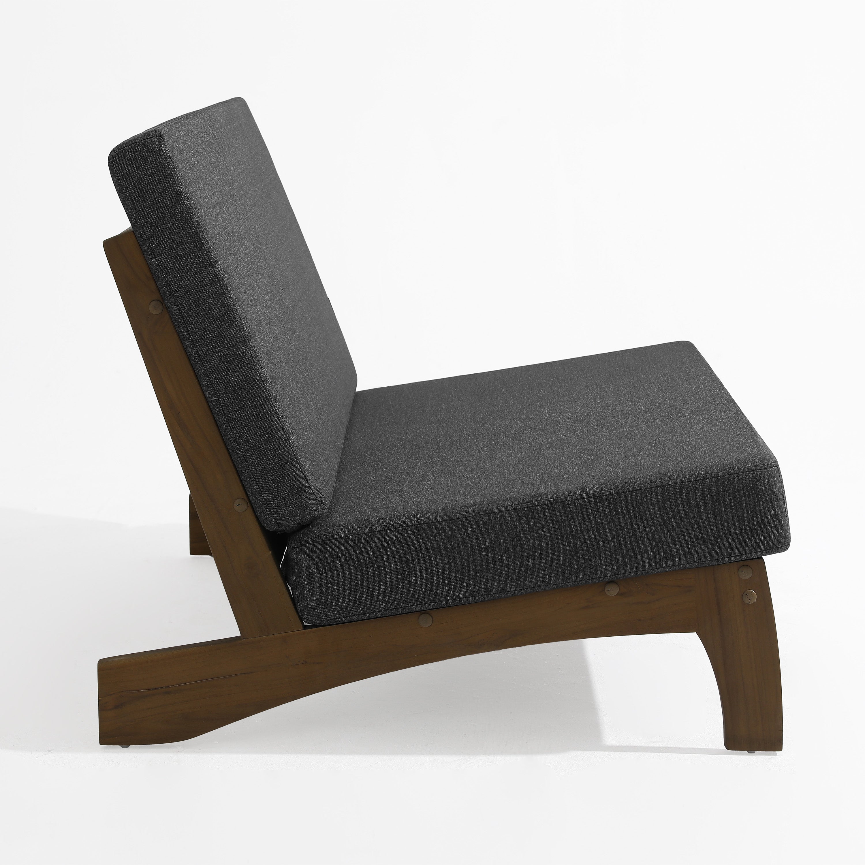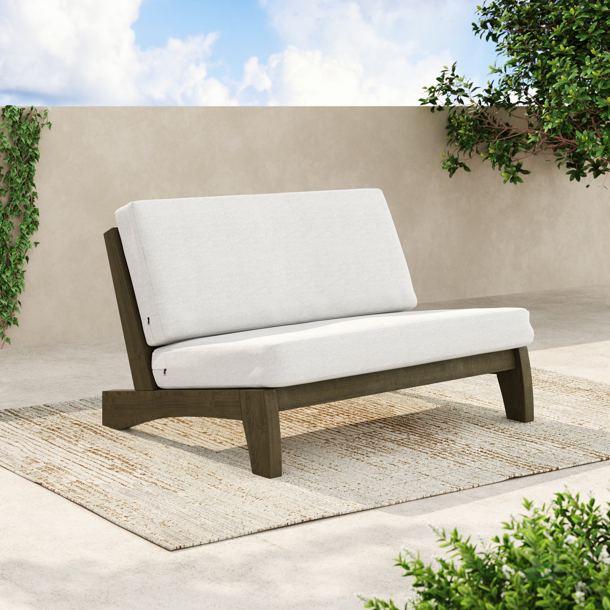 Steal a little golden hour for yourself with our Gideor Modern Teak Outdoor Armless Loveseat. The seamless back keeps the silhouette smooth and uninterrupted, perfect for clean-lined patios and modern outdoor spaces. A slanted ladder-back adds a relaxed recline, while foam-padded cushions bring the kind of comfort that makes "one more minute" happen. Spill-resistant cotton-blend upholstery helps with everyday drips, and zippered covers make upkeep feel simple. Finished in warm teak, it's an easy anchor piece that looks good in daylight and even better when the string lights come on.