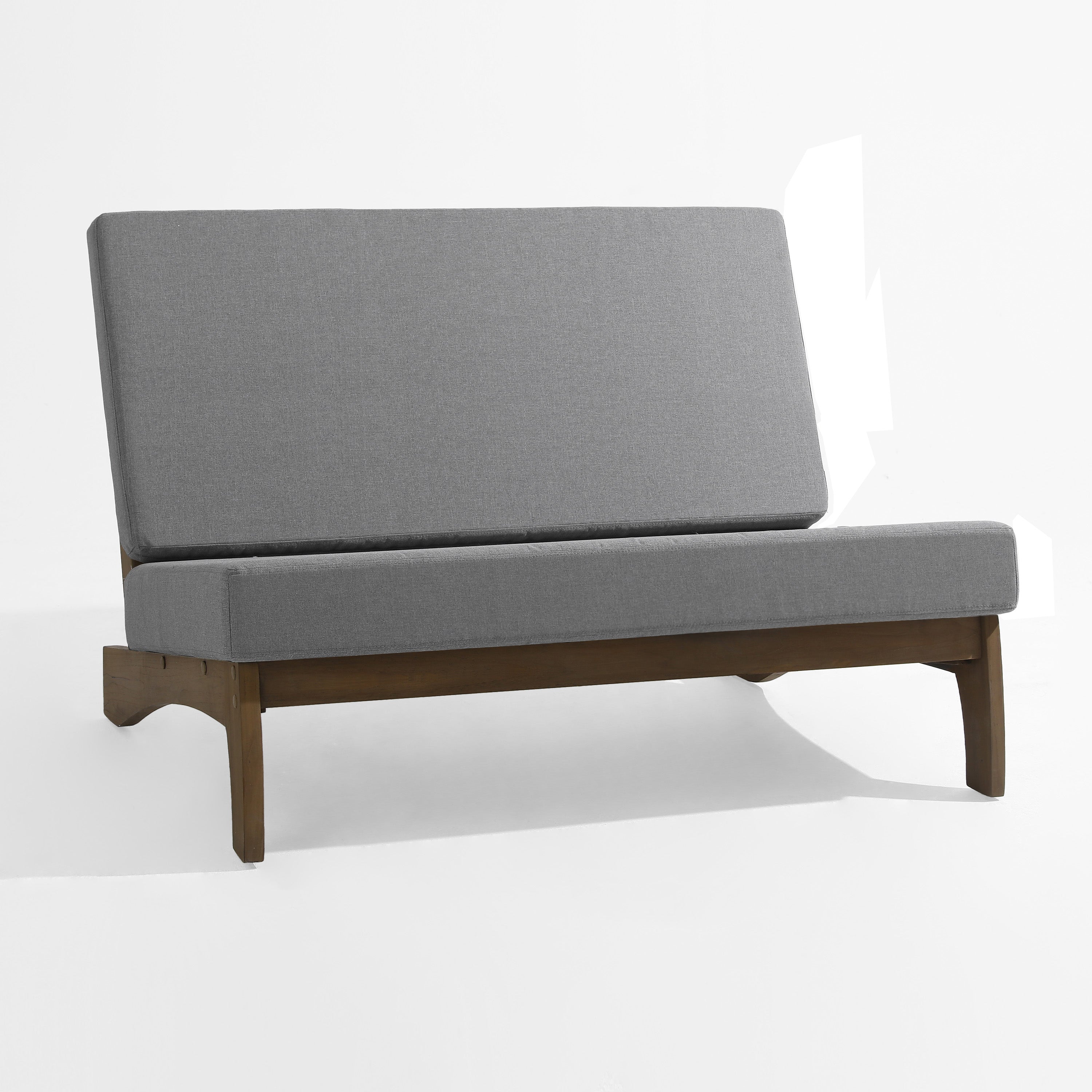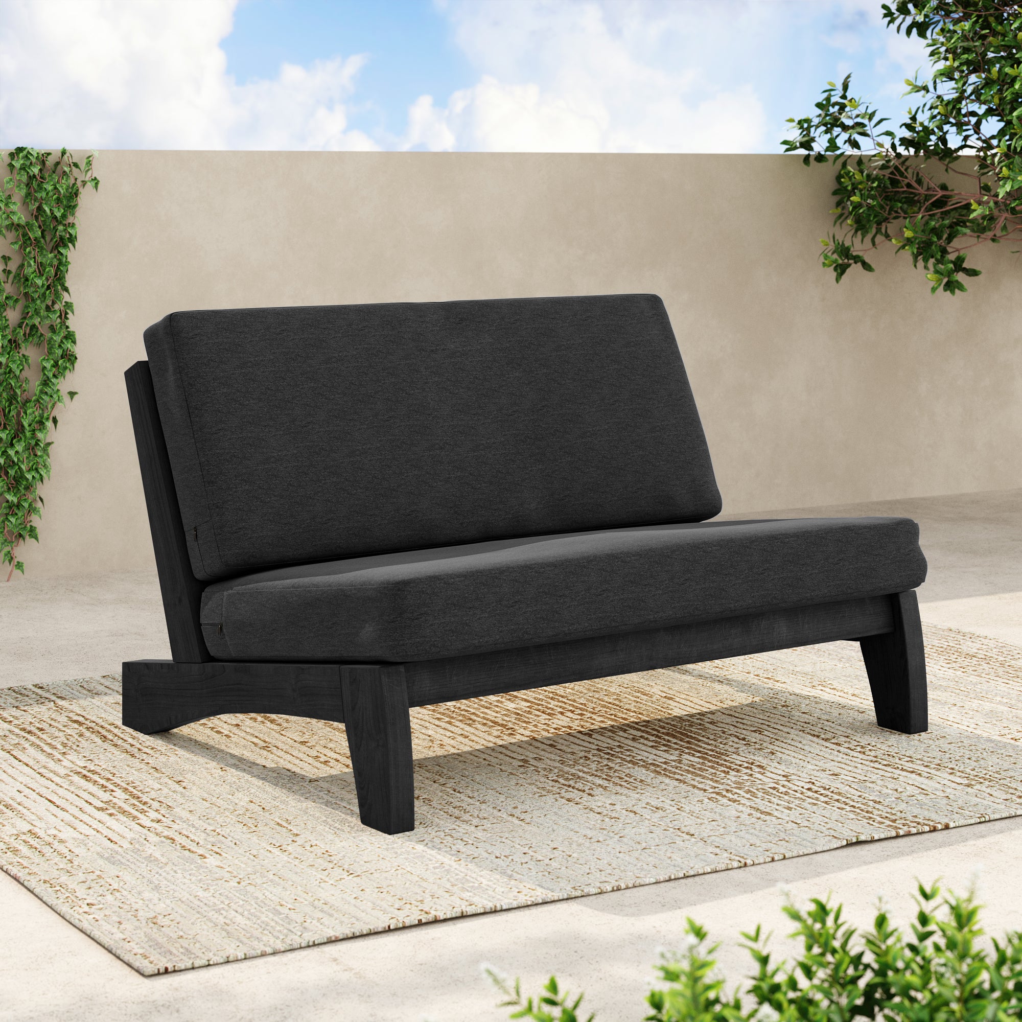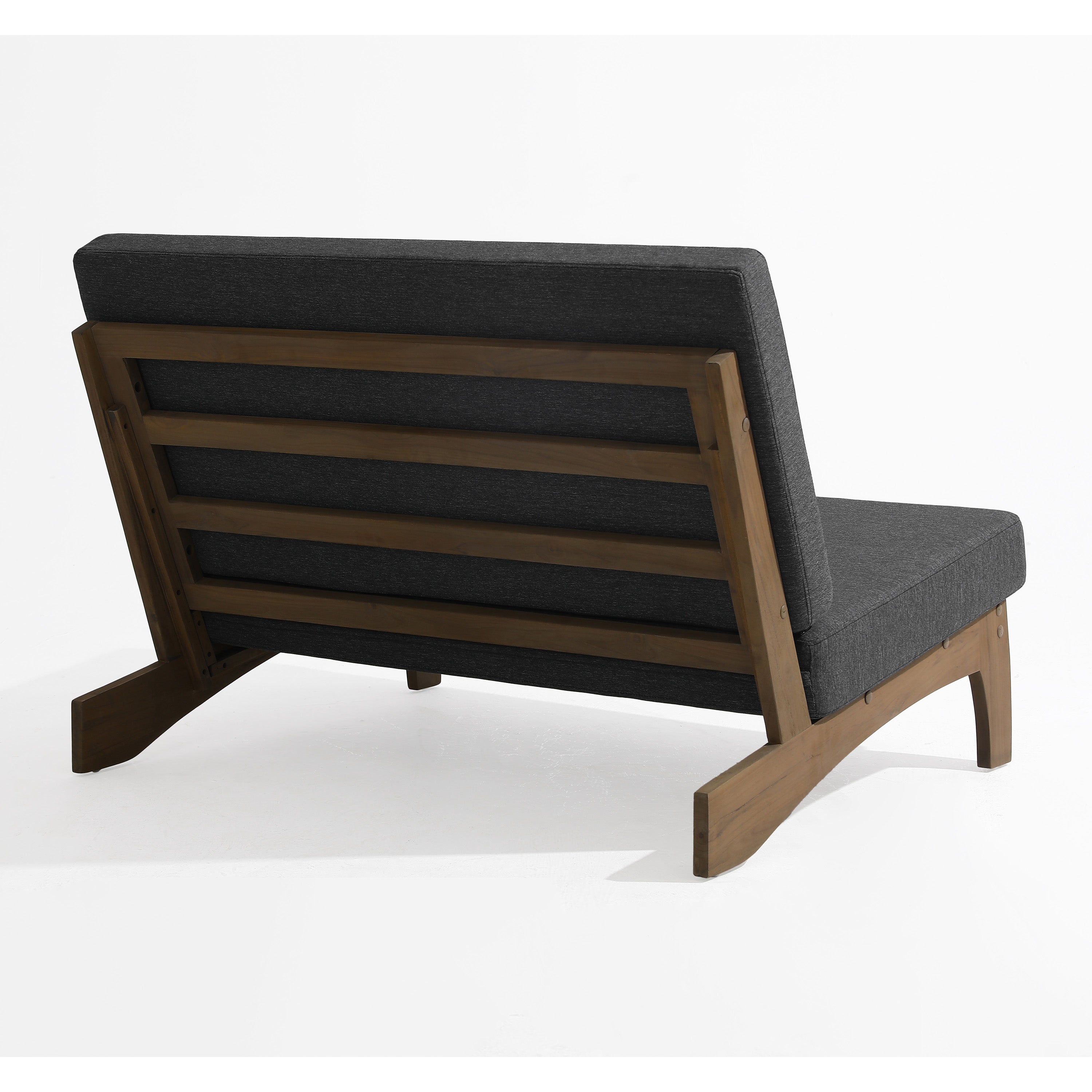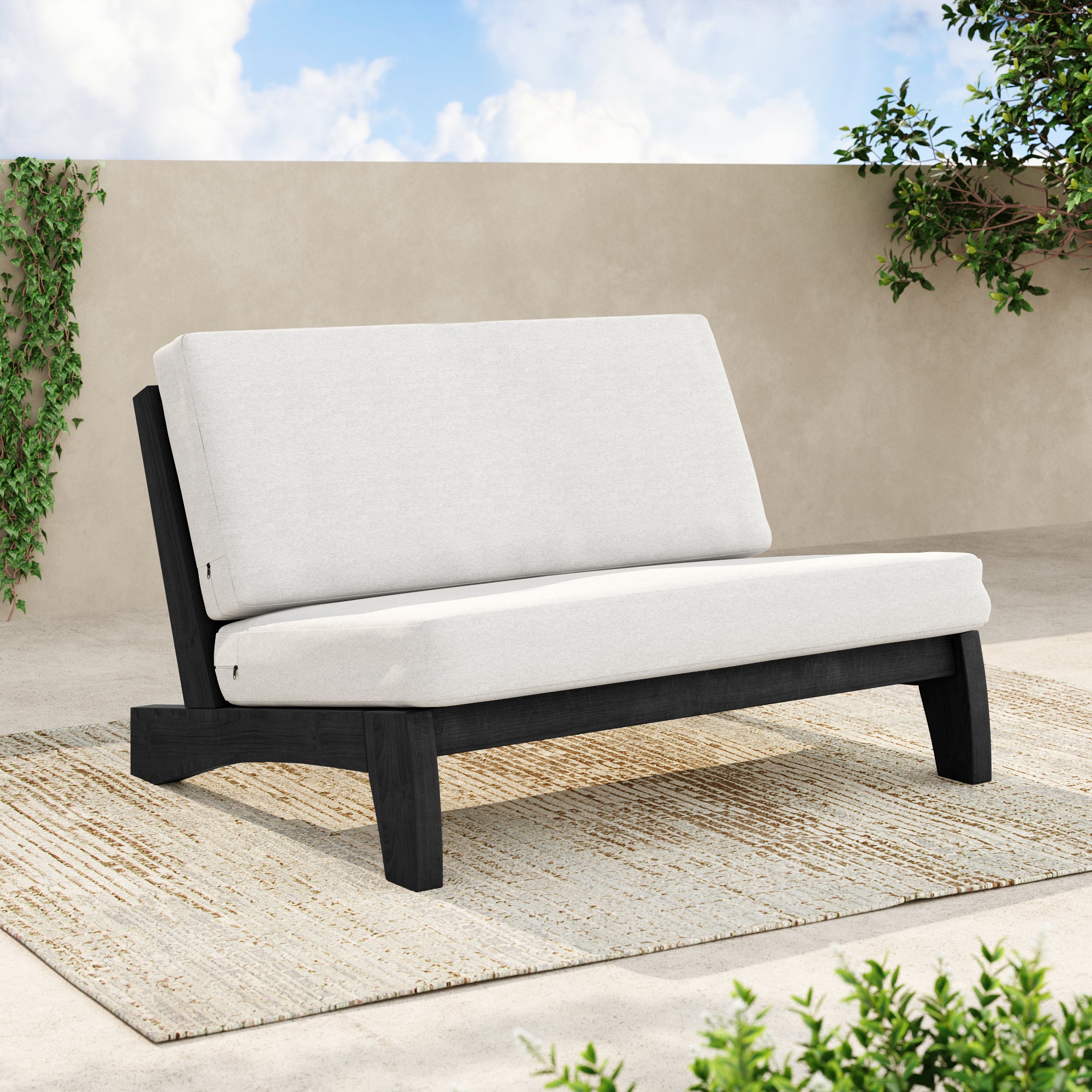Steal a little golden hour for yourself with our Gideor Modern Teak Outdoor Armless Loveseat. The seamless back keeps the silhouette smooth and uninterrupted, perfect for clean-lined patios and modern outdoor spaces. A slanted ladder-back adds a relaxed recline, while foam-padded cushions bring the kind of comfort that makes "one more minute" happen. Spill-resistant cotton-blend upholstery helps with everyday drips, and zippered covers make upkeep feel simple. Finished in warm teak, it's an easy anchor piece that looks good in daylight and even better when the string lights come on.