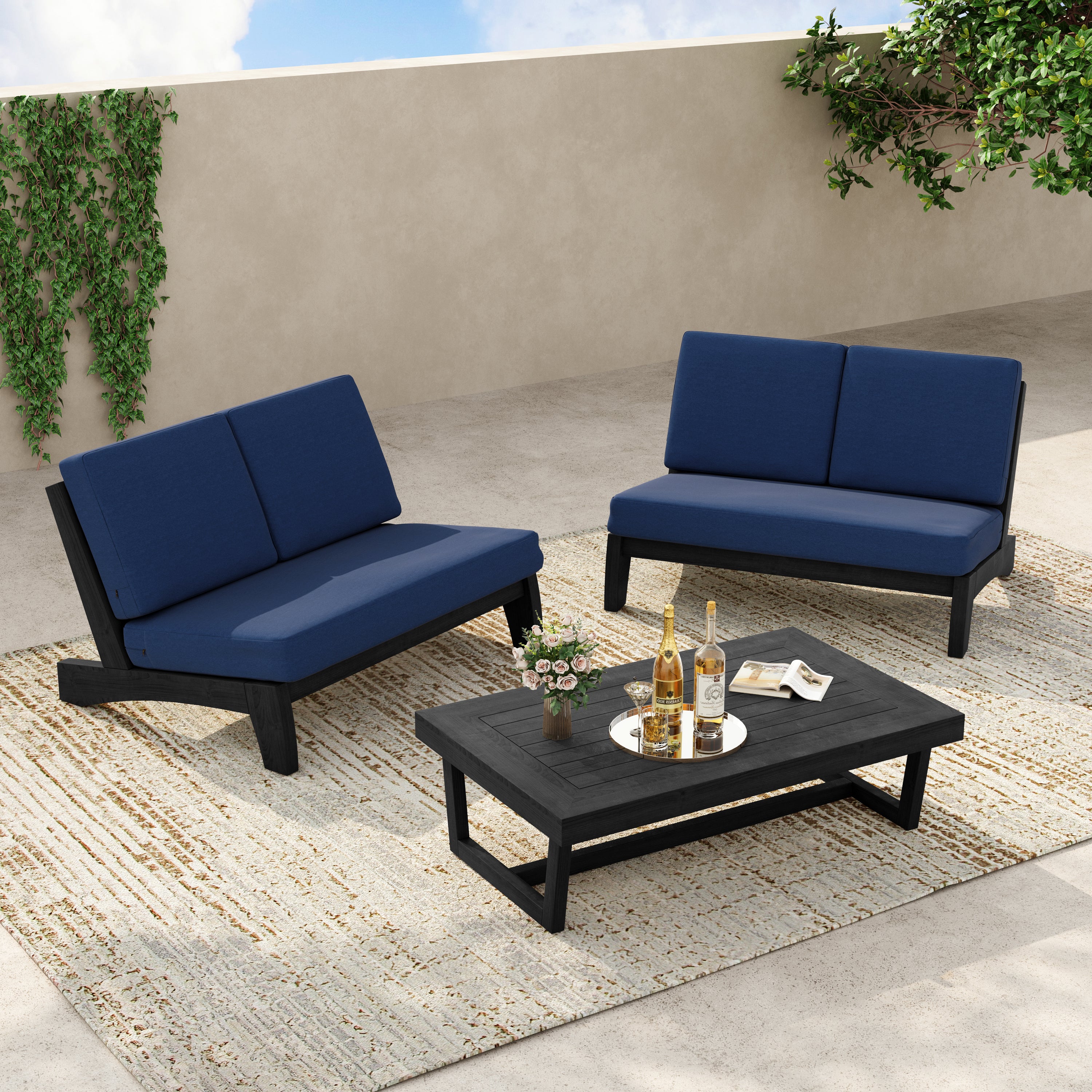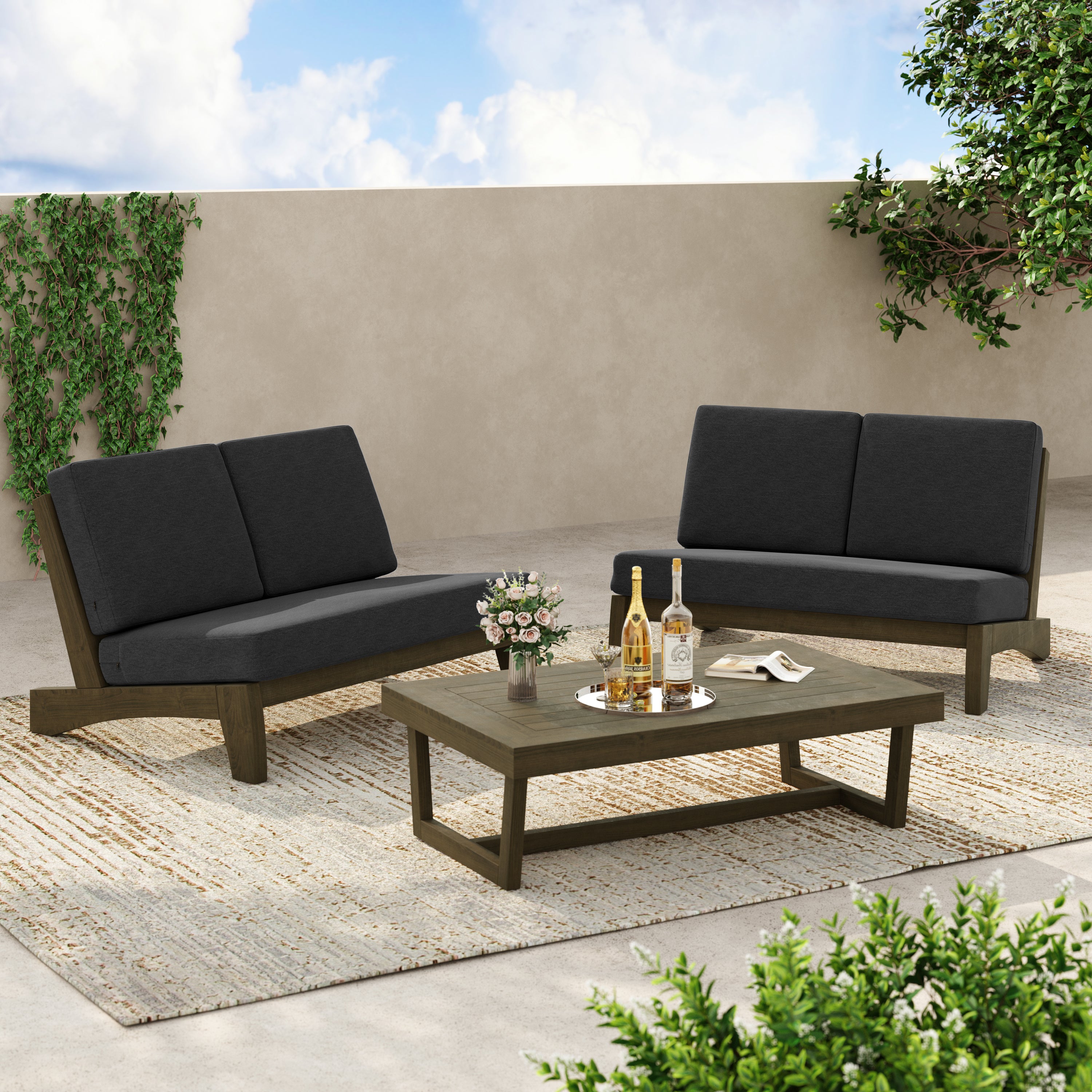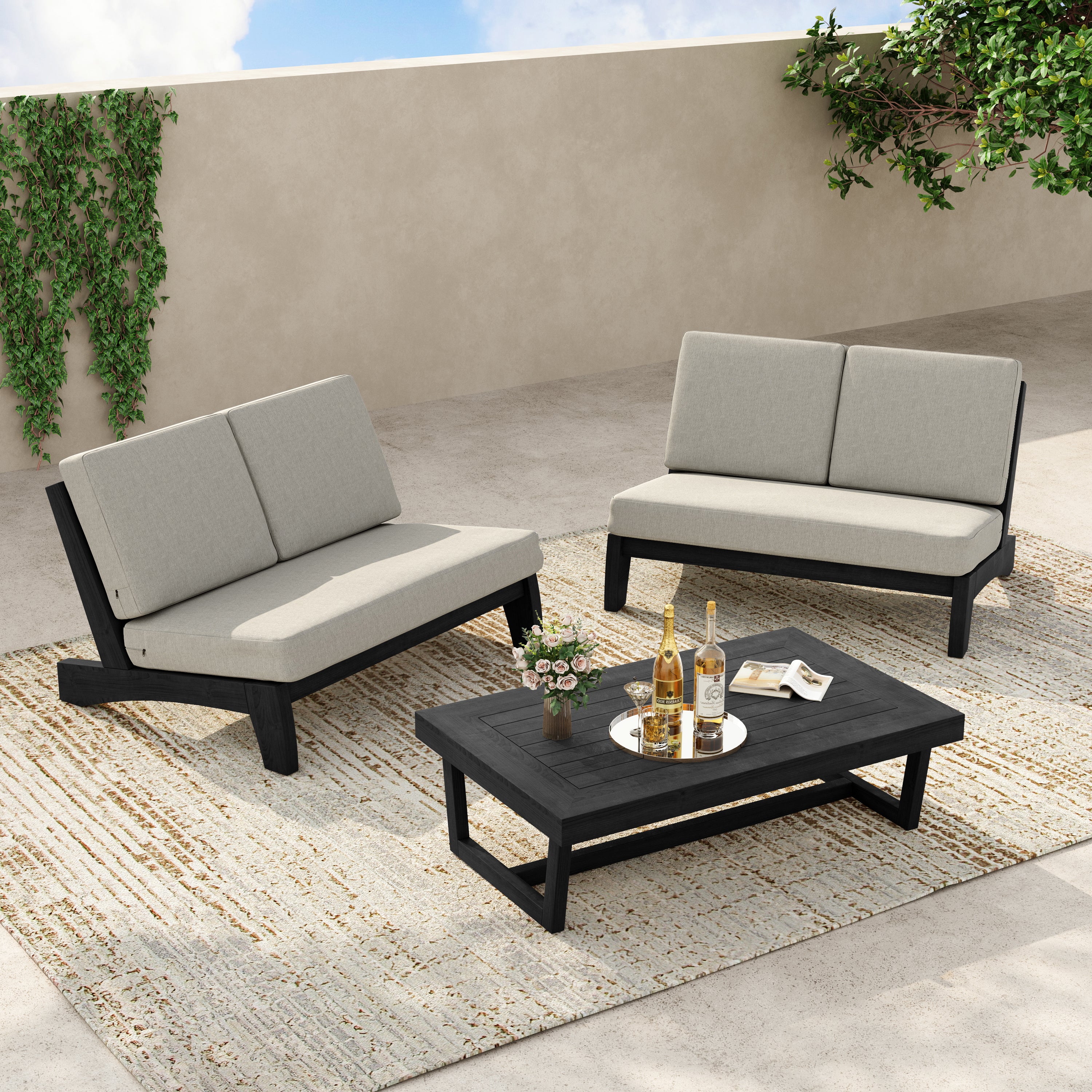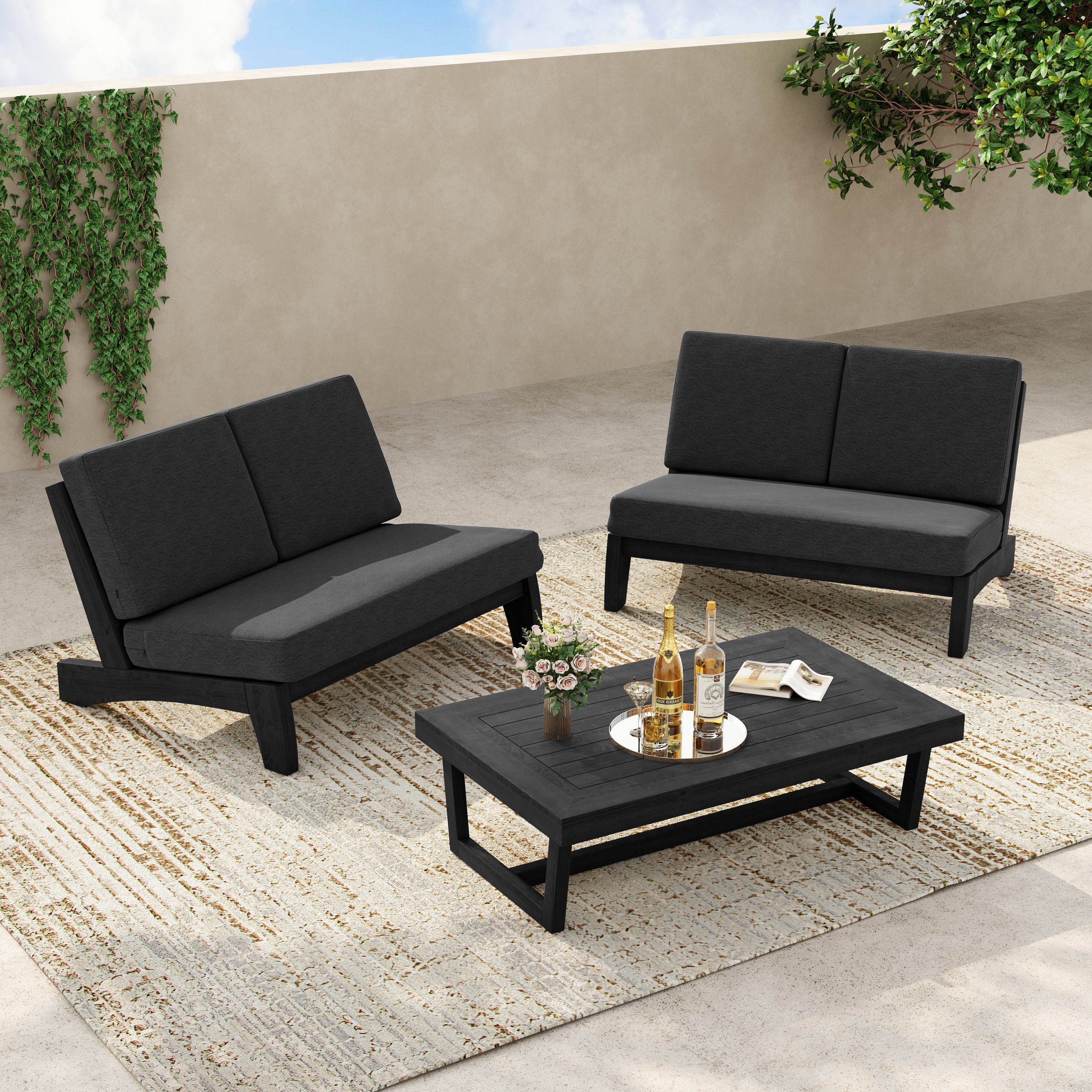 2-piece set includes a split-back loveseat plus a teak side table for daily use.