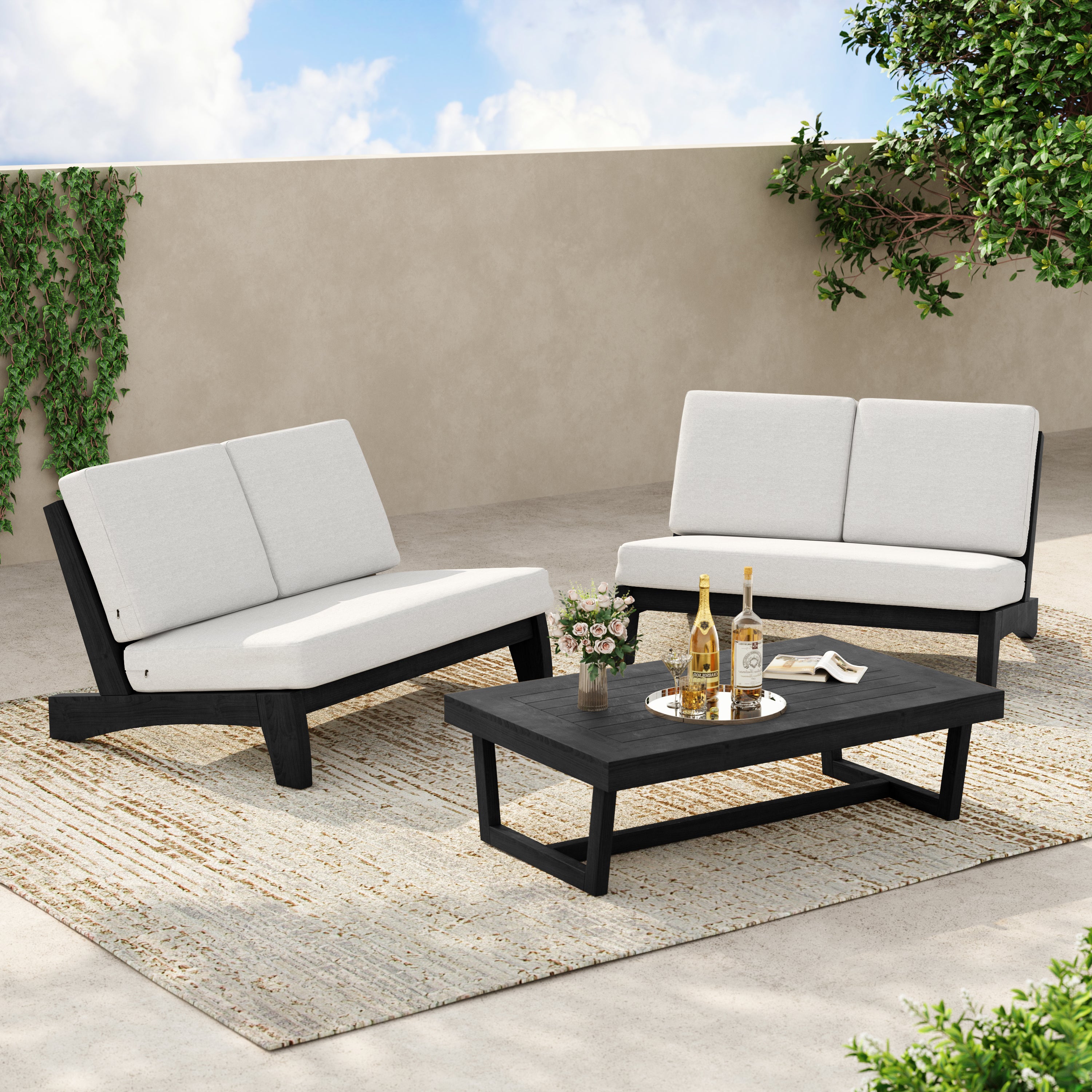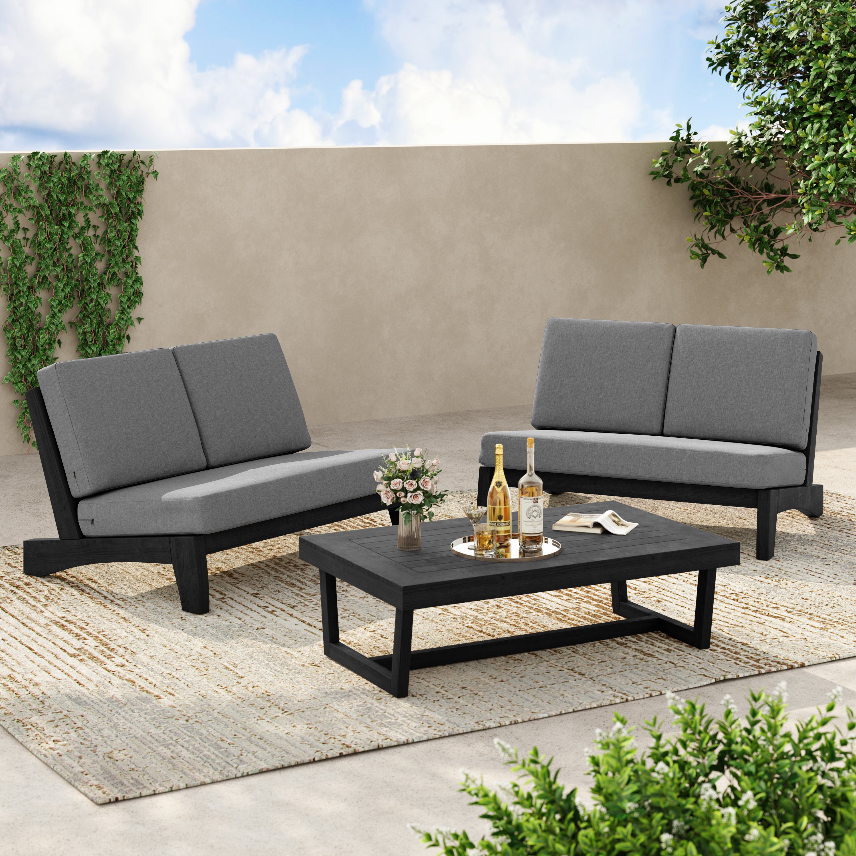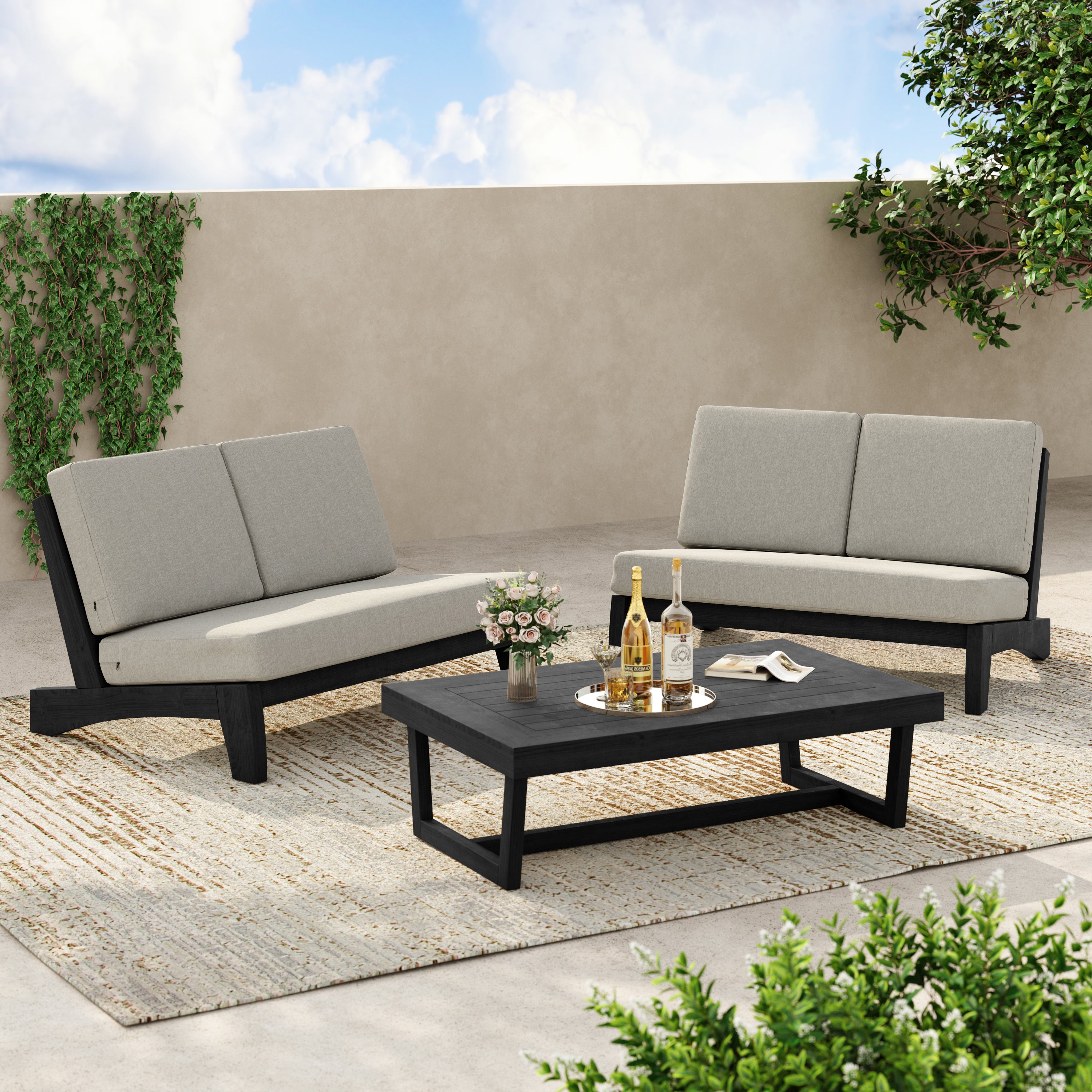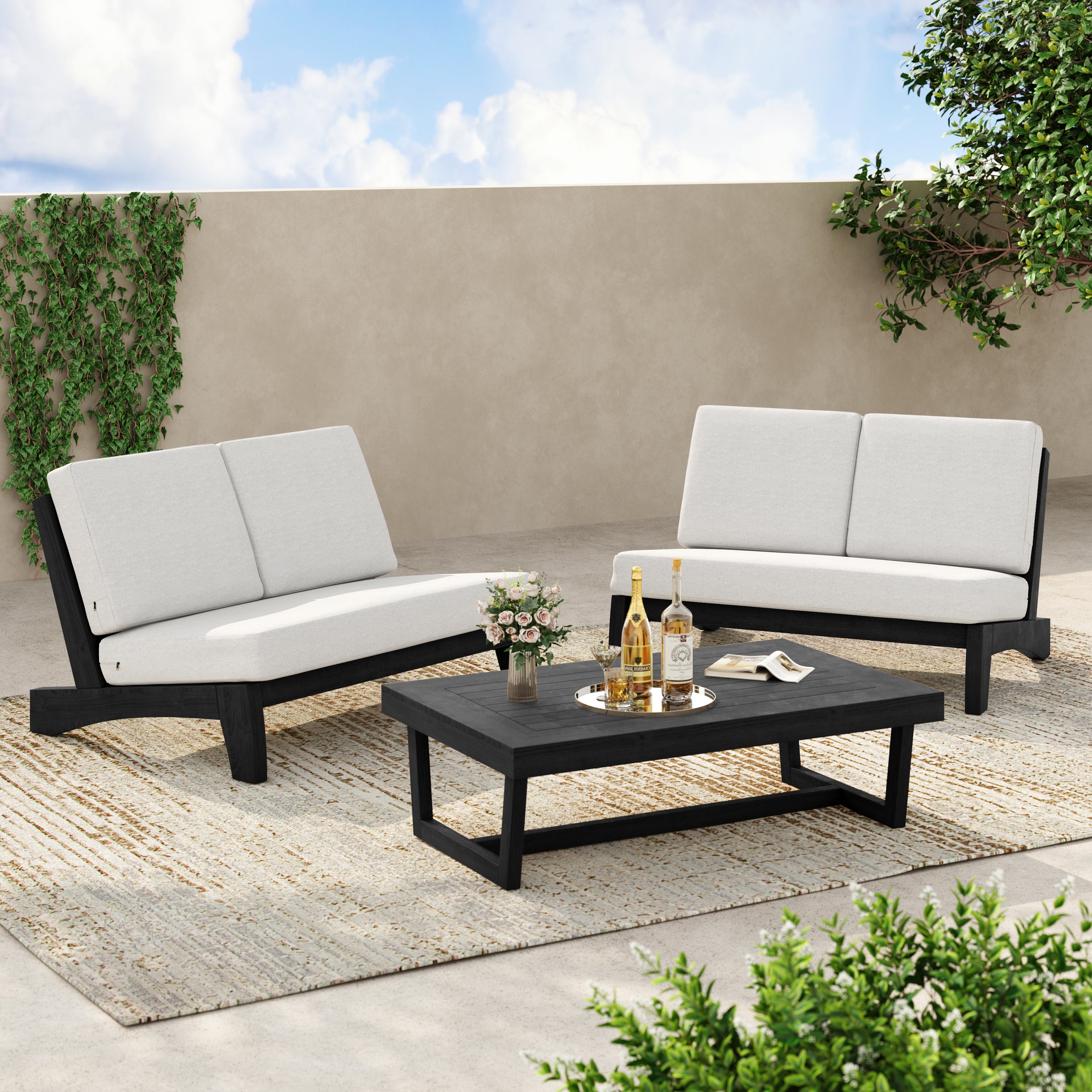 2-piece set includes a split-back loveseat plus a teak side table for daily use.