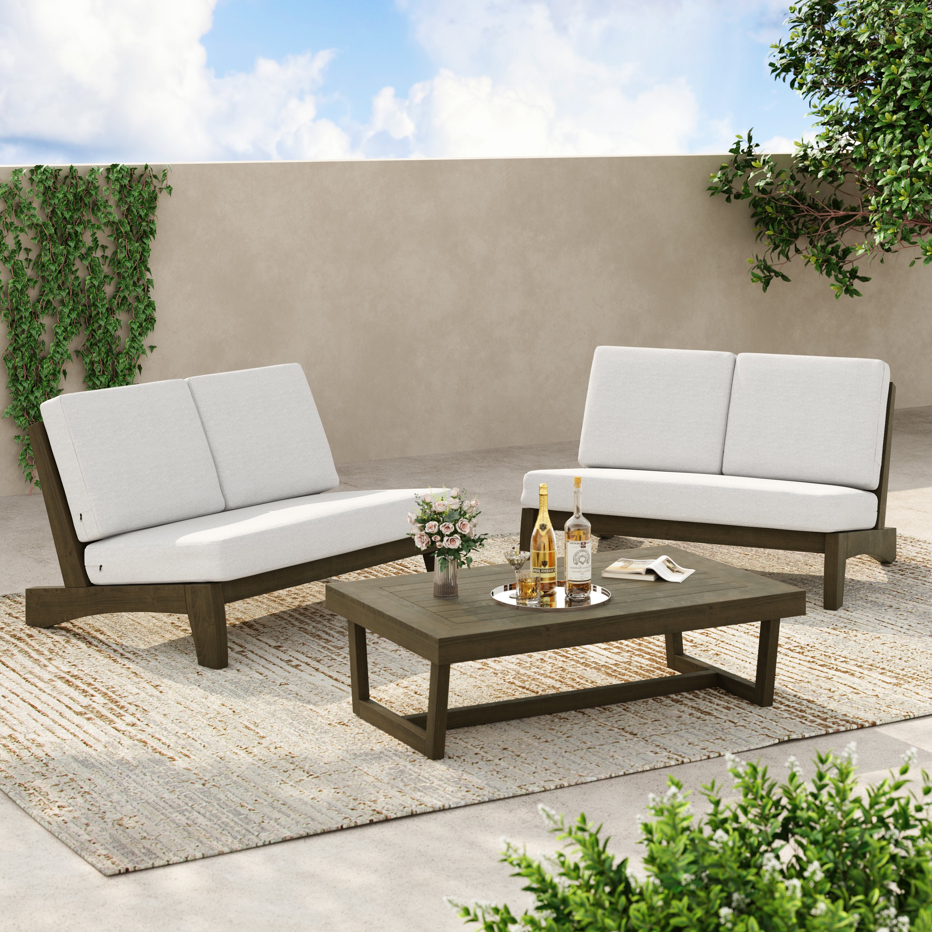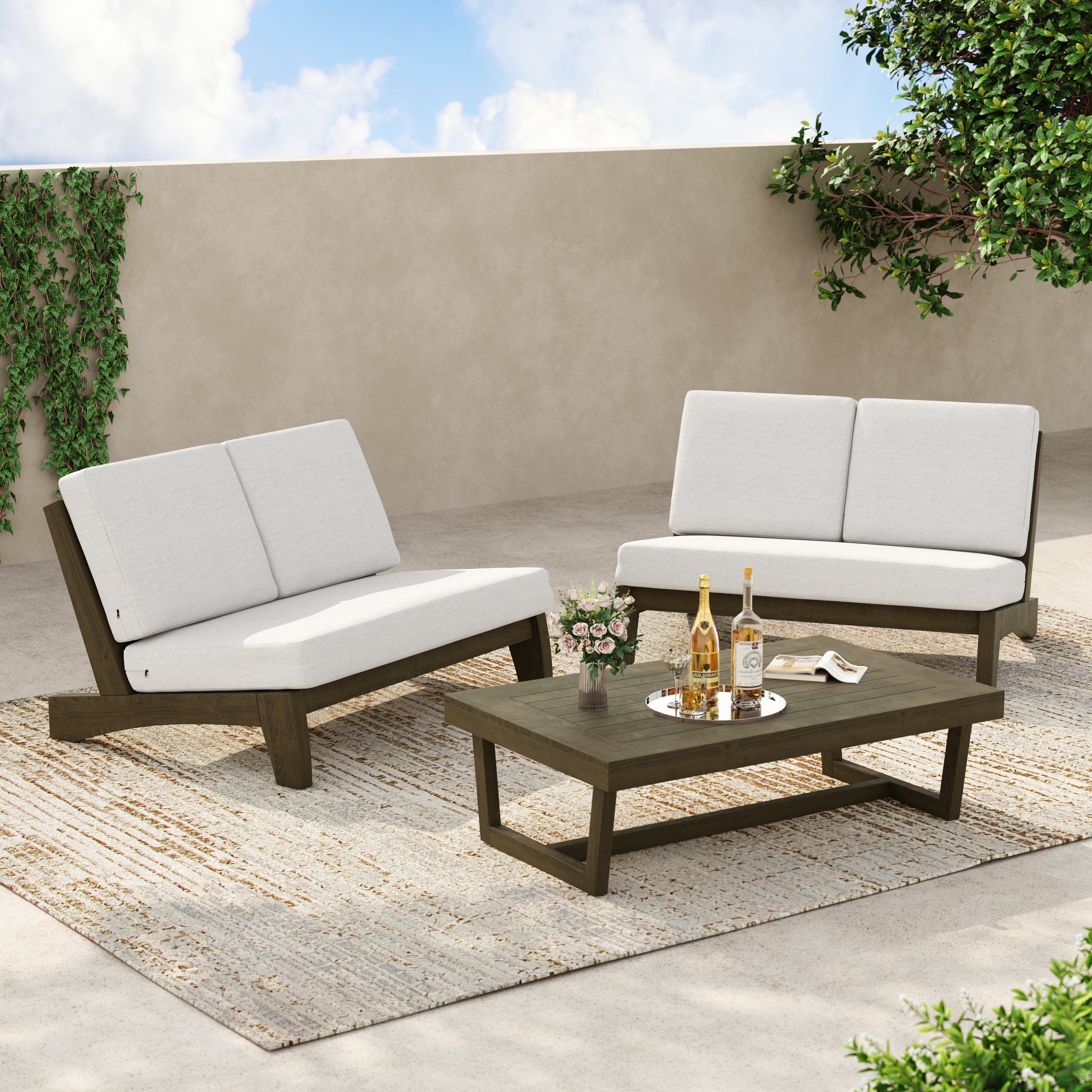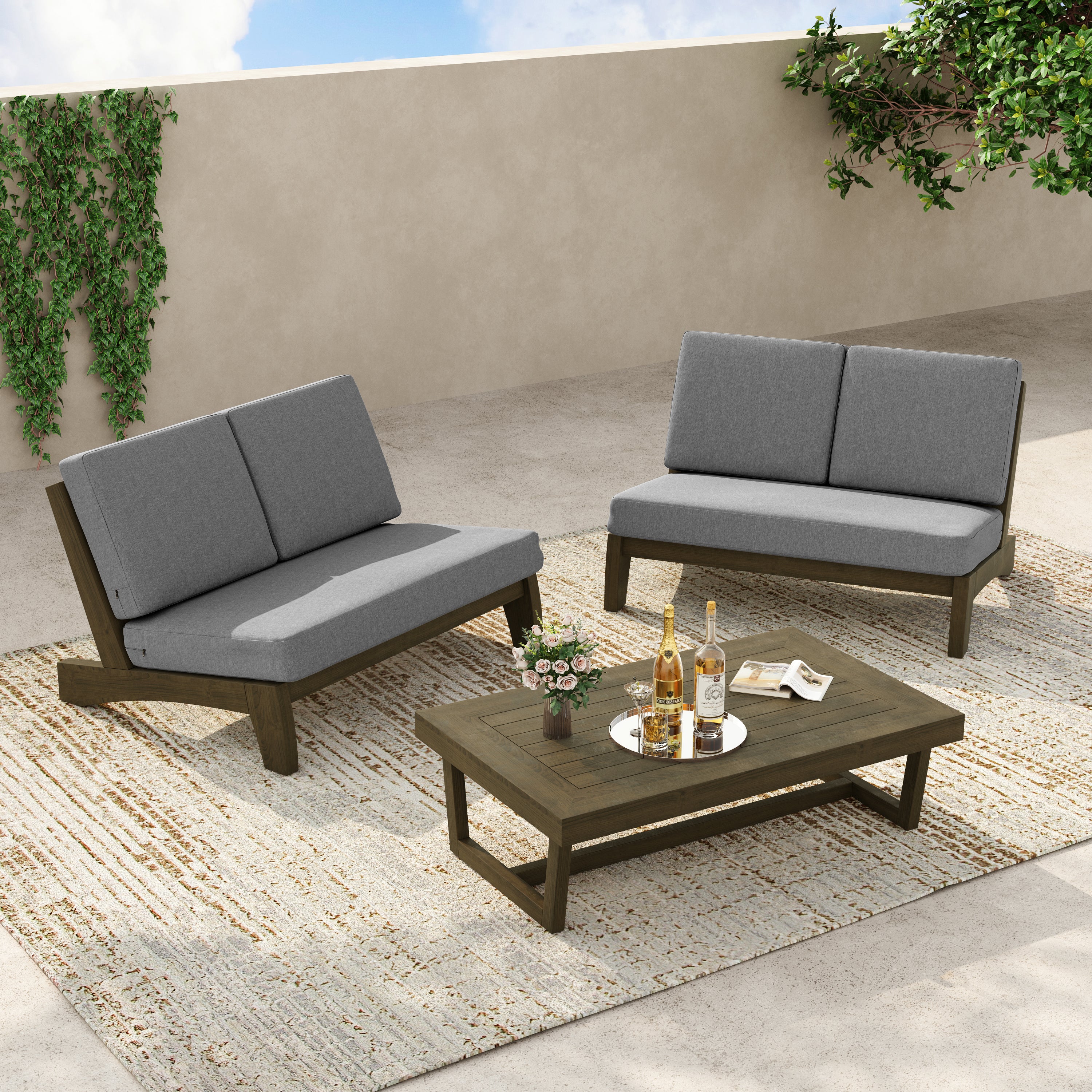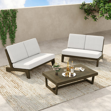 Coffee outside hits different with our Gideor 2-Piece Teak Split-Back Patio Loveseat & Side Table Set. The set pairs a split-back armless loveseat with a matching teak side table, so a mug, book, or candle always has a spot. The split-back seam adds a tailored detail while the ladder-back angle keeps the sit relaxed. Foam-padded cushions make it comfortable to linger, and spill-resistant cotton-blend upholstery helps with everyday drips. Zippered covers simplify refreshes, so the setup stays ready for slow mornings and easy evenings.