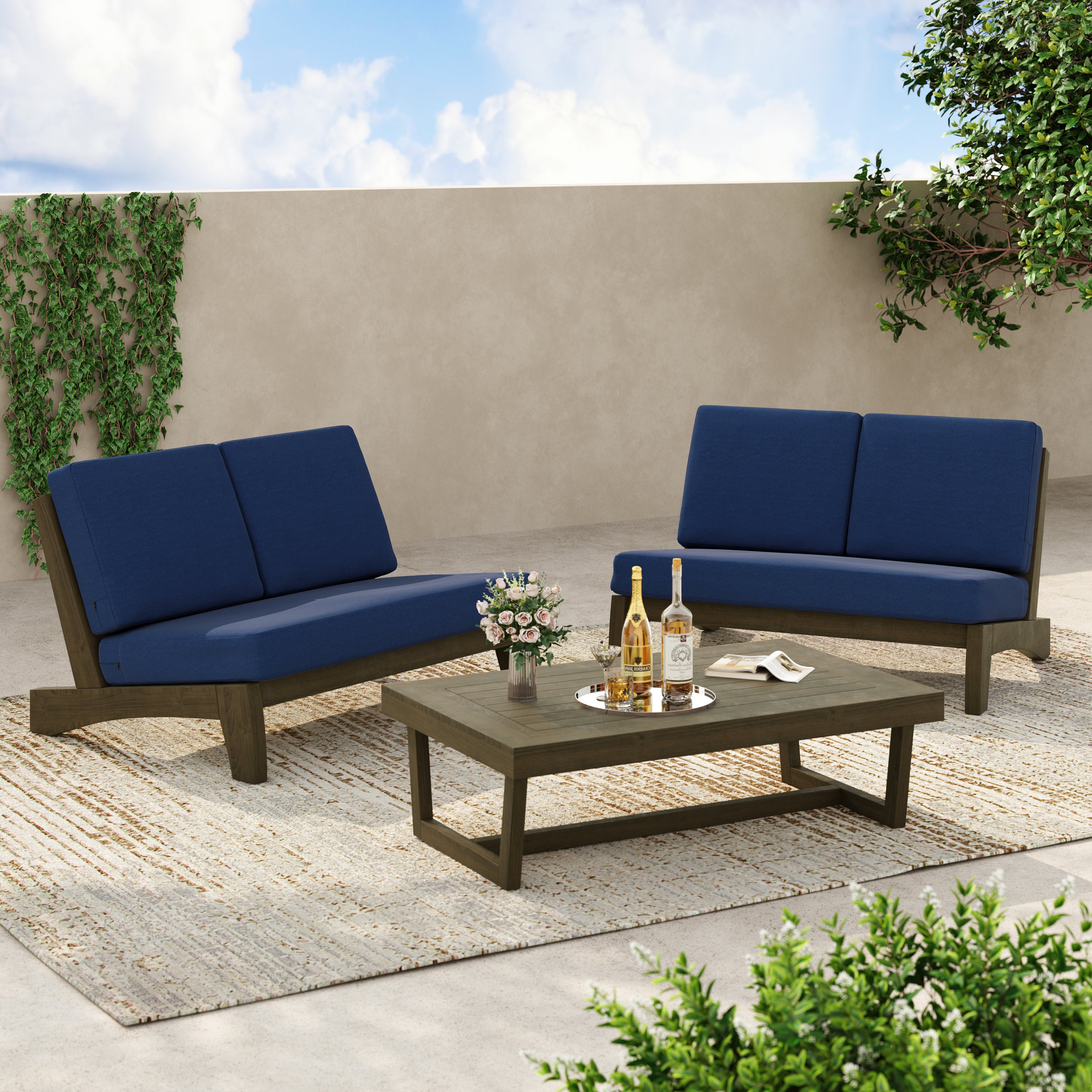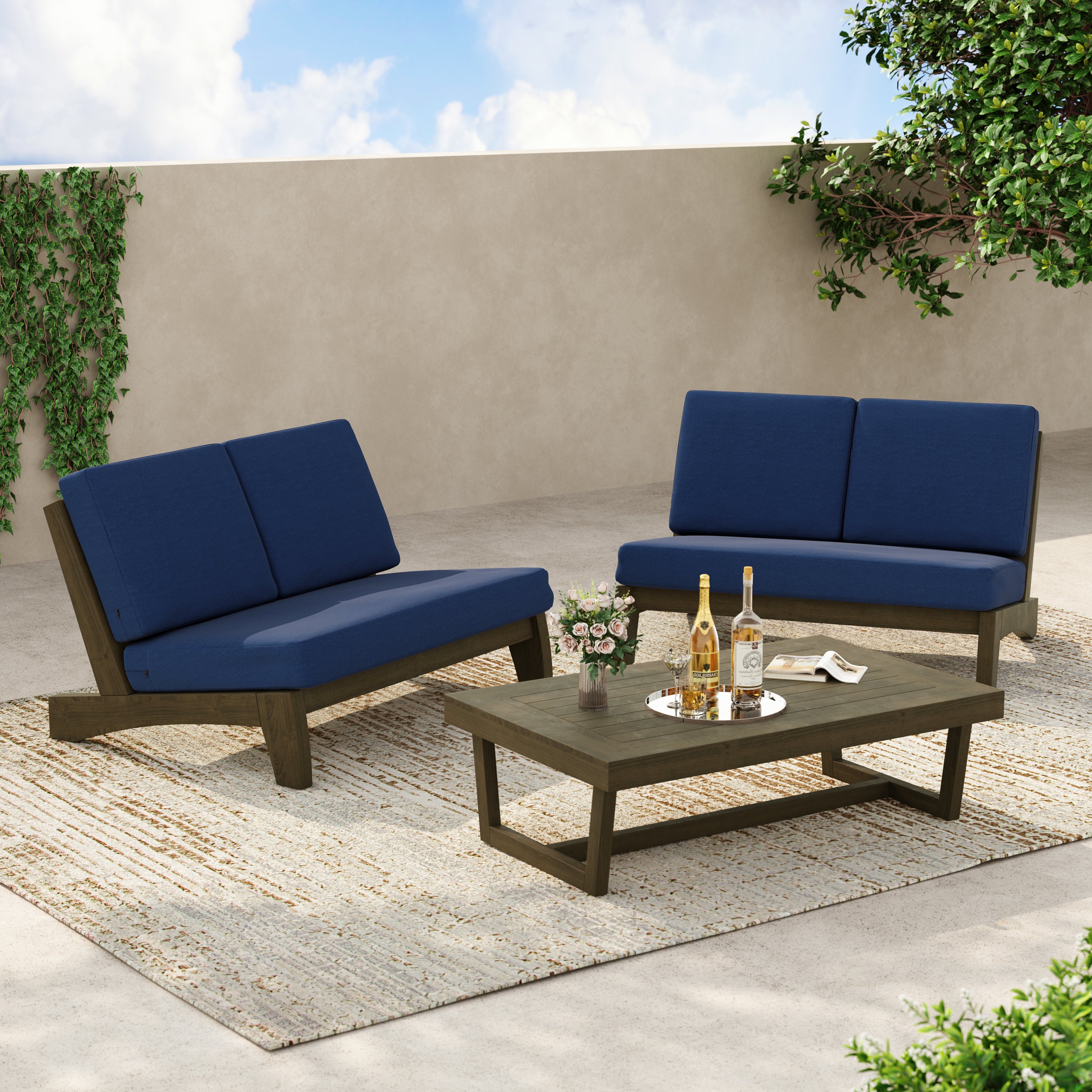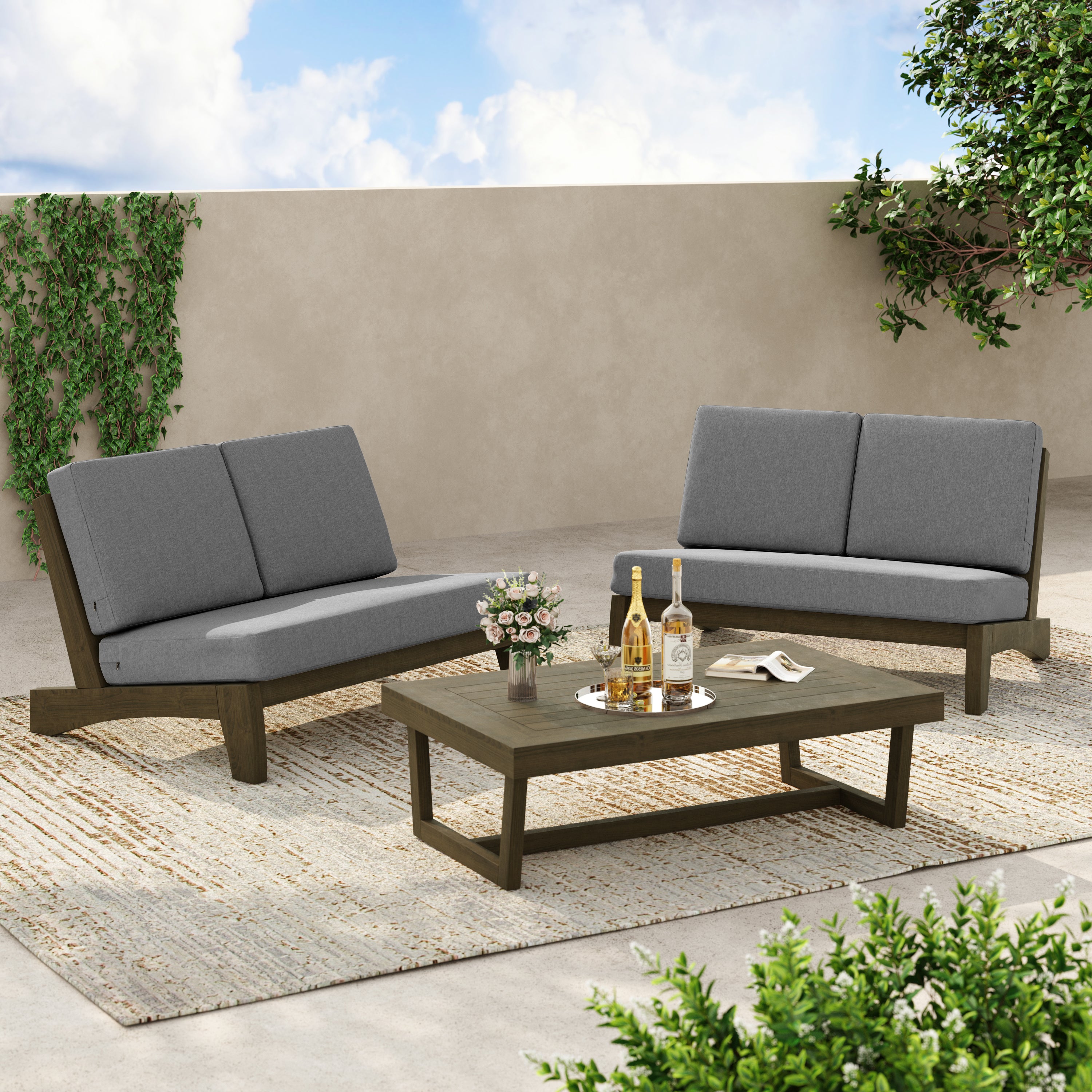 Coffee outside hits different with our Gideor 2-Piece Teak Split-Back Patio Loveseat & Side Table Set. The set pairs a split-back armless loveseat with a matching teak side table, so a mug, book, or candle always has a spot. The split-back seam adds a tailored detail while the ladder-back angle keeps the sit relaxed. Foam-padded cushions make it comfortable to linger, and spill-resistant cotton-blend upholstery helps with everyday drips. Zippered covers simplify refreshes, so the setup stays ready for slow mornings and easy evenings.