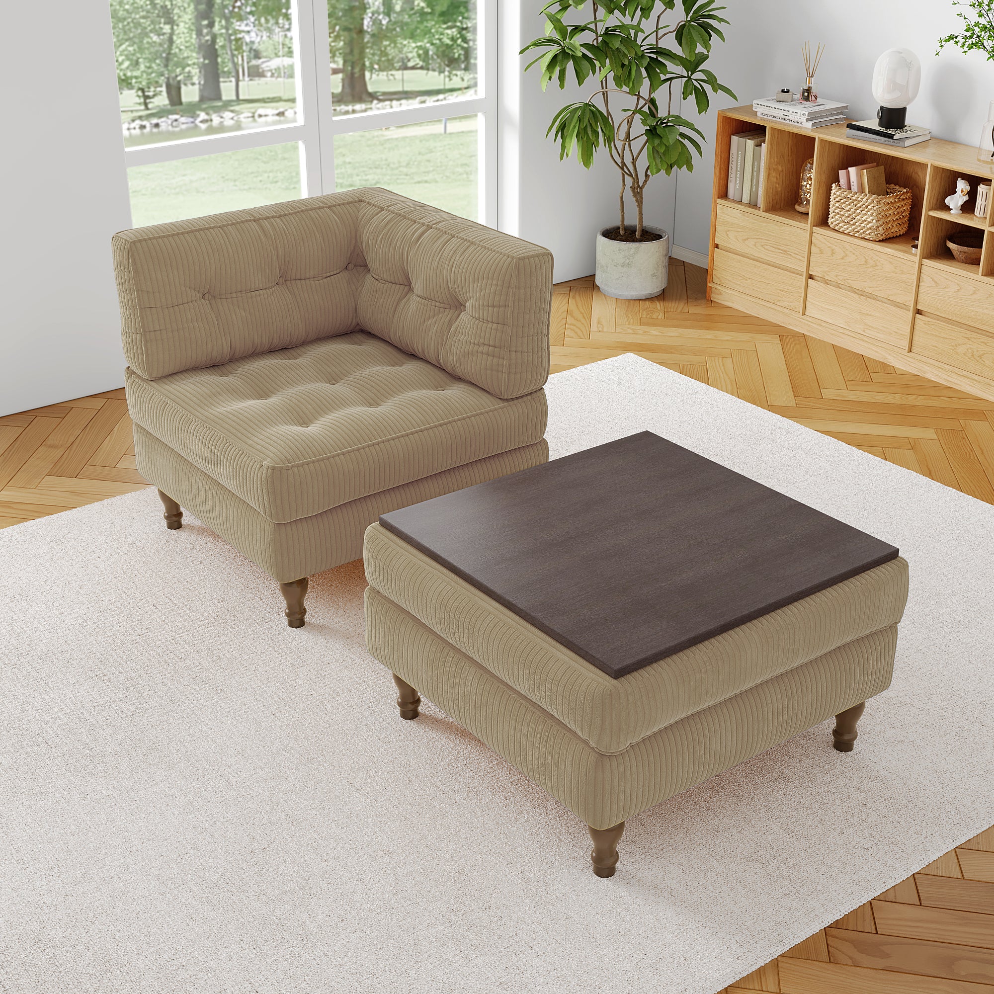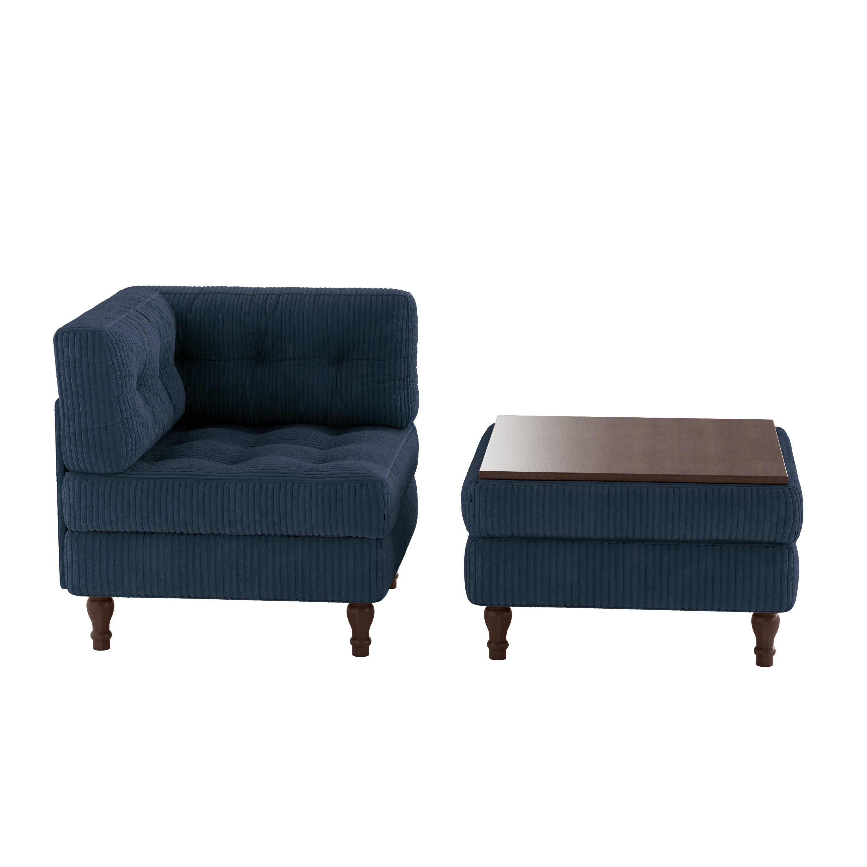 Stretch the afternoon into comfort with our Elico Button Tufted Corduroy Chaise Lounge with Ottoman. The single-arm corner chair joins a roomy ottoman to form an easy, chaise-style sprawl. Tactile corduroy upholstery and neat piping frame button-tufted cushions with relaxed, tailored character. Flip the ottoman lid to a smooth wood tabletop, with hidden storage ready for blankets. Explore more Elico modules on our other pages to mix and match layouts as your needs change.