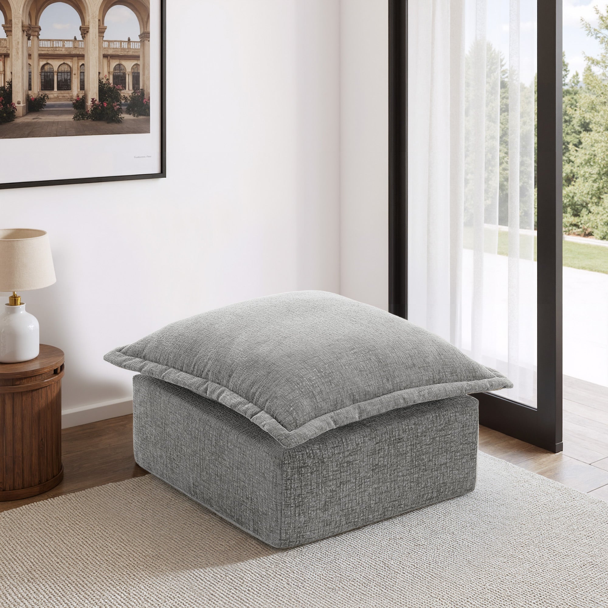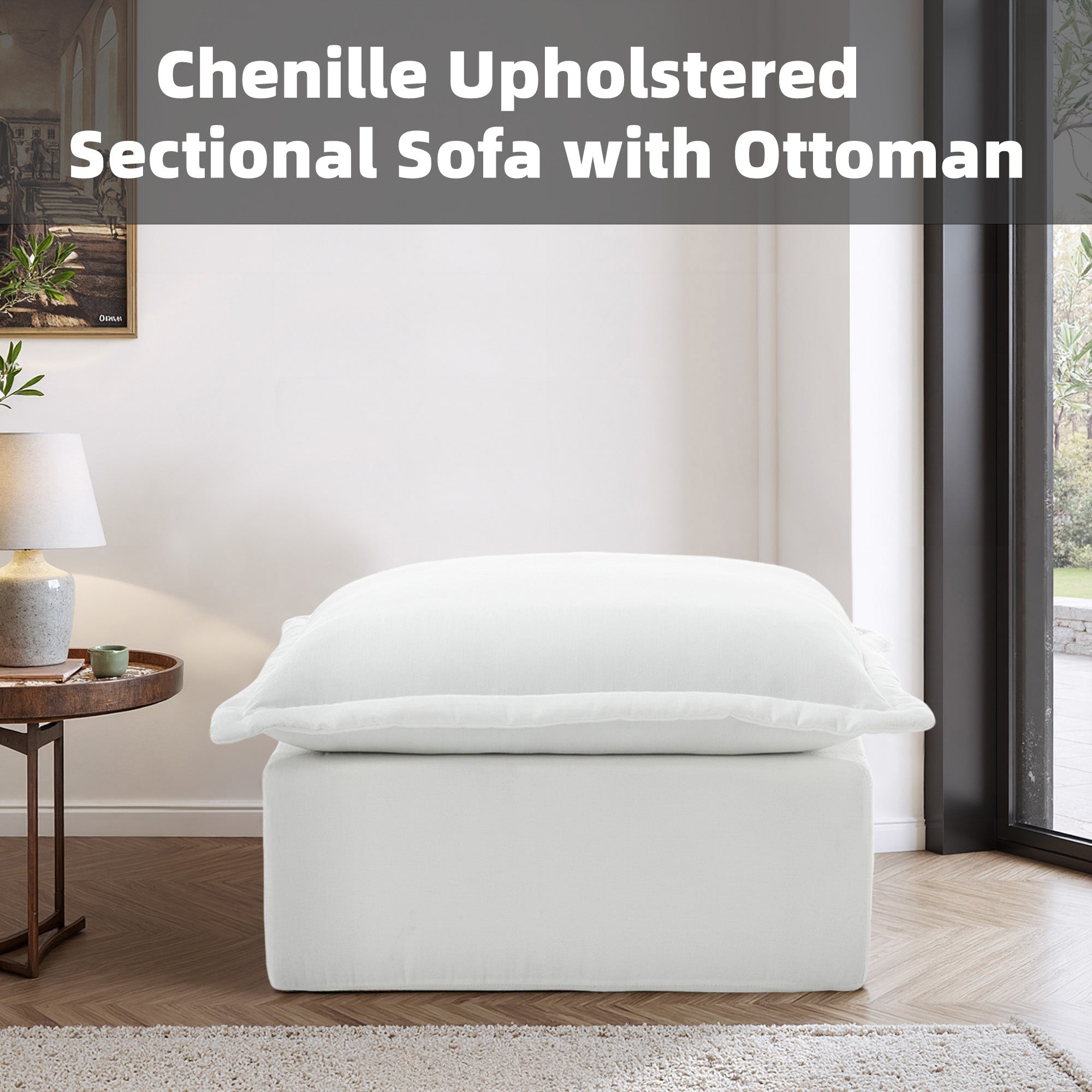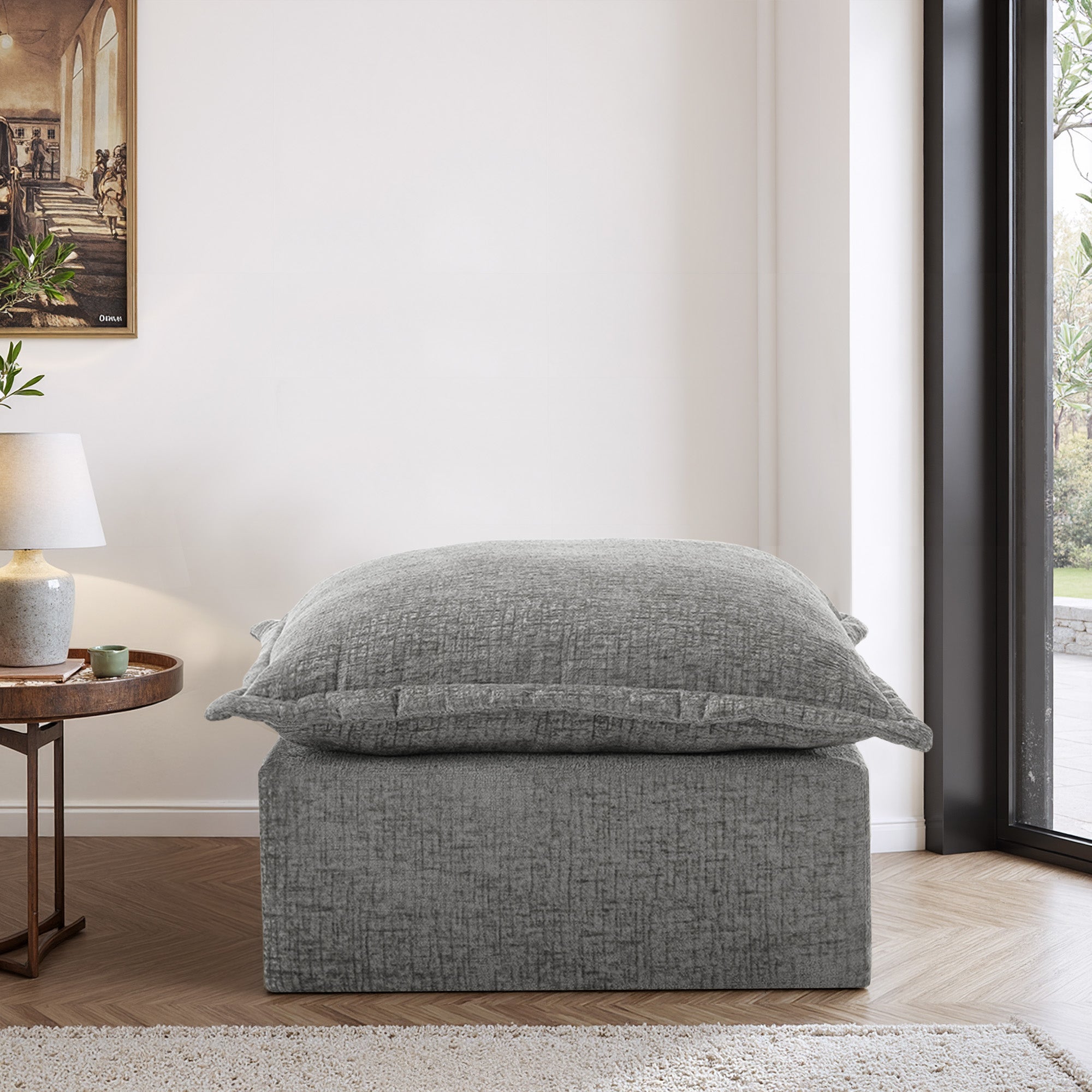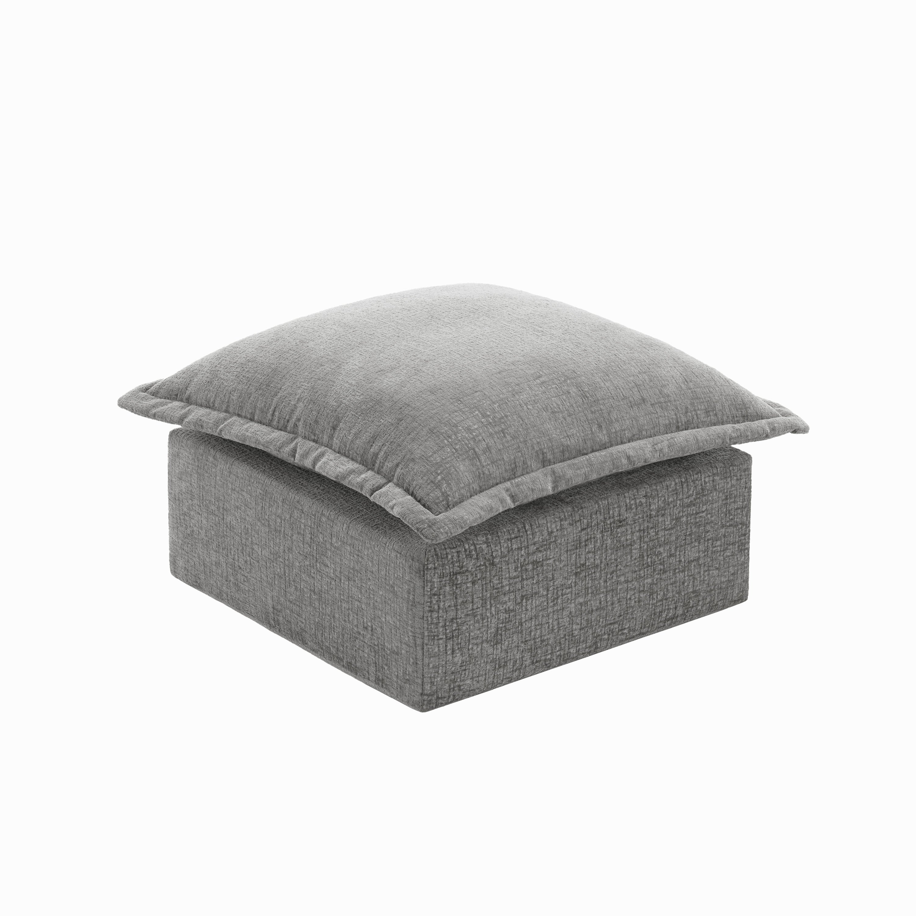 Let your heels, toes, and worries settle on our Faunus Rectangular Pillow Top Chenille Upholstered Ottoman. A roomy pillow-top seat brings gentle softness wrapped in warm, skin-friendly chenille for everyday comfort. Thick foam padding supports tired feet or occasional seating without losing its cushioned feel. The low, legless profile forms a steady boxy shape that stays stable in any room. An anti-slip bottom and Velcro cloth connectors help it stay put, and you can explore other Faunus modules to build the layout that suits your home.