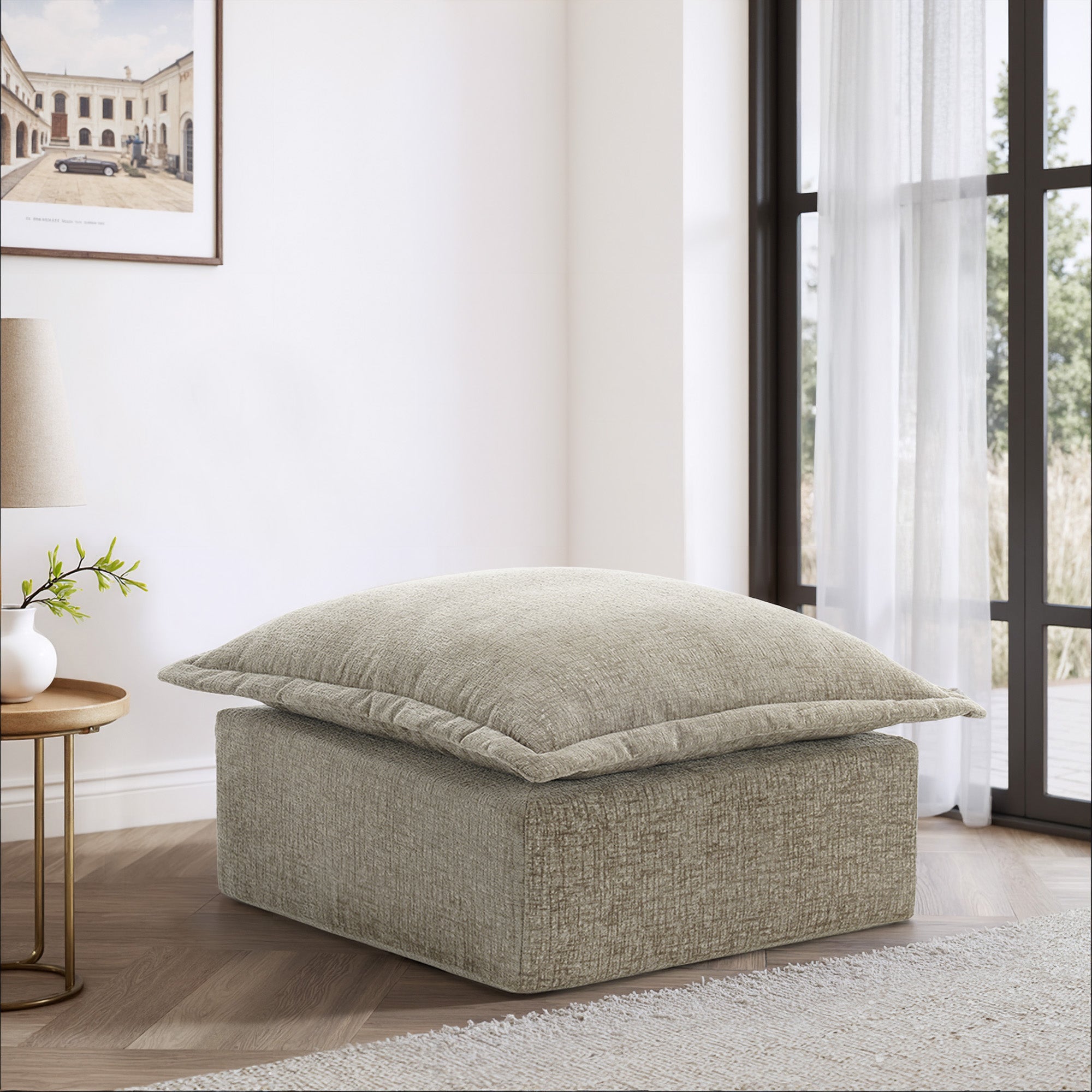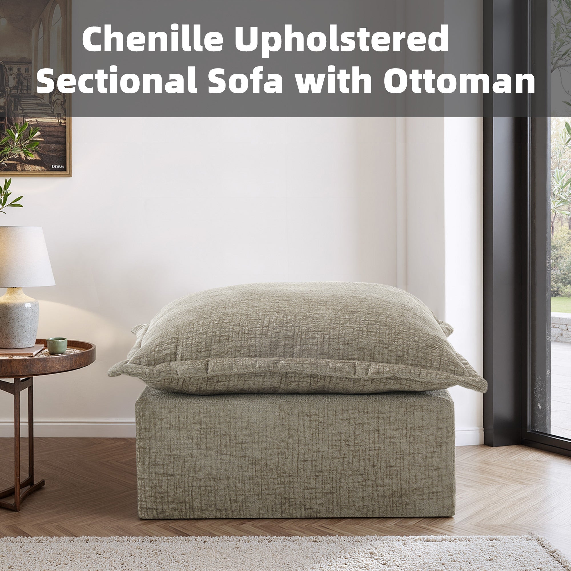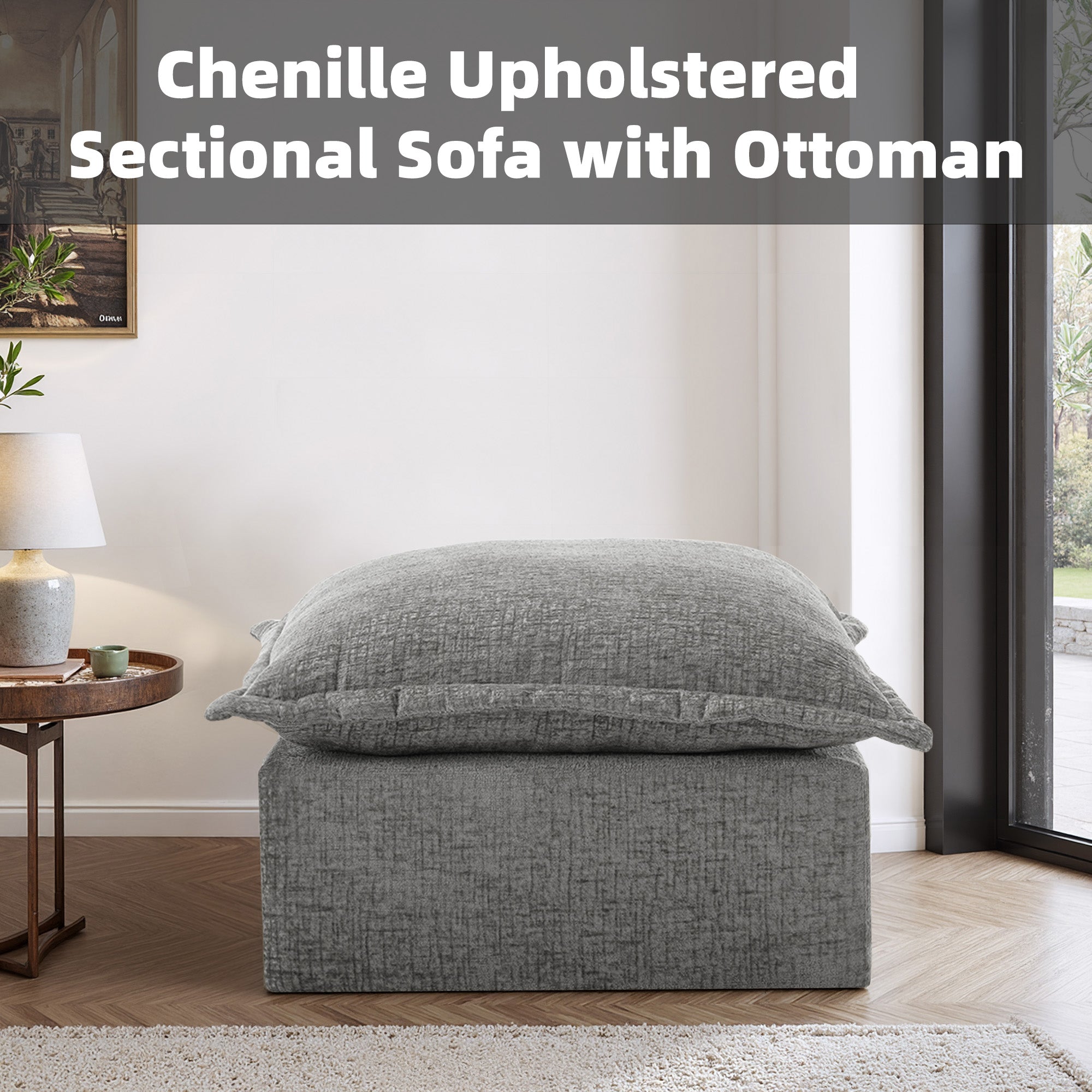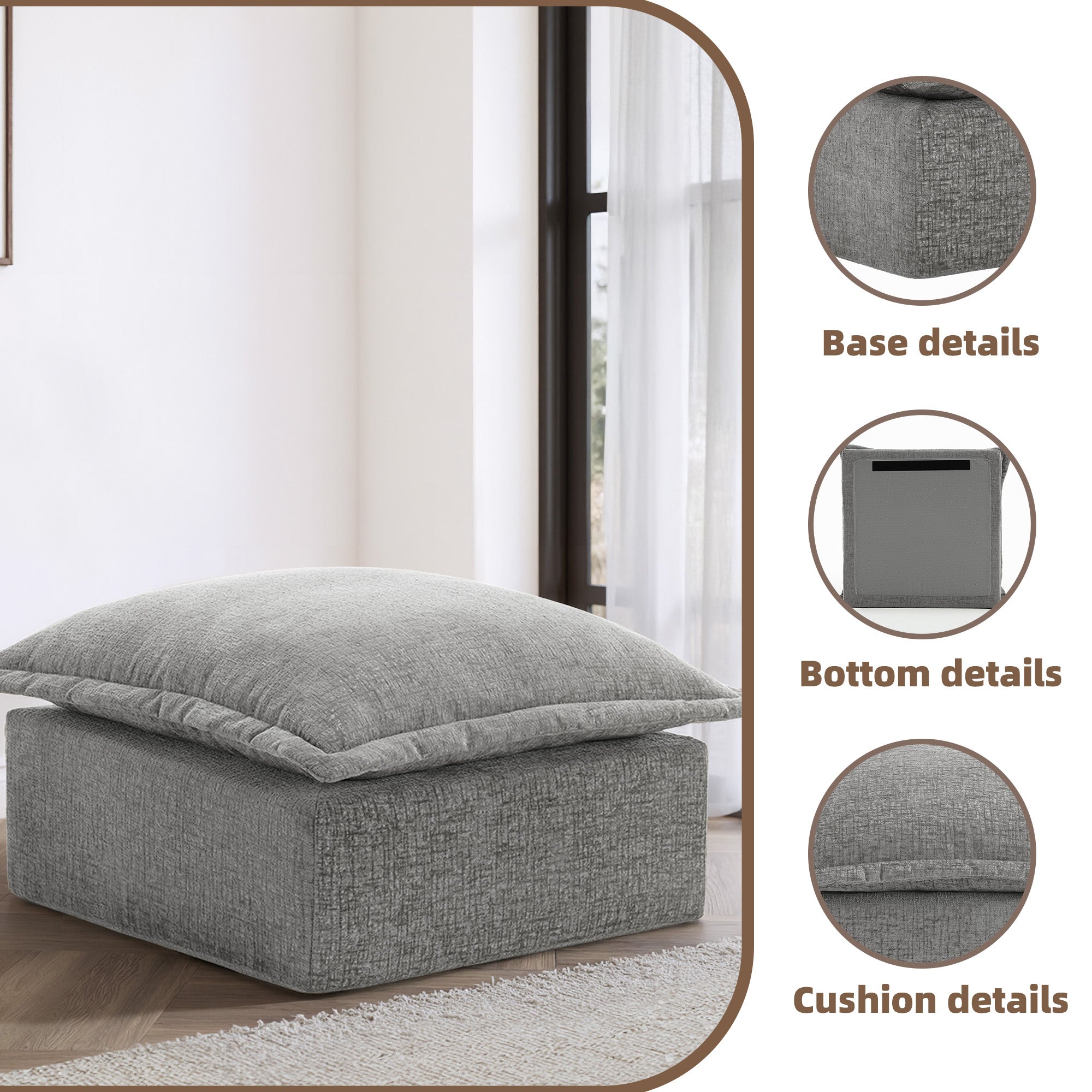 Let your heels, toes, and worries settle on our Faunus Rectangular Pillow Top Chenille Upholstered Ottoman. A roomy pillow-top seat brings gentle softness wrapped in warm, skin-friendly chenille for everyday comfort. Thick foam padding supports tired feet or occasional seating without losing its cushioned feel. The low, legless profile forms a steady boxy shape that stays stable in any room. An anti-slip bottom and Velcro cloth connectors help it stay put, and you can explore other Faunus modules to build the layout that suits your home.