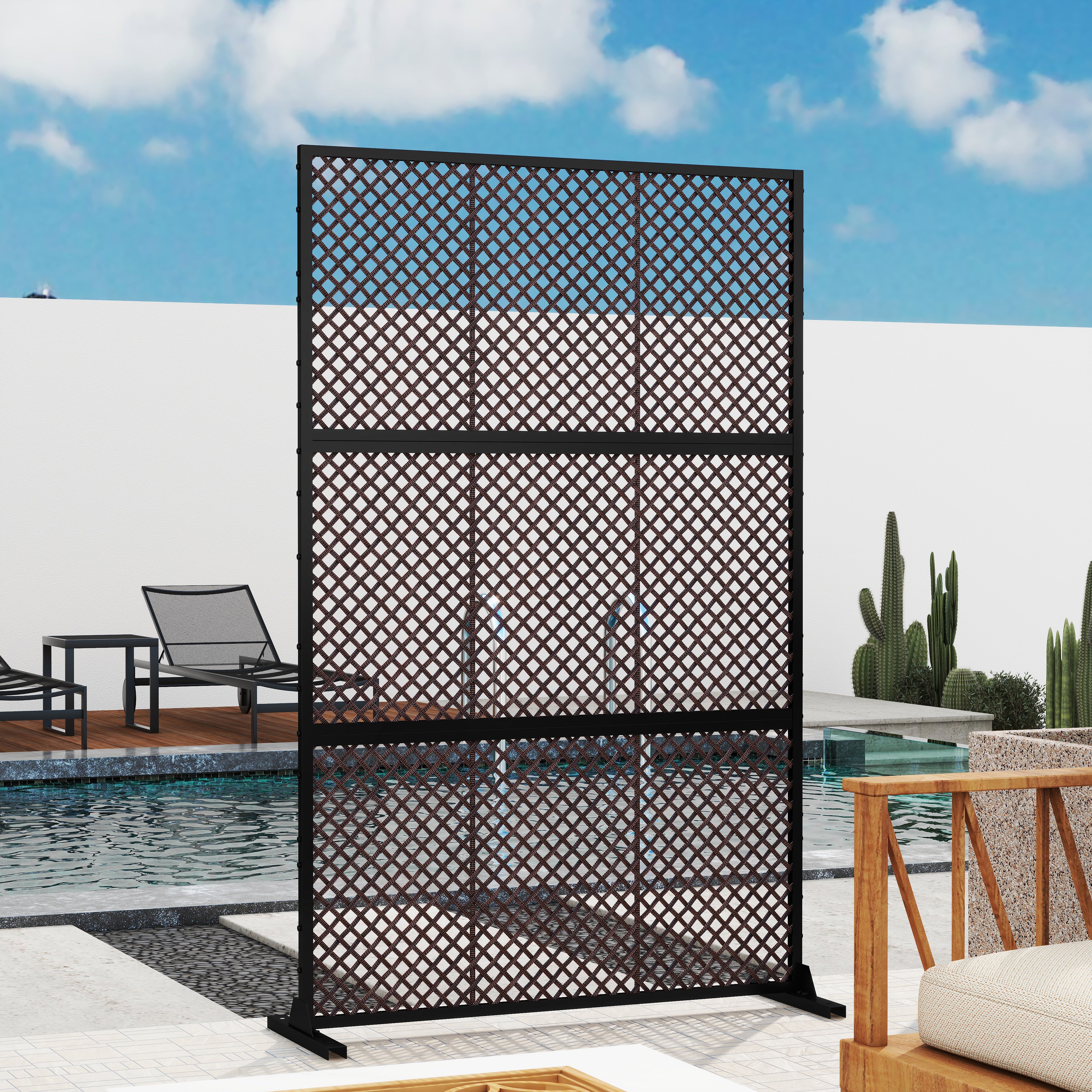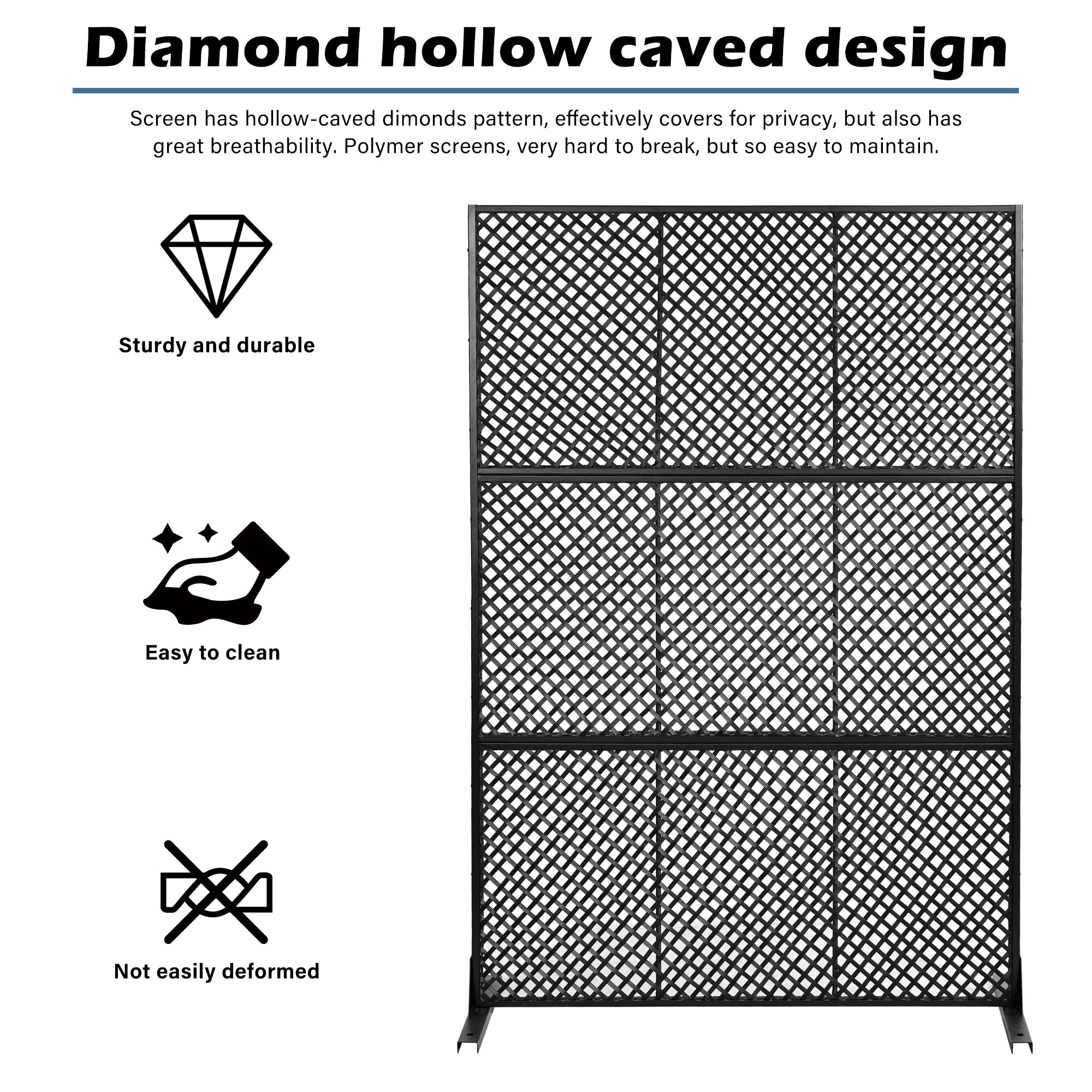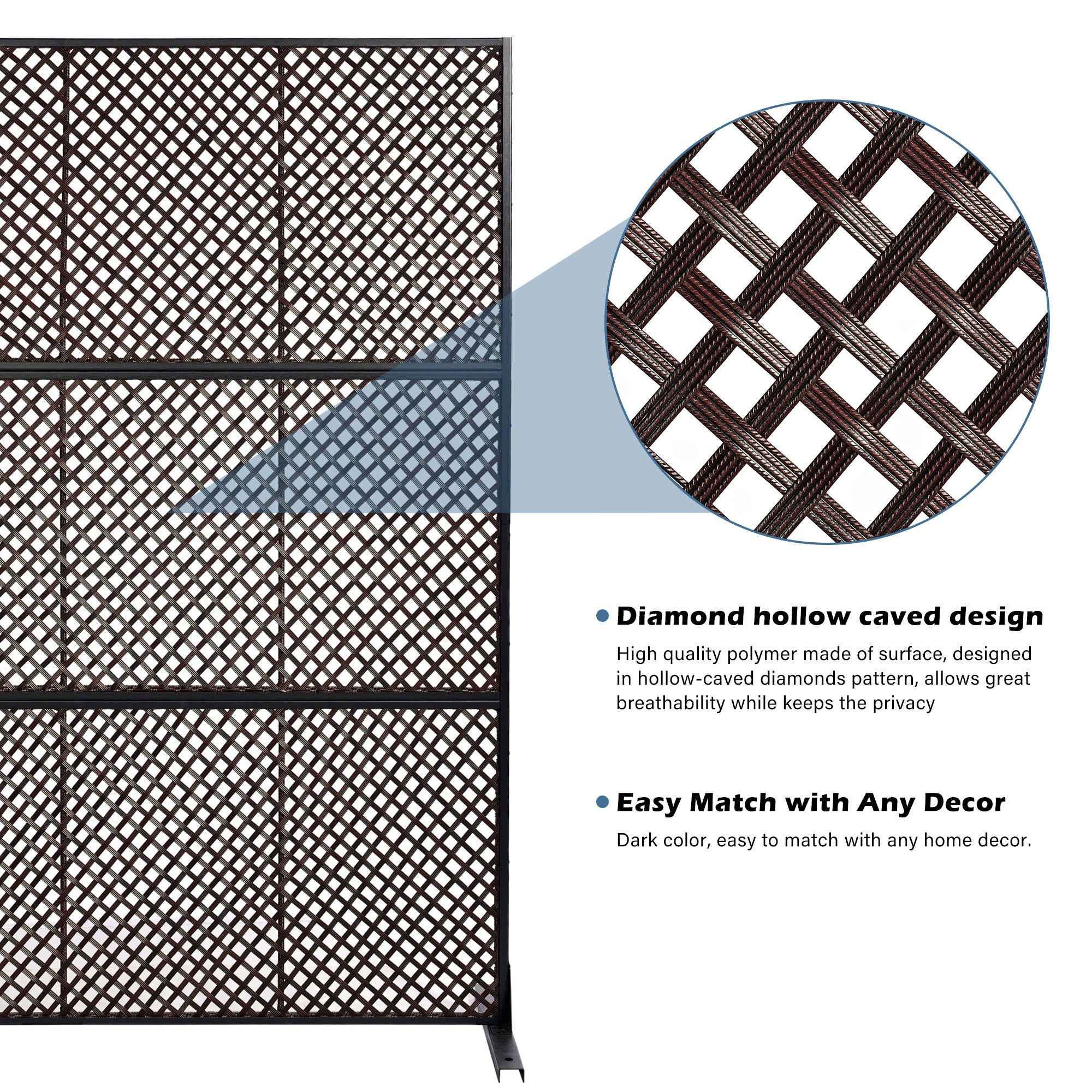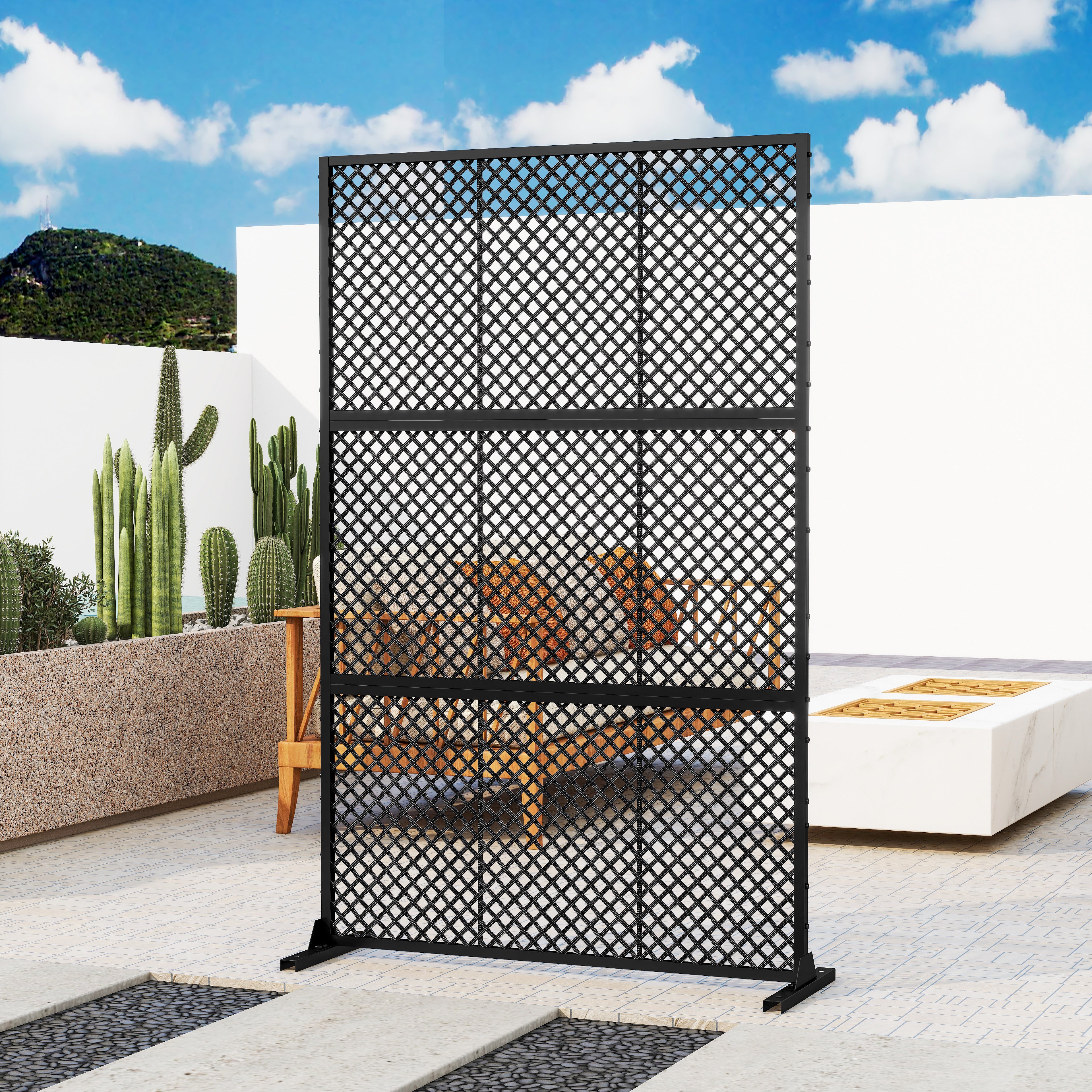 Shape a more private, still open-air corner for your patio with our Catol 6 ft H x 4 ft W Woven Lattice Outdoor Privacy Screen. Three tall panels are filled with a geometric lattice of small diamond cutouts, giving you a refined pattern that softens views without fully blocking light or breezes. A slim black metal frame and sturdy feet help the screen stand steady along decks, balconies, and garden seating areas. You can remove one or two panels to fit shorter runs or different ground conditions. With durable plastic lattice that wipes clean, this outdoor privacy screen works as both a room divider and a modern outdoor backdrop.