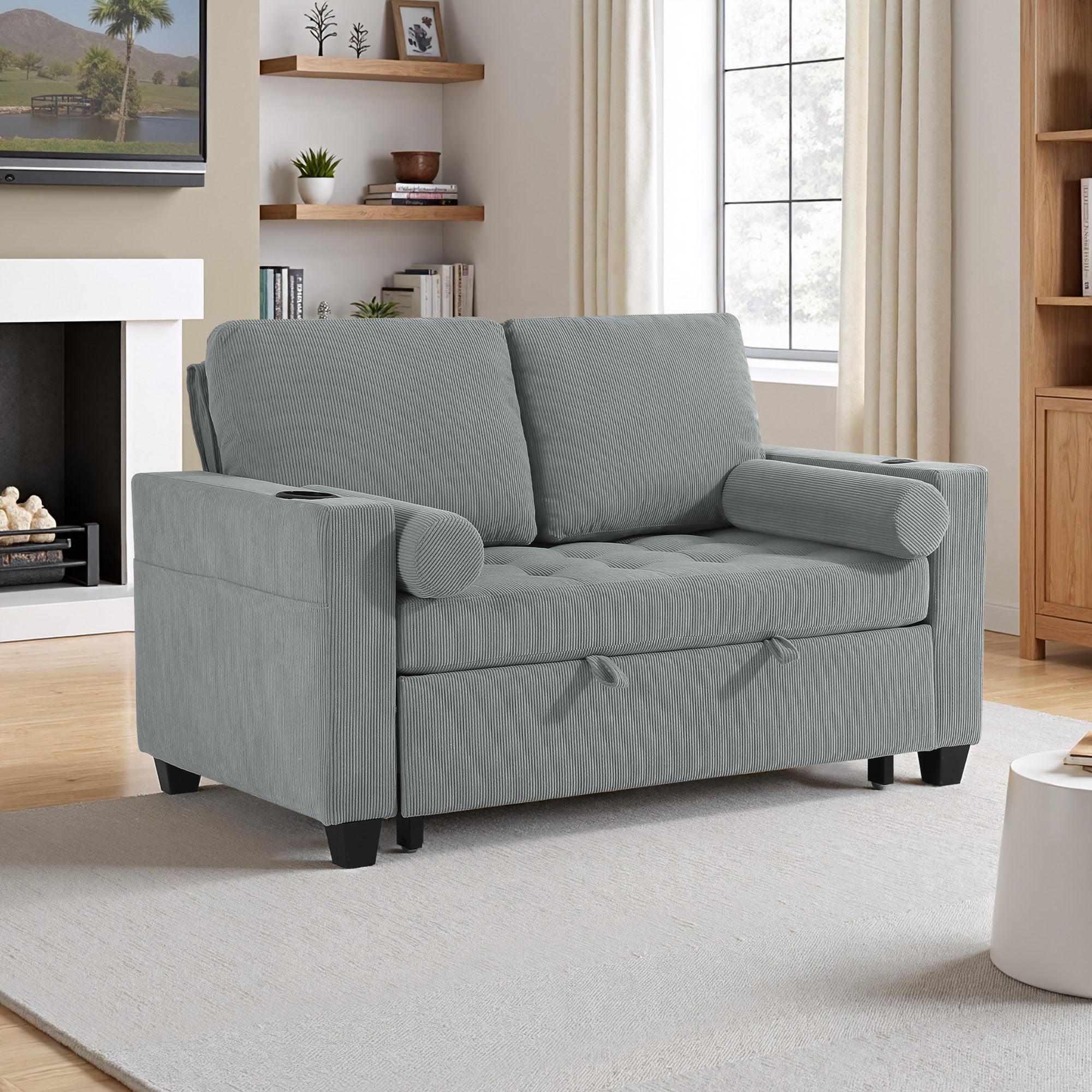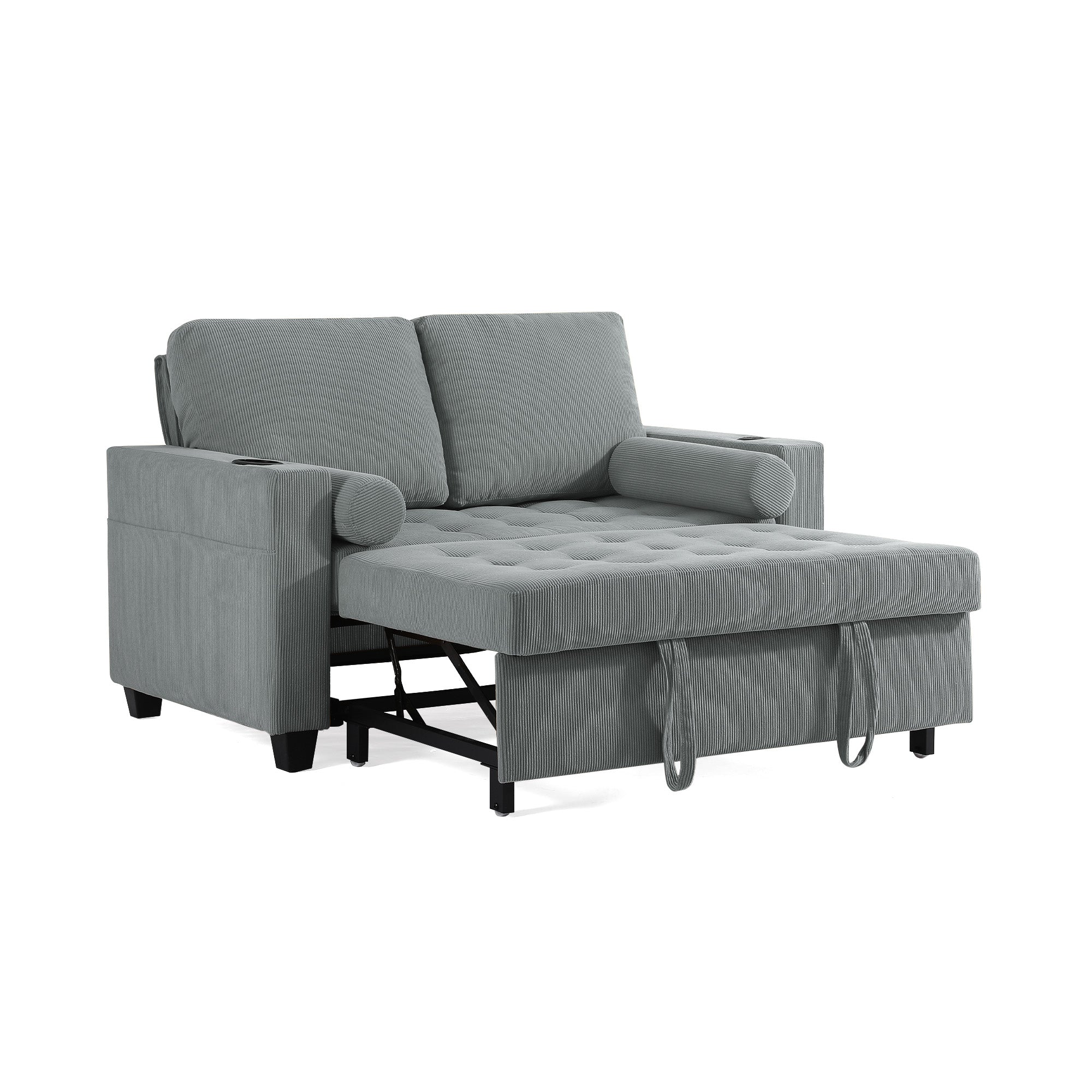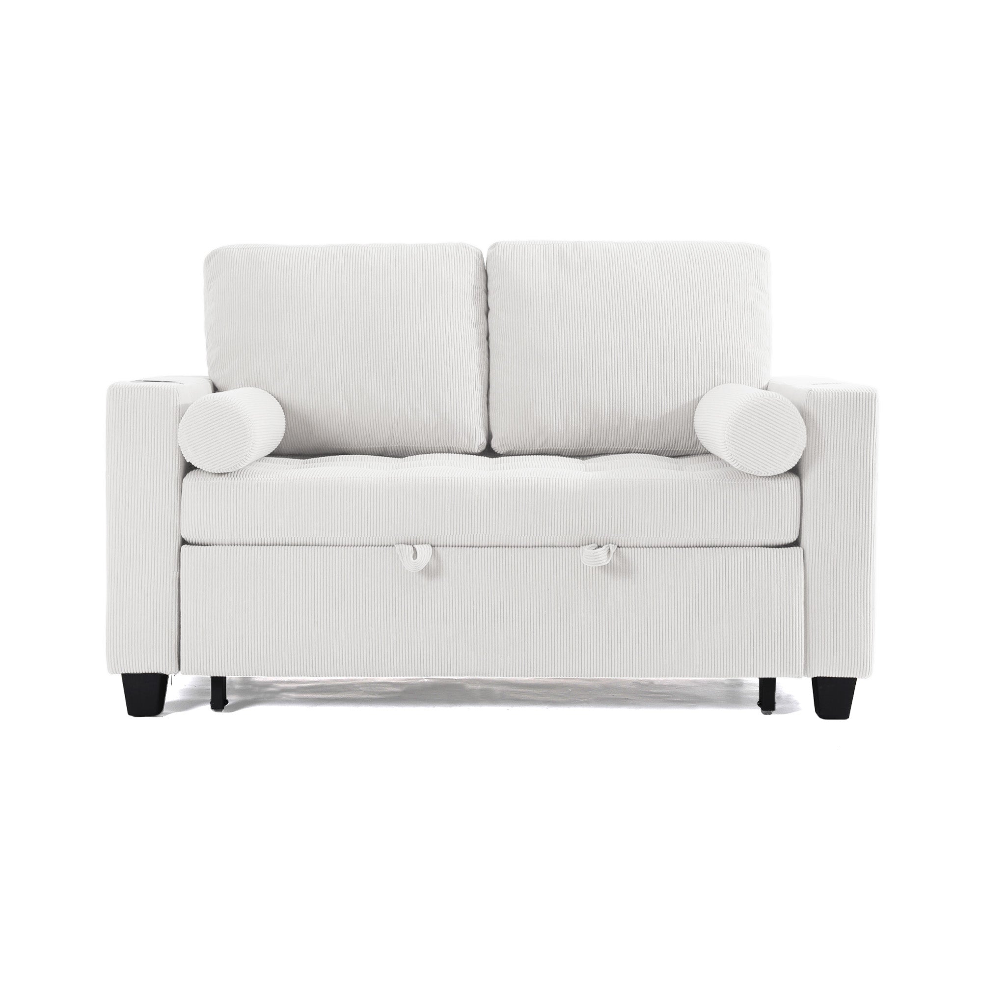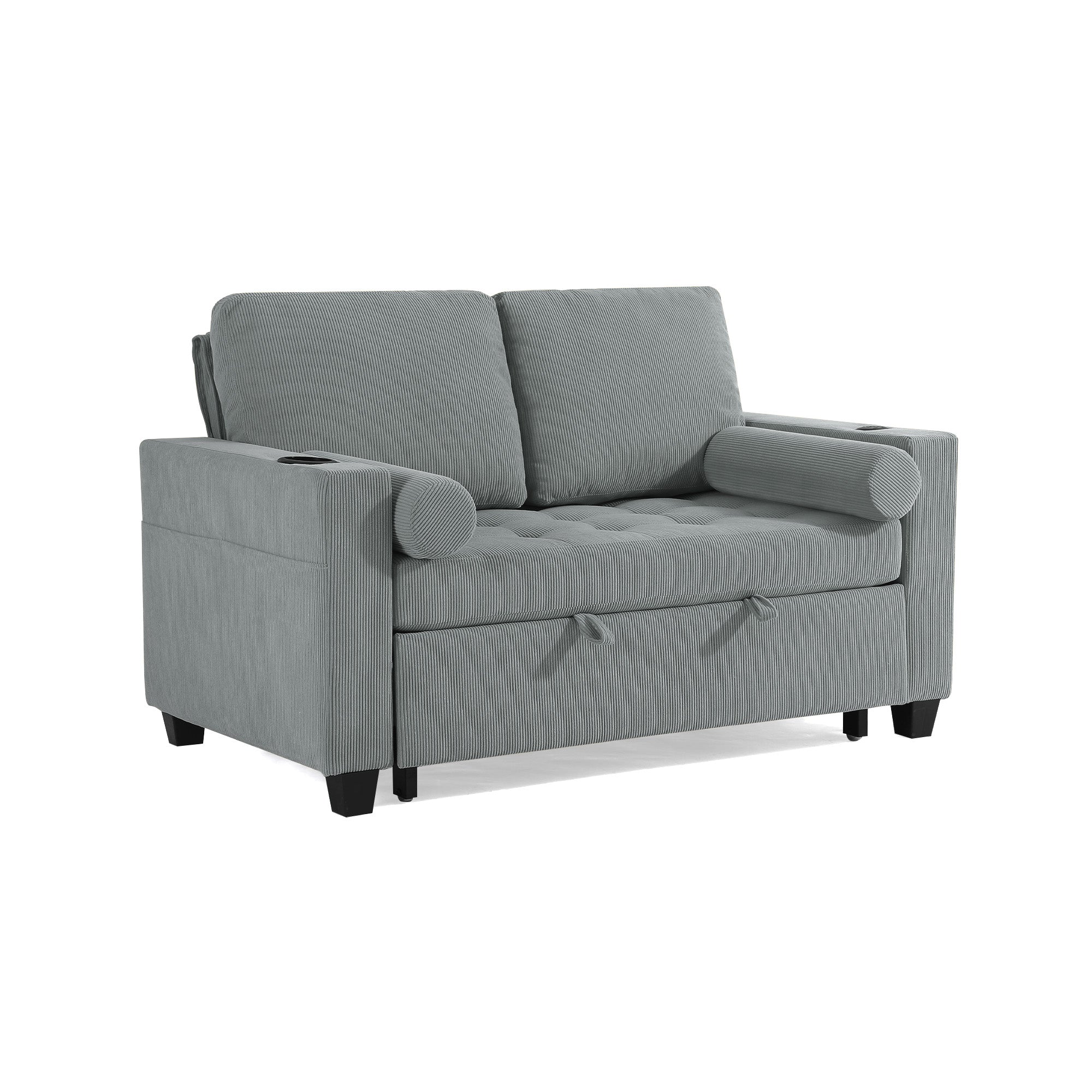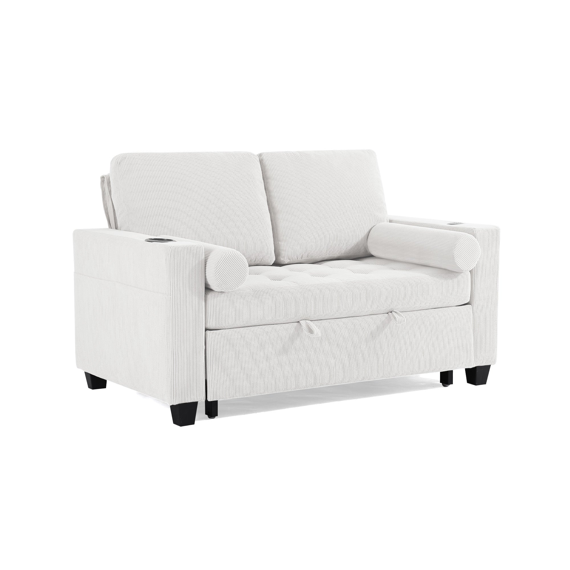 Let one loveseat handle movie nights, nap breaks, and sleepovers with our Cirum Tufted Convertible Pull-Out Sleeper Bed Loveseat. Use it as a cozy two-seat loveseat for everyday lounging, tip the 3-position back to stretch into a chaise, or pull the front platform out and lift it into a flat sleeper when guests stay. Tufted corduroy across the seat and pull-out section adds soft texture and helps cushions keep their shape. A roomy cup holder in one armrest keeps coffee, water, or a nightcap close by, while the other arm tucks in USB and Type-C charging ports so your devices stay topped up. A generous side storage pocket holds remotes, books, and chargers, turning this compact loveseat into a small-space hub for relaxing, scrolling, and settling in for the night.