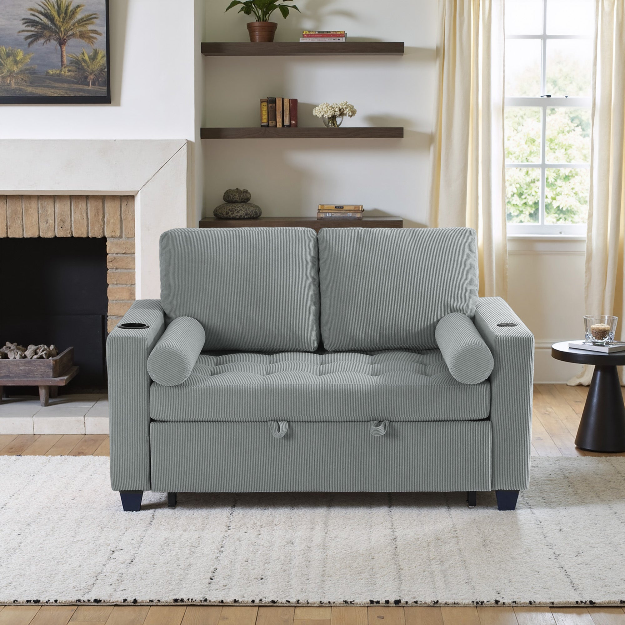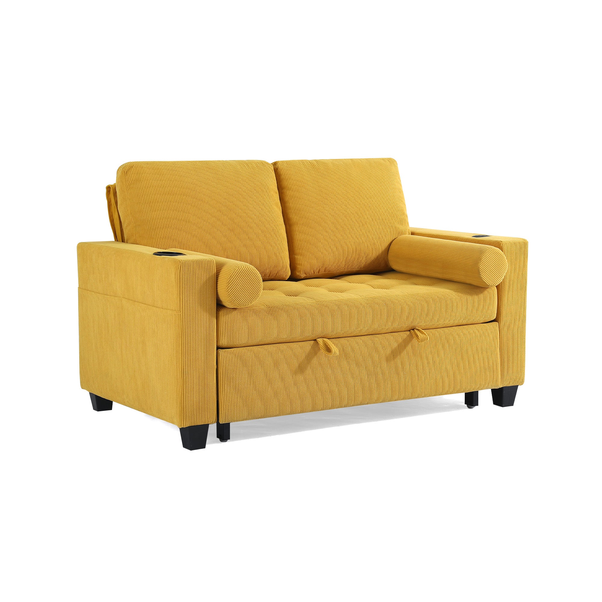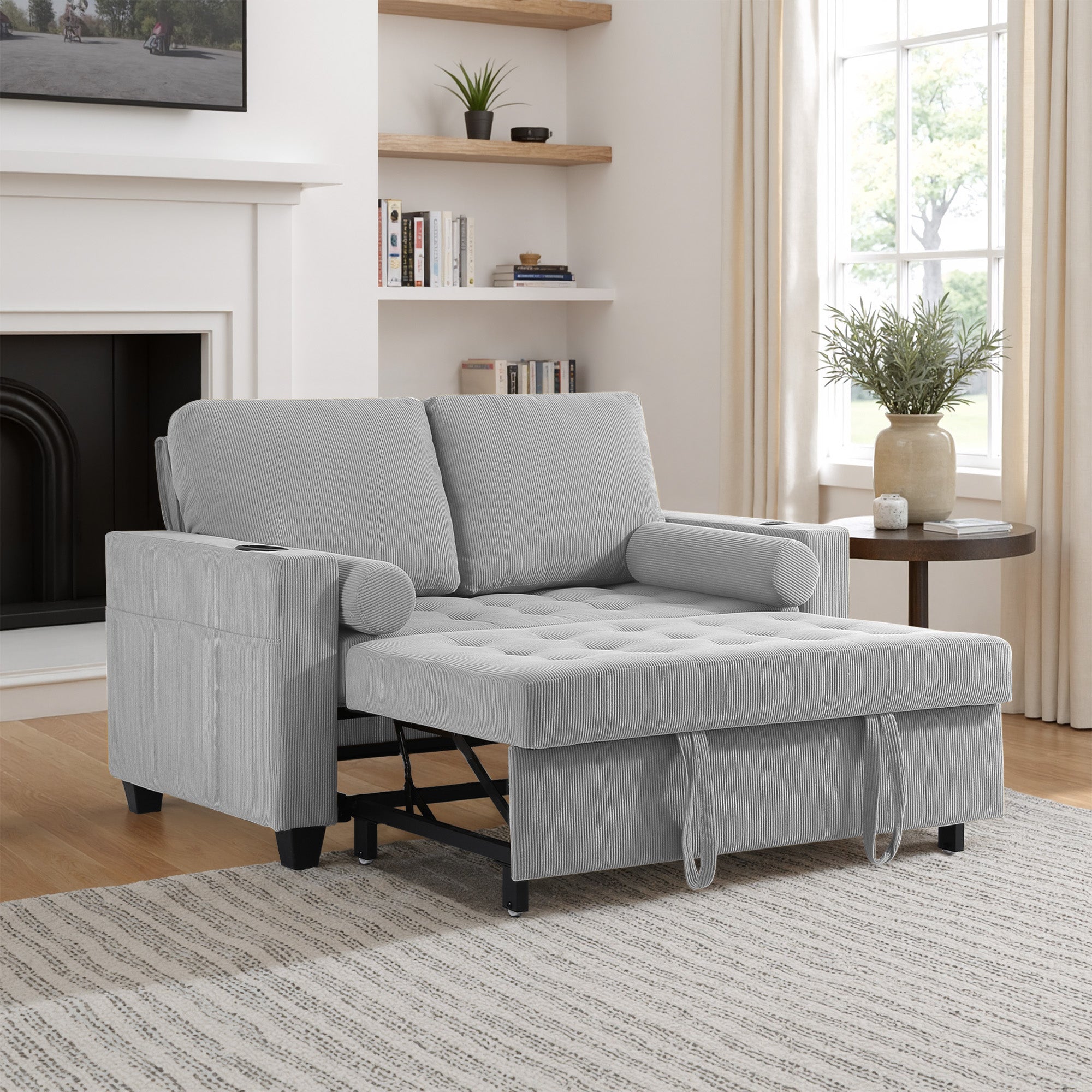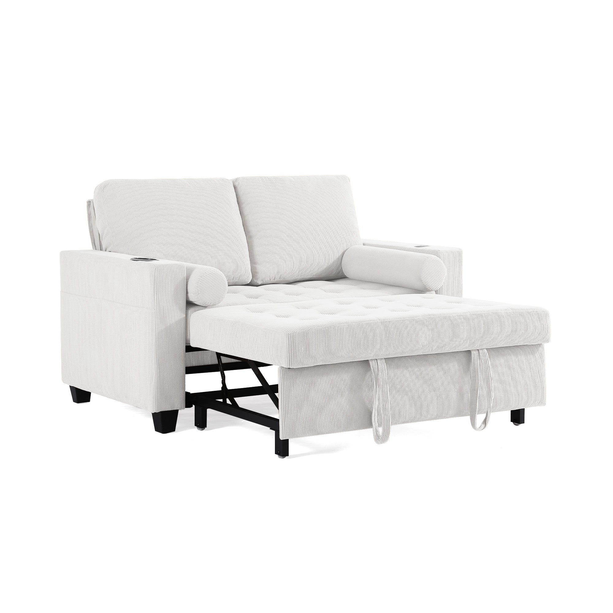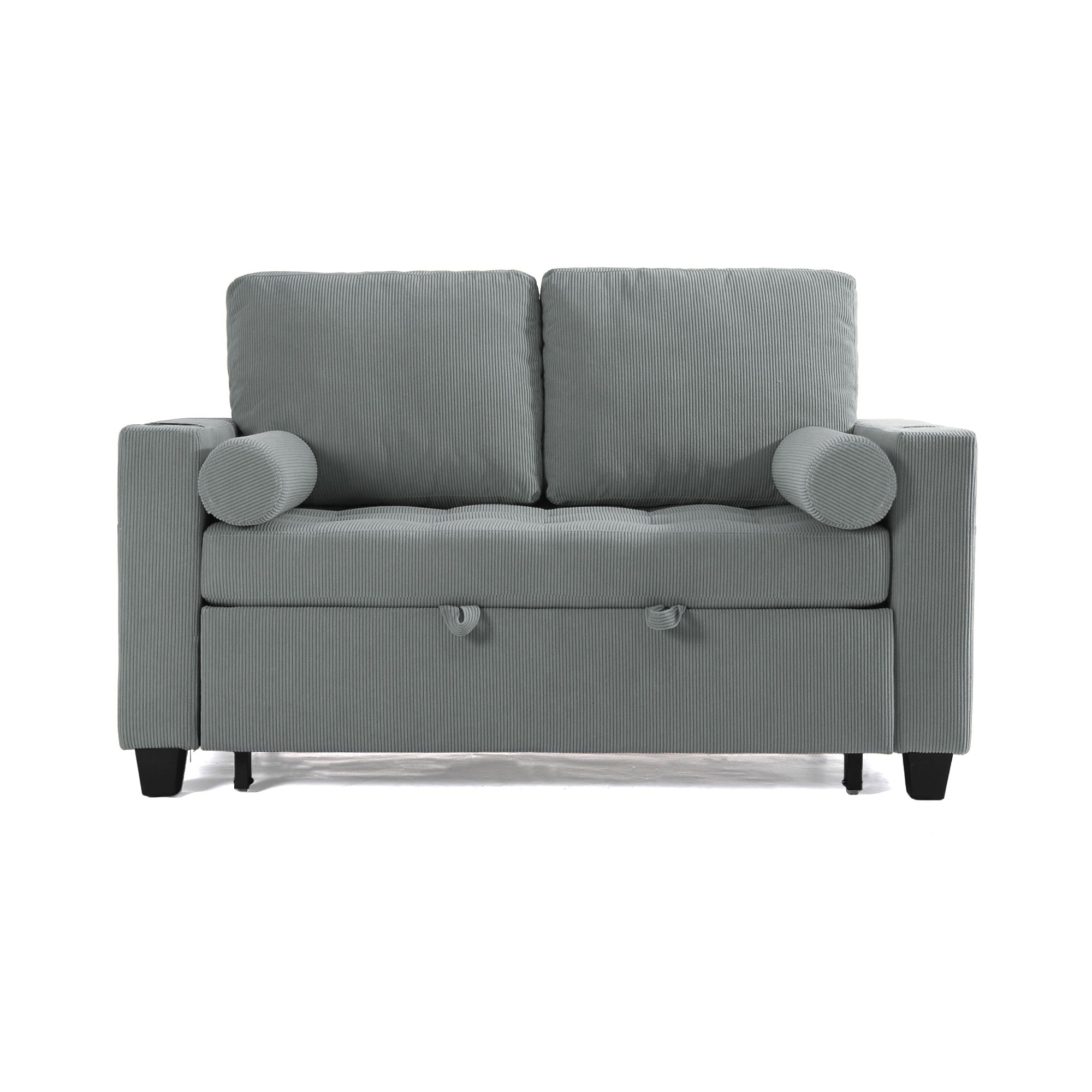 Let one loveseat handle movie nights, nap breaks, and sleepovers with our Cirum Tufted Convertible Pull-Out Sleeper Bed Loveseat. Use it as a cozy two-seat loveseat for everyday lounging, tip the 3-position back to stretch into a chaise, or pull the front platform out and lift it into a flat sleeper when guests stay. Tufted corduroy across the seat and pull-out section adds soft texture and helps cushions keep their shape. A roomy cup holder in one armrest keeps coffee, water, or a nightcap close by, while the other arm tucks in USB and Type-C charging ports so your devices stay topped up. A generous side storage pocket holds remotes, books, and chargers, turning this compact loveseat into a small-space hub for relaxing, scrolling, and settling in for the night.