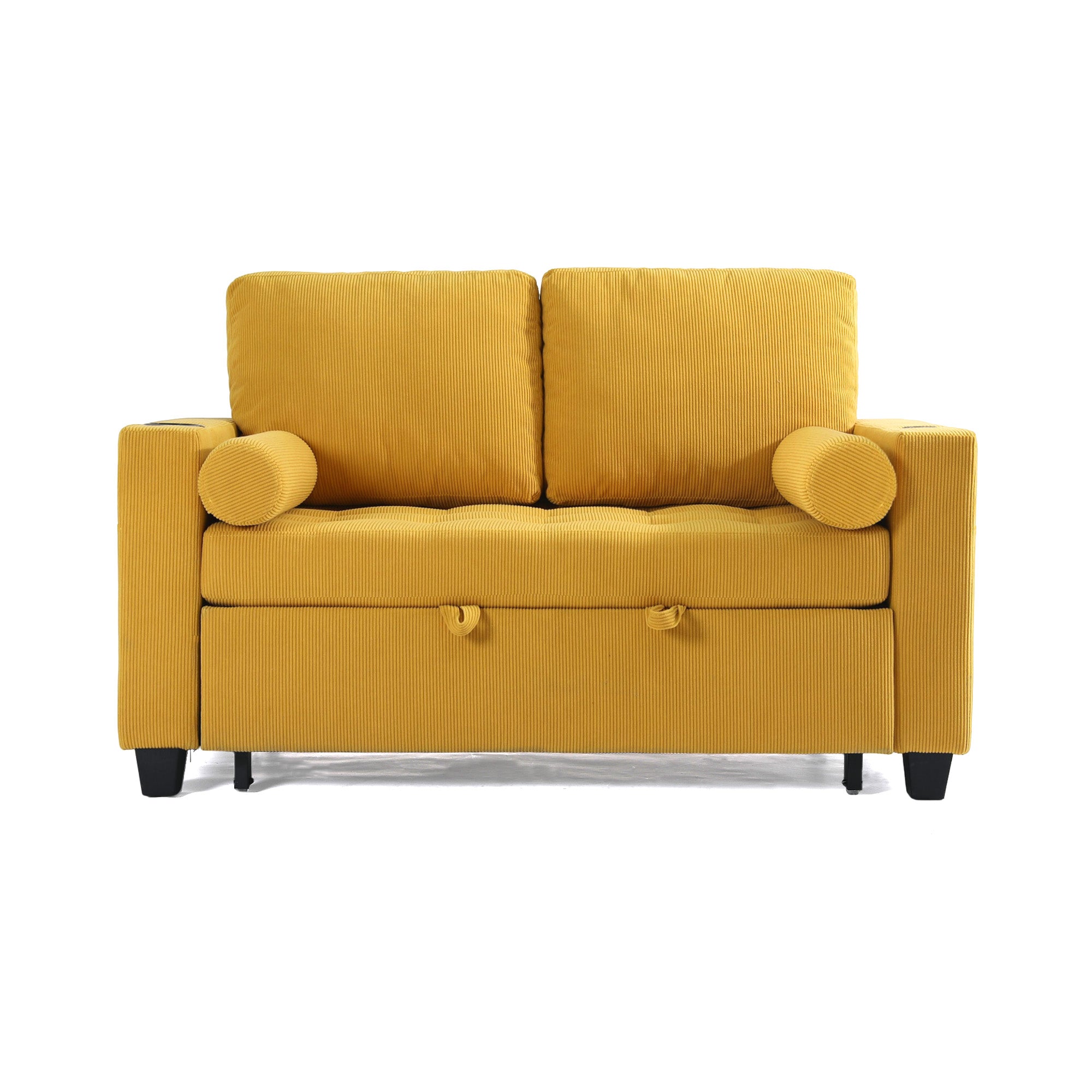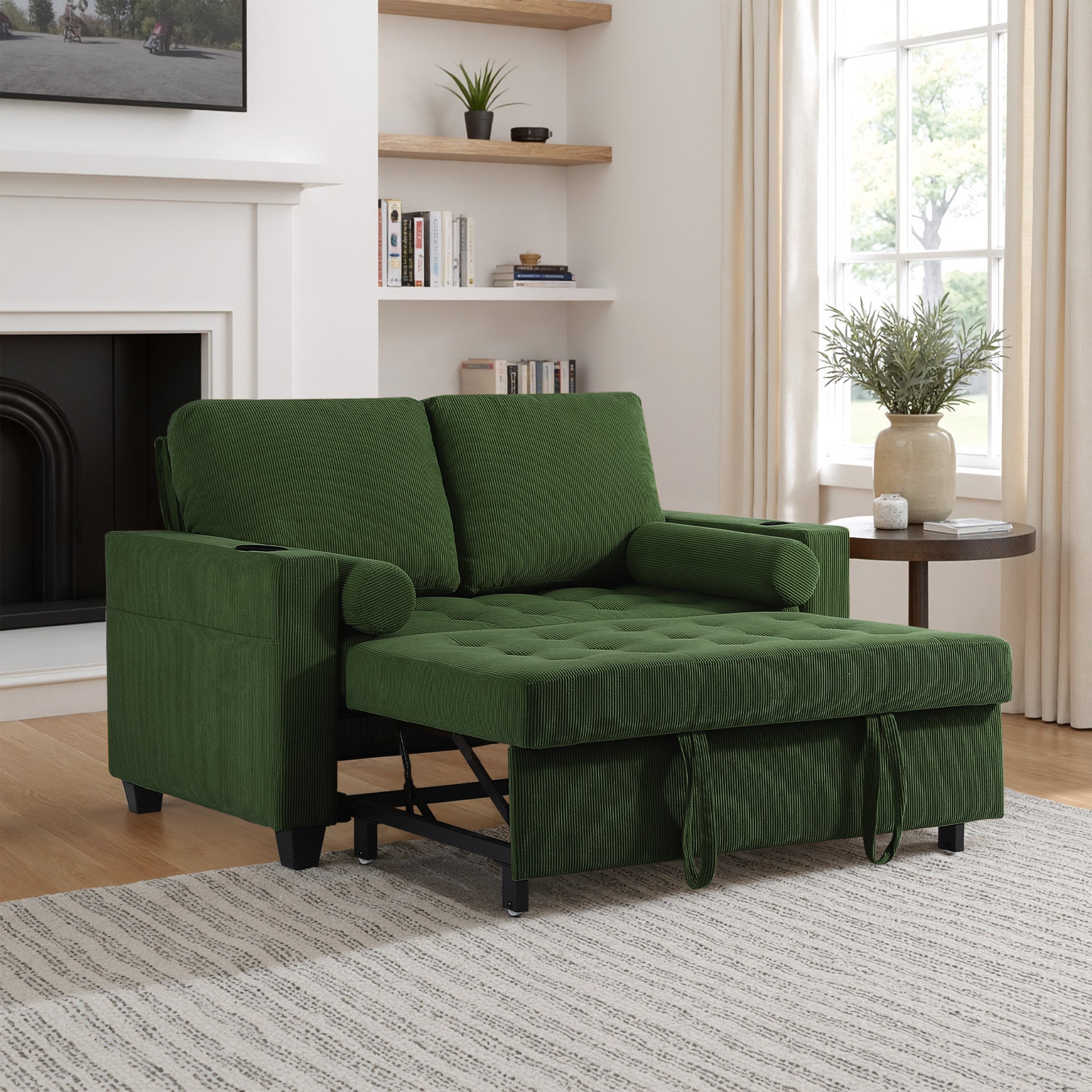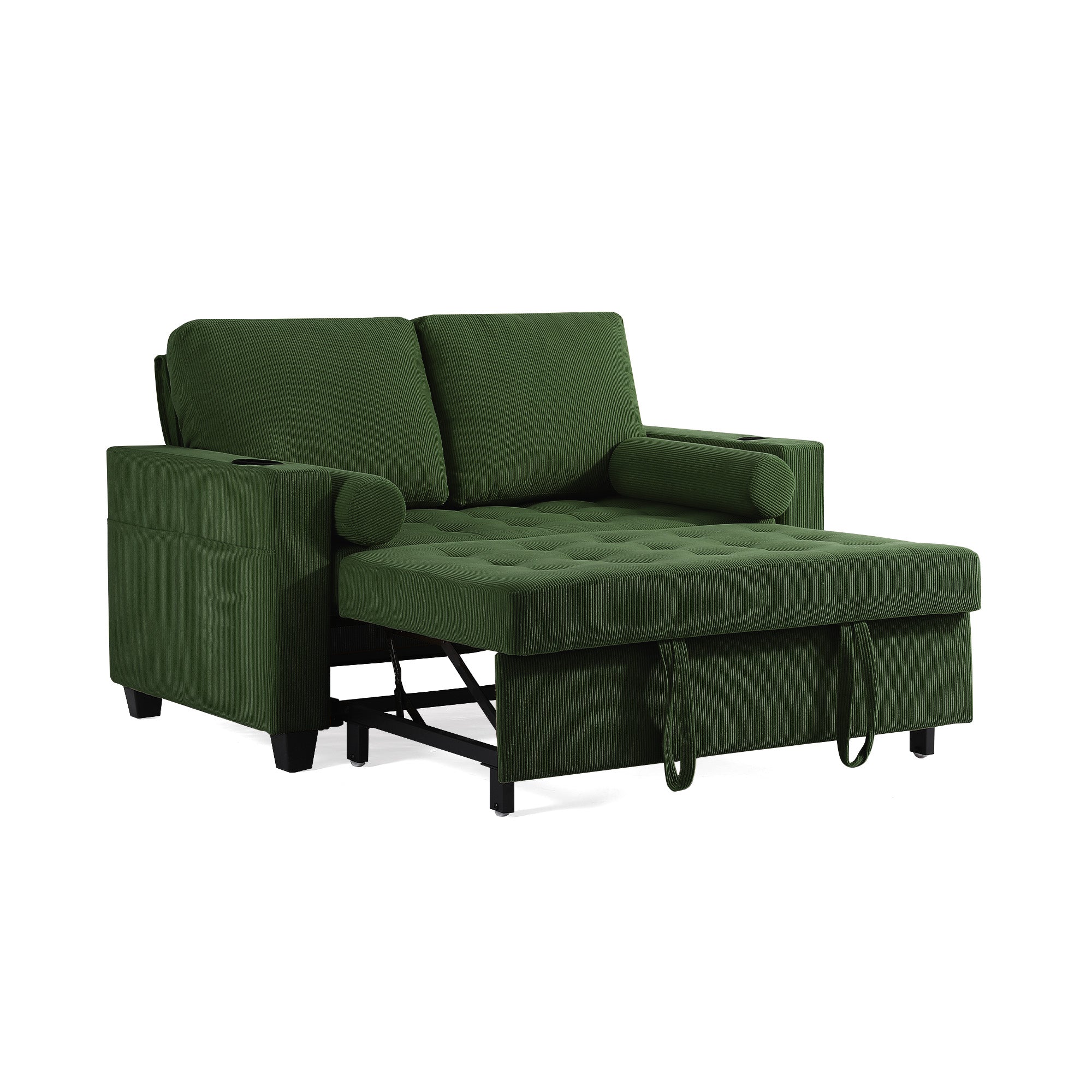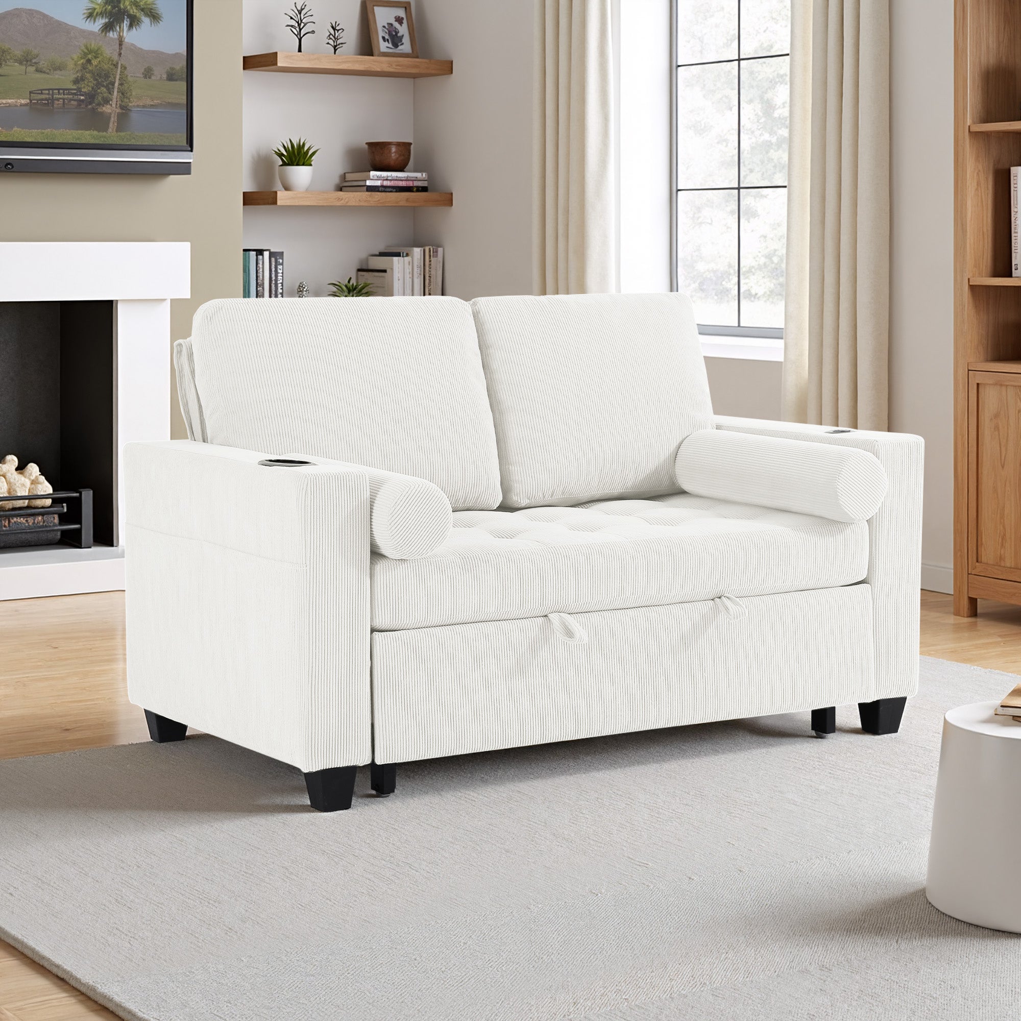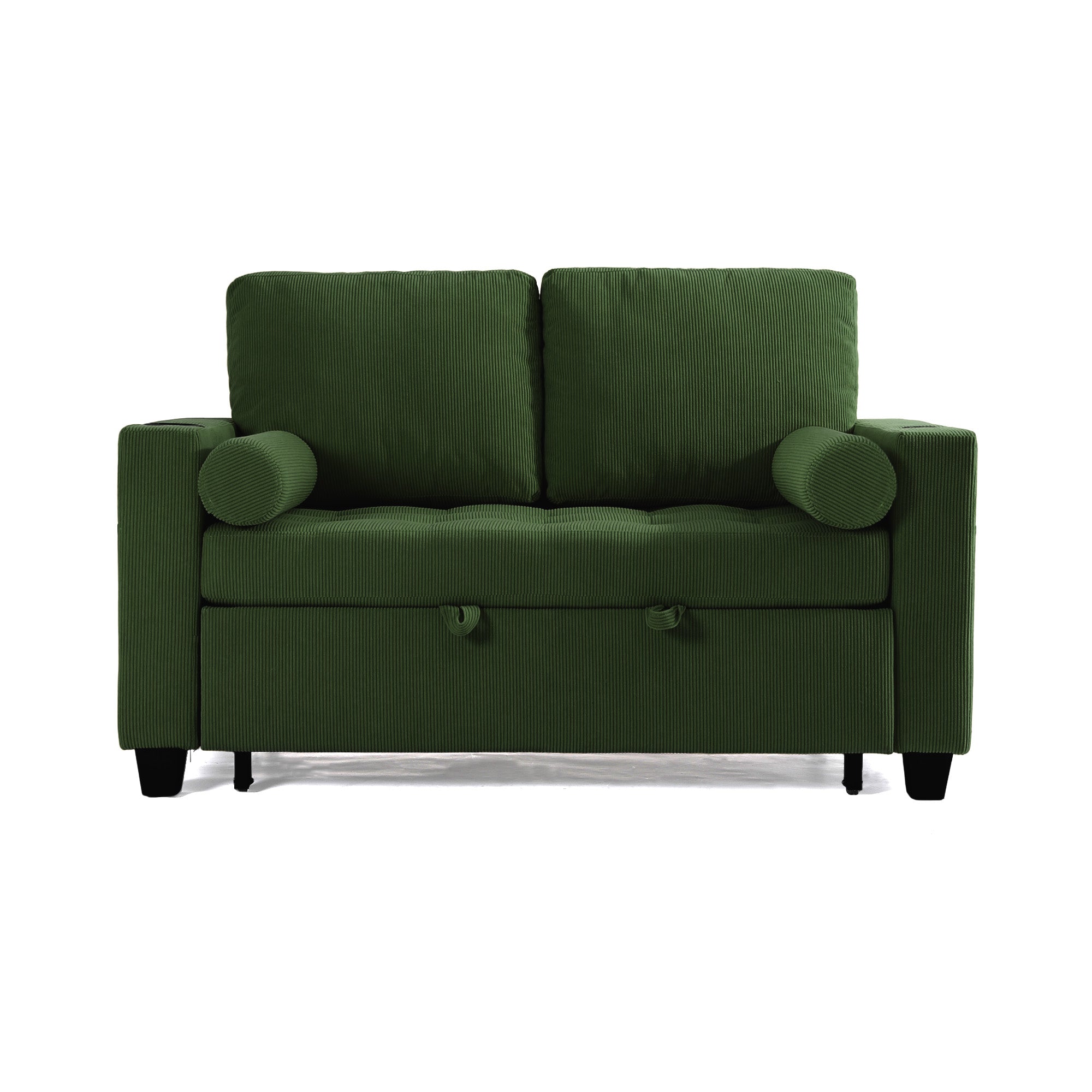 Let one loveseat handle movie nights, nap breaks, and sleepovers with our Cirum Tufted Convertible Pull-Out Sleeper Bed Loveseat. Use it as a cozy two-seat loveseat for everyday lounging, tip the 3-position back to stretch into a chaise, or pull the front platform out and lift it into a flat sleeper when guests stay. Tufted corduroy across the seat and pull-out section adds soft texture and helps cushions keep their shape. A roomy cup holder in one armrest keeps coffee, water, or a nightcap close by, while the other arm tucks in USB and Type-C charging ports so your devices stay topped up. A generous side storage pocket holds remotes, books, and chargers, turning this compact loveseat into a small-space hub for relaxing, scrolling, and settling in for the night.