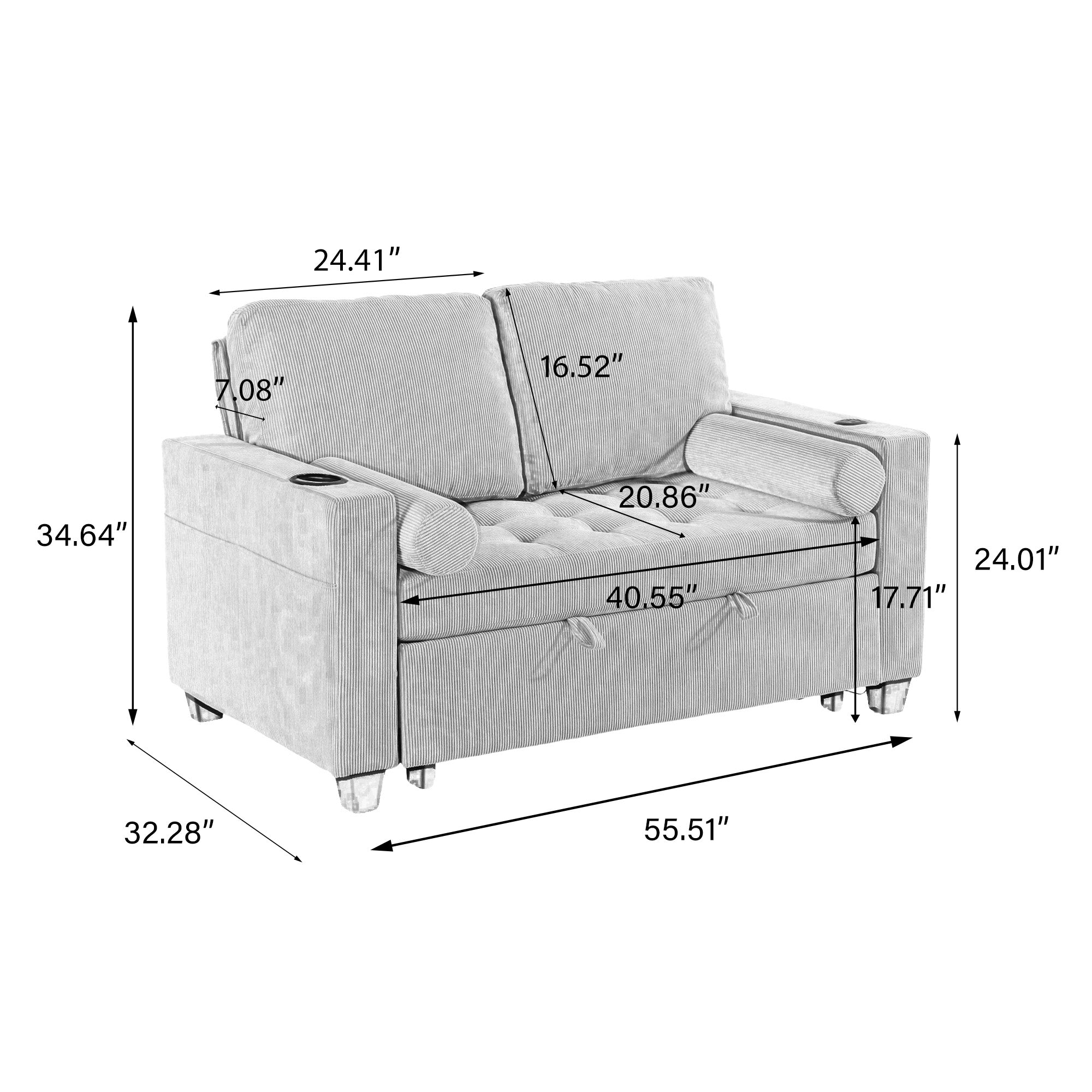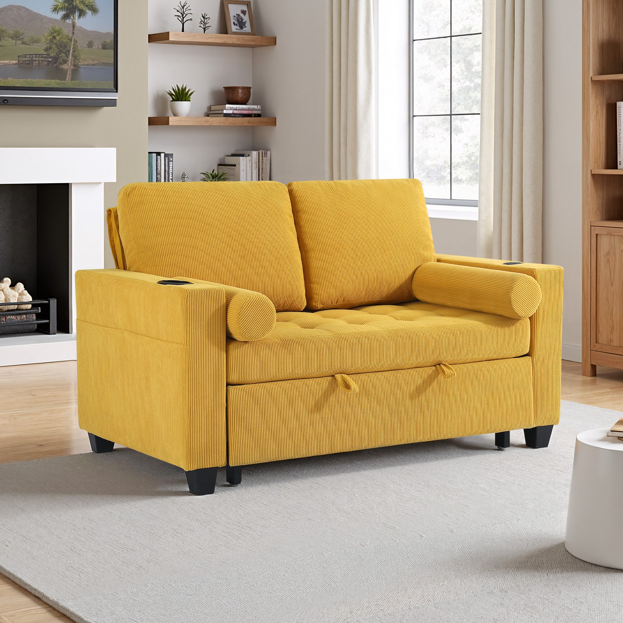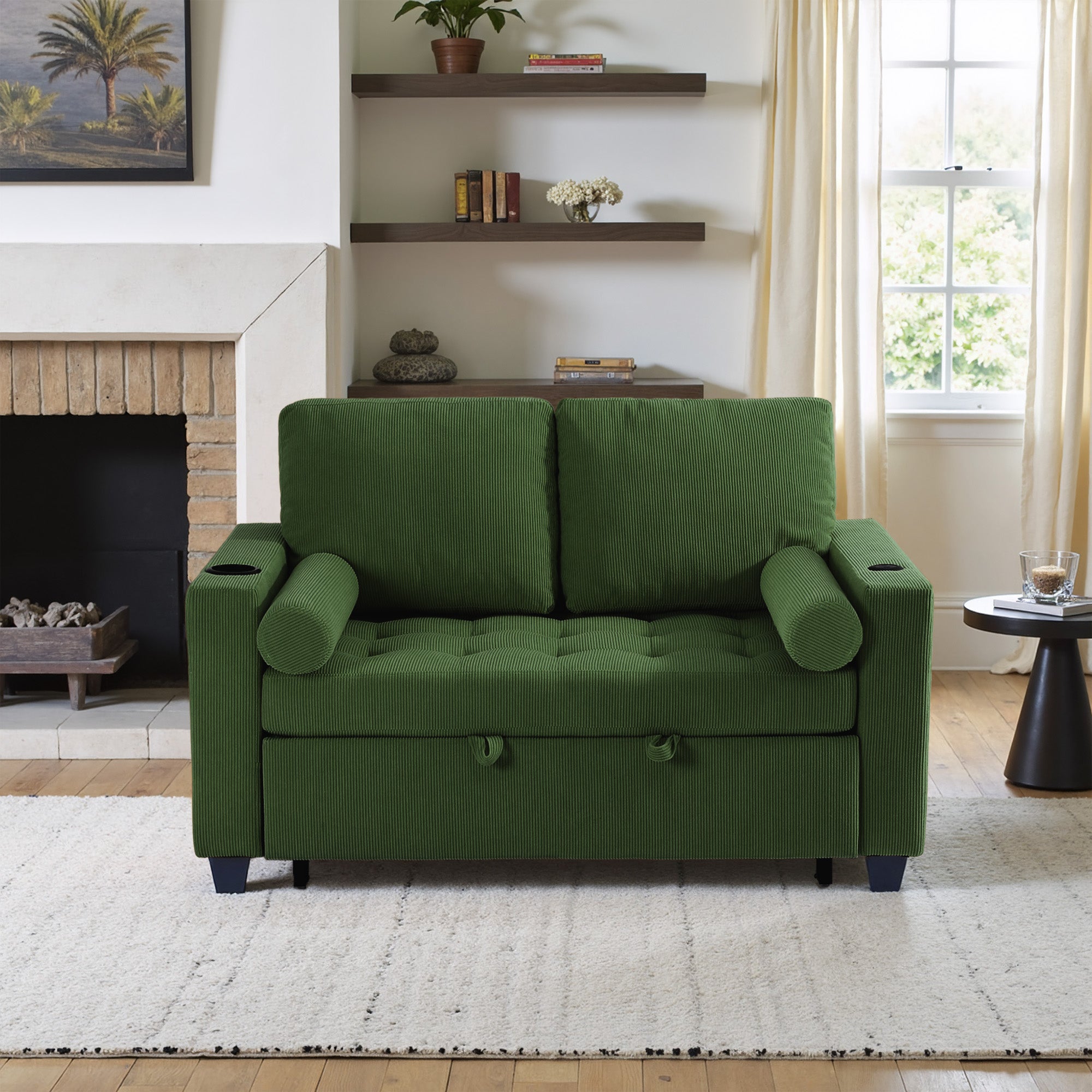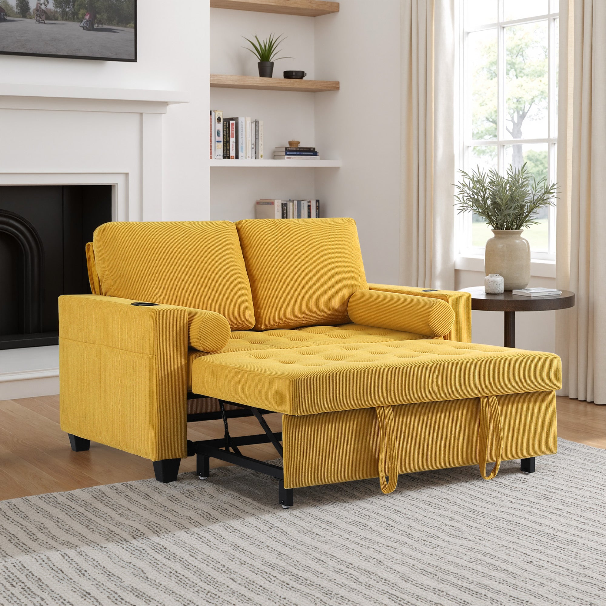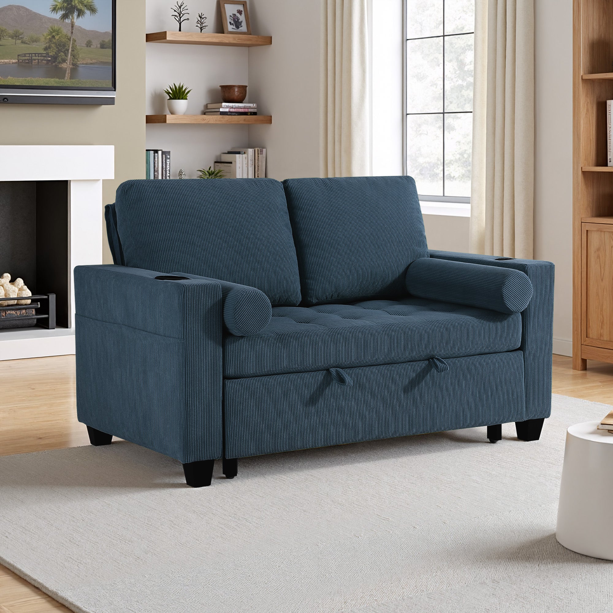 Let one loveseat handle movie nights, nap breaks, and sleepovers with our Cirum Tufted Convertible Pull-Out Sleeper Bed Loveseat. Use it as a cozy two-seat loveseat for everyday lounging, tip the 3-position back to stretch into a chaise, or pull the front platform out and lift it into a flat sleeper when guests stay. Tufted corduroy across the seat and pull-out section adds soft texture and helps cushions keep their shape. A roomy cup holder in one armrest keeps coffee, water, or a nightcap close by, while the other arm tucks in USB and Type-C charging ports so your devices stay topped up. A generous side storage pocket holds remotes, books, and chargers, turning this compact loveseat into a small-space hub for relaxing, scrolling, and settling in for the night.
