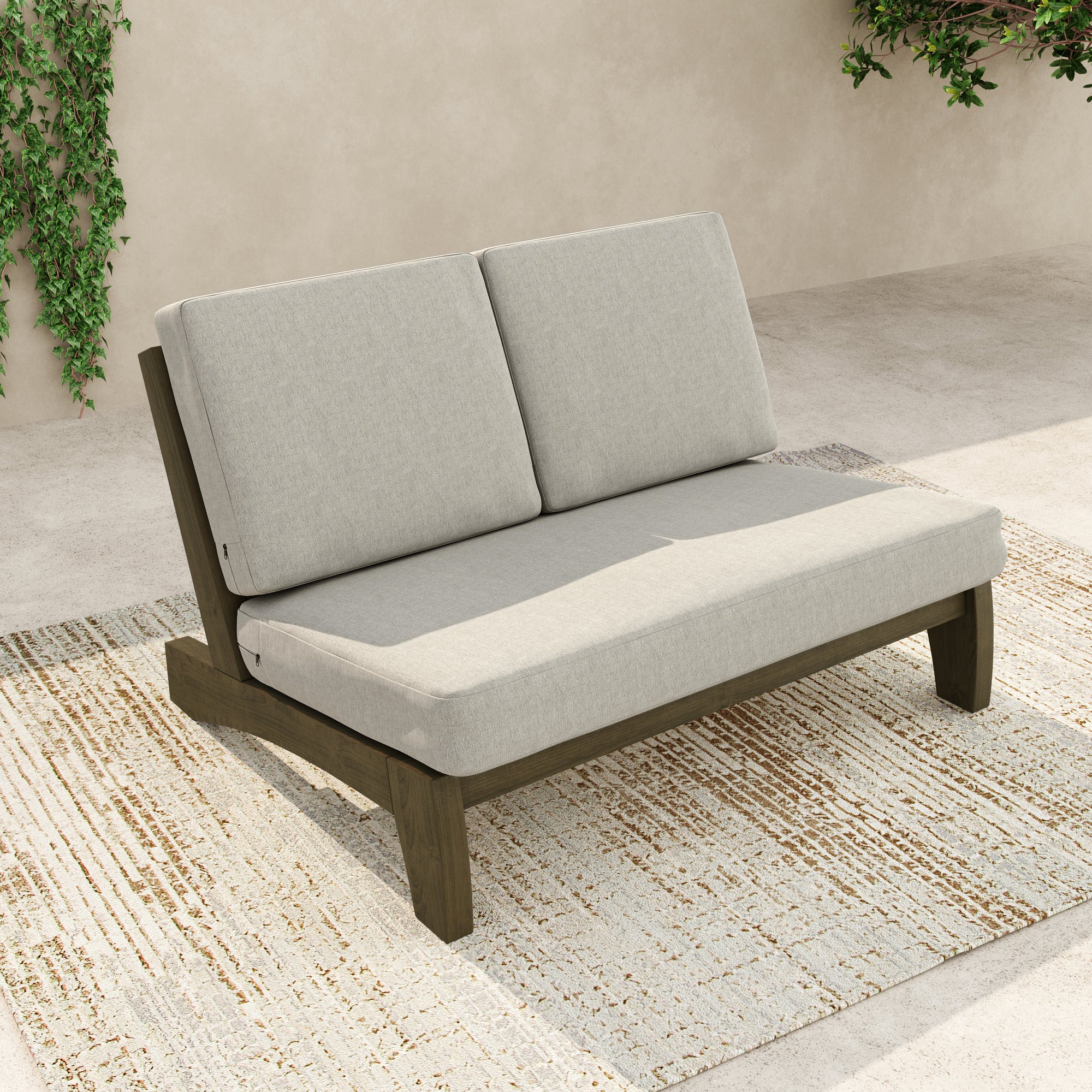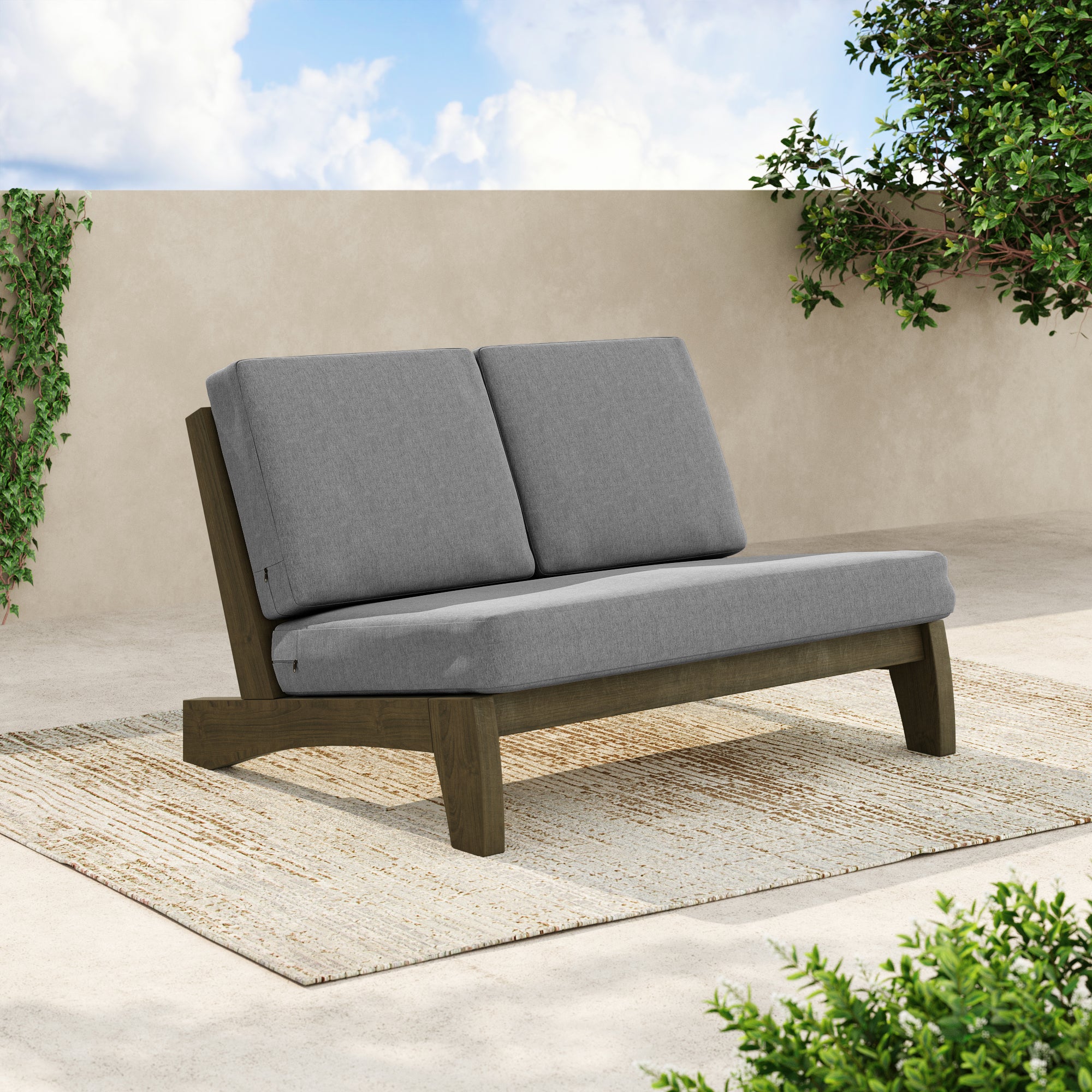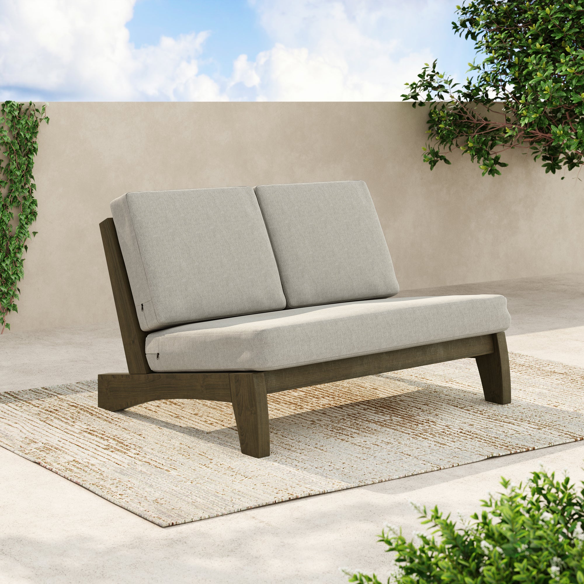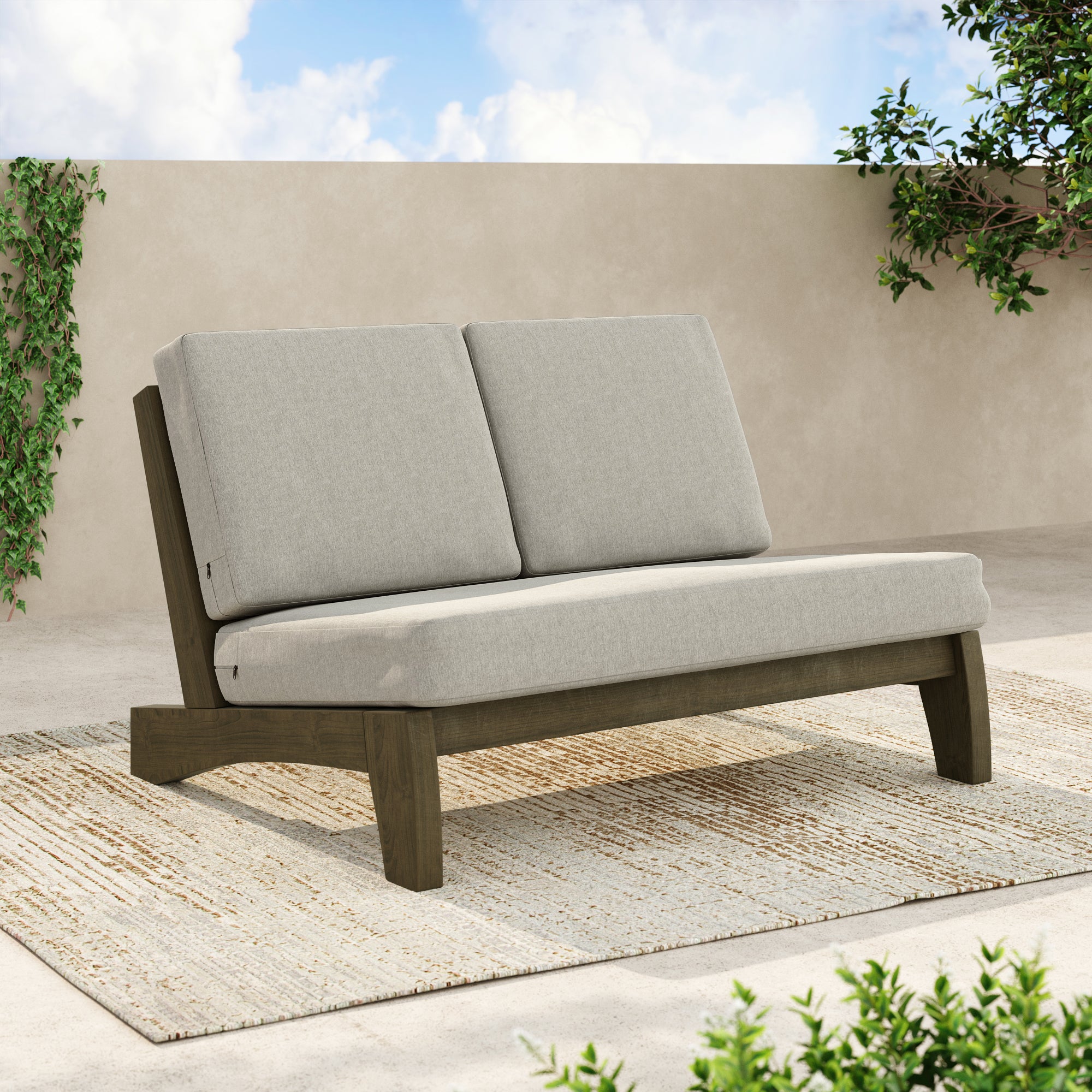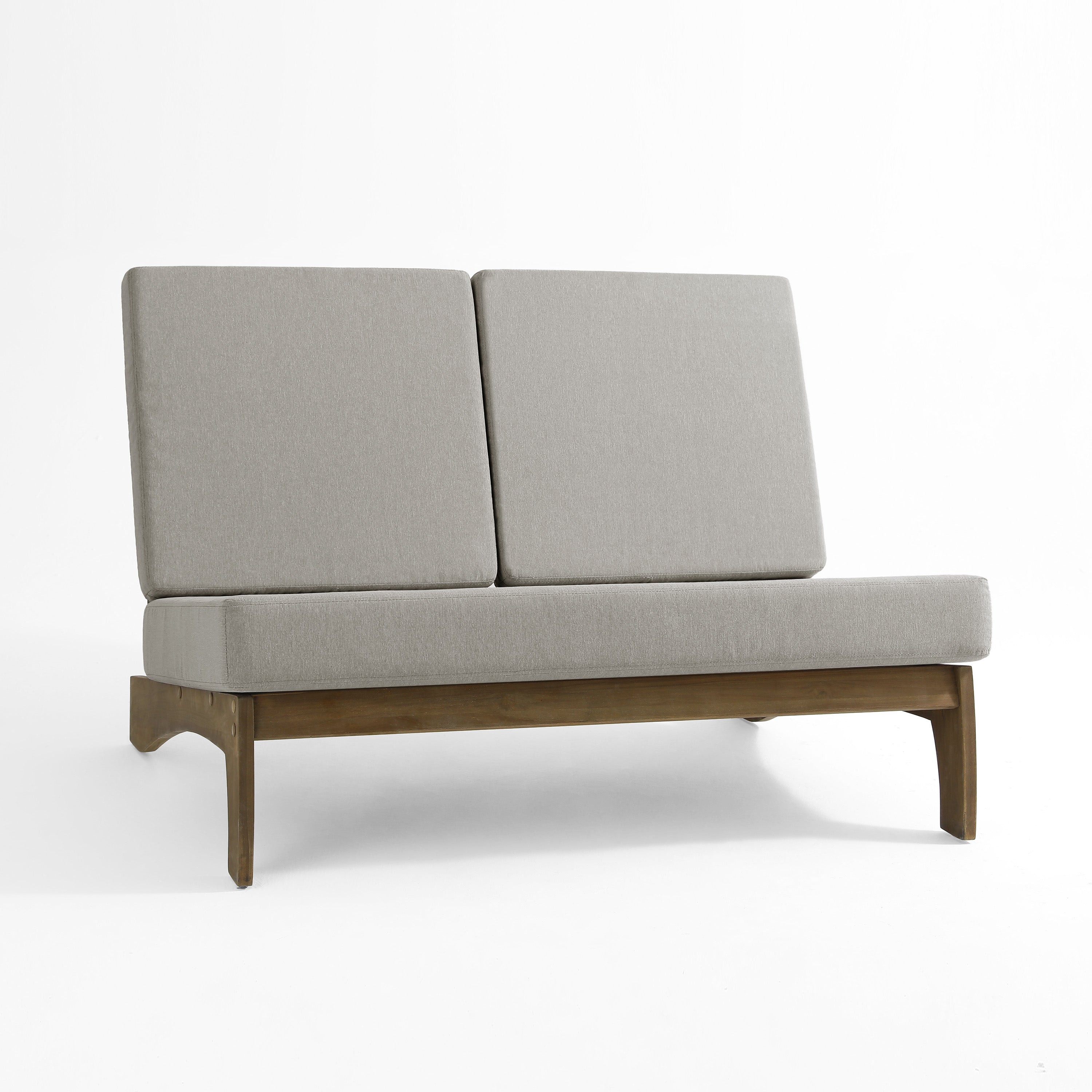 Ease into a two-seat pause that feels tailored, not fussy, with our Gideor Modern Teak Split-Back Outdoor Armless Loveseat. The split-back seam adds a subtle, structured detail while the armless profile keeps the look airy and easy to mix in. A slanted ladder-back sets a relaxed angle, and foam-padded cushions make lingering feel natural. Spill-resistant cotton-blend upholstery helps with everyday drips, and zippered covers make refreshes simple. Teak brings warmth and a clean presence that plays well with everything from compact balconies to wide-open patios.