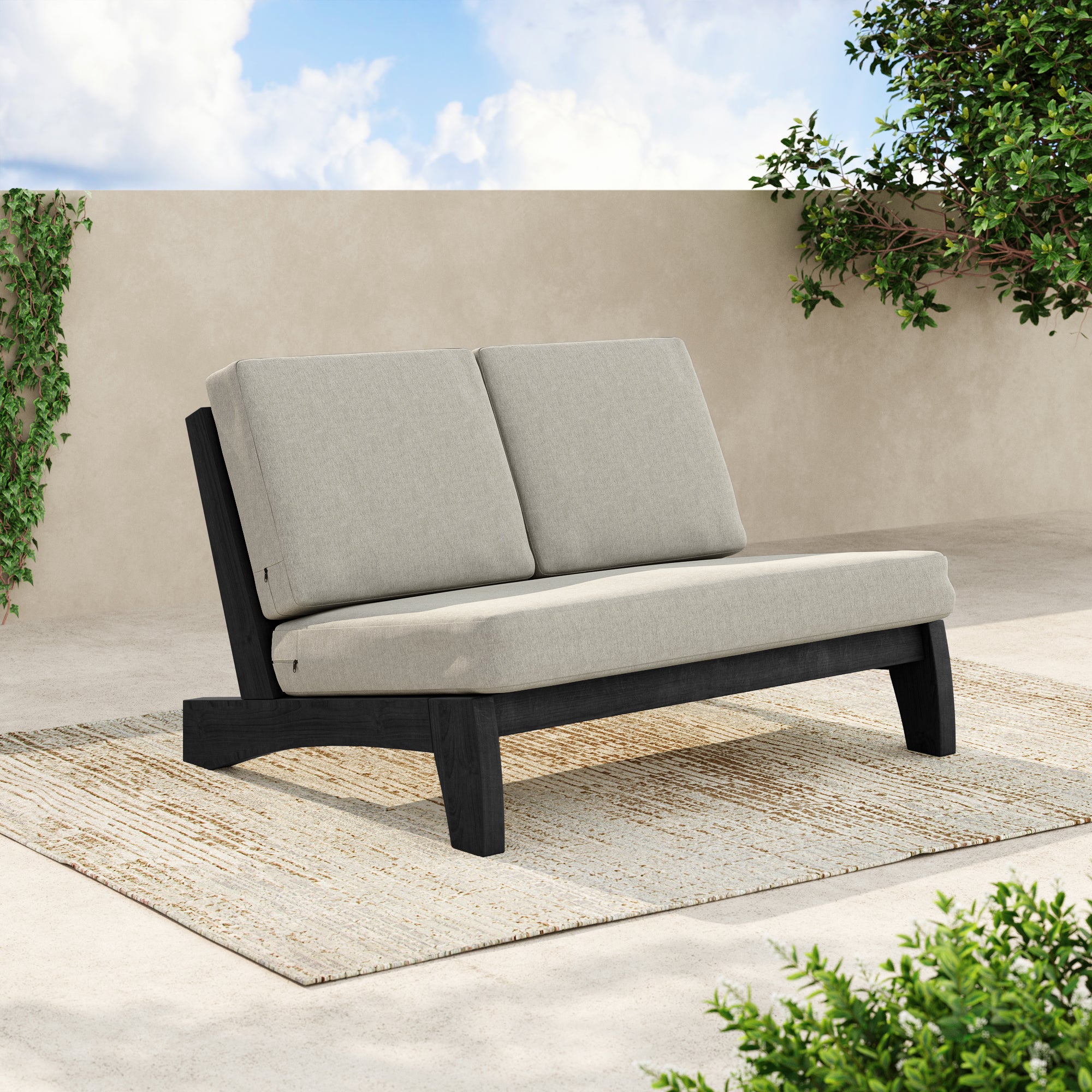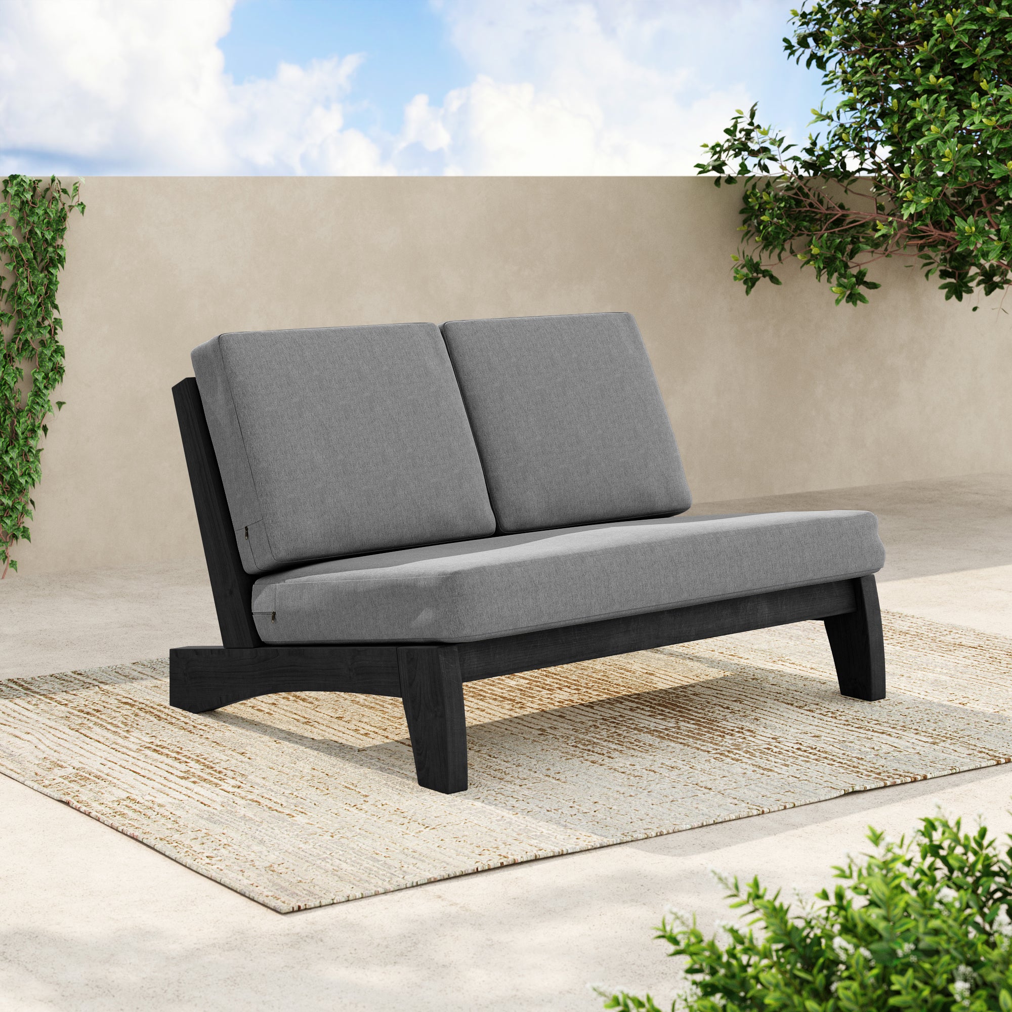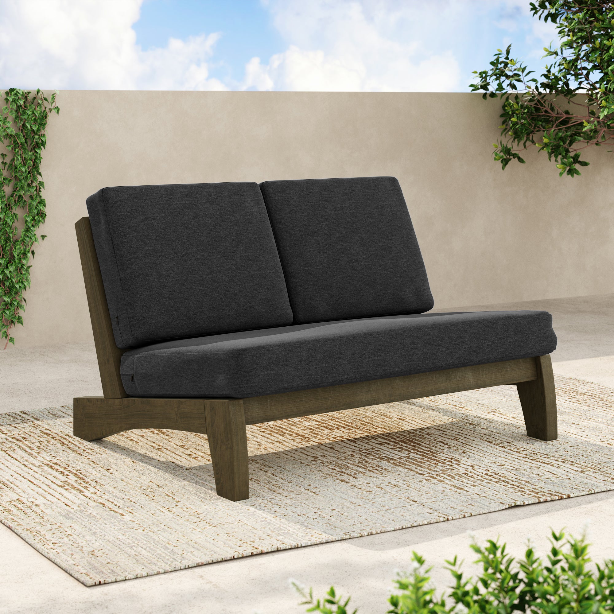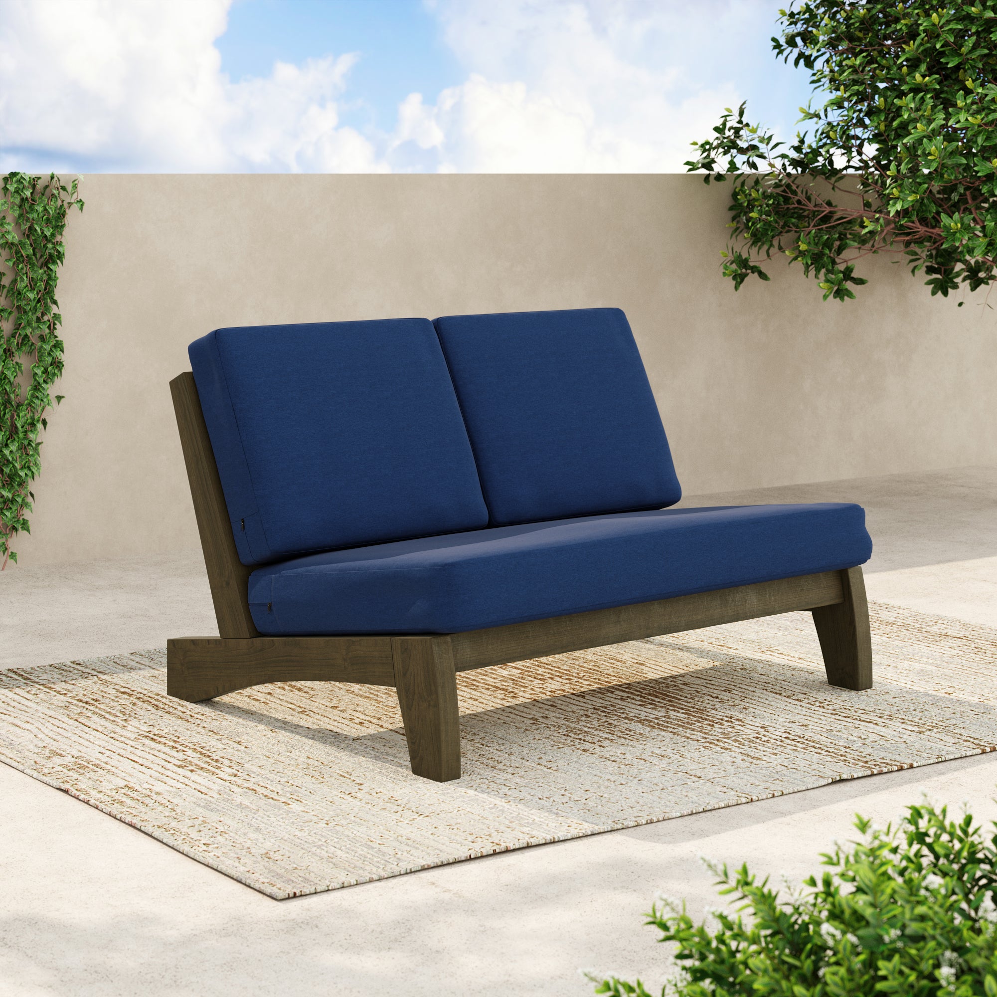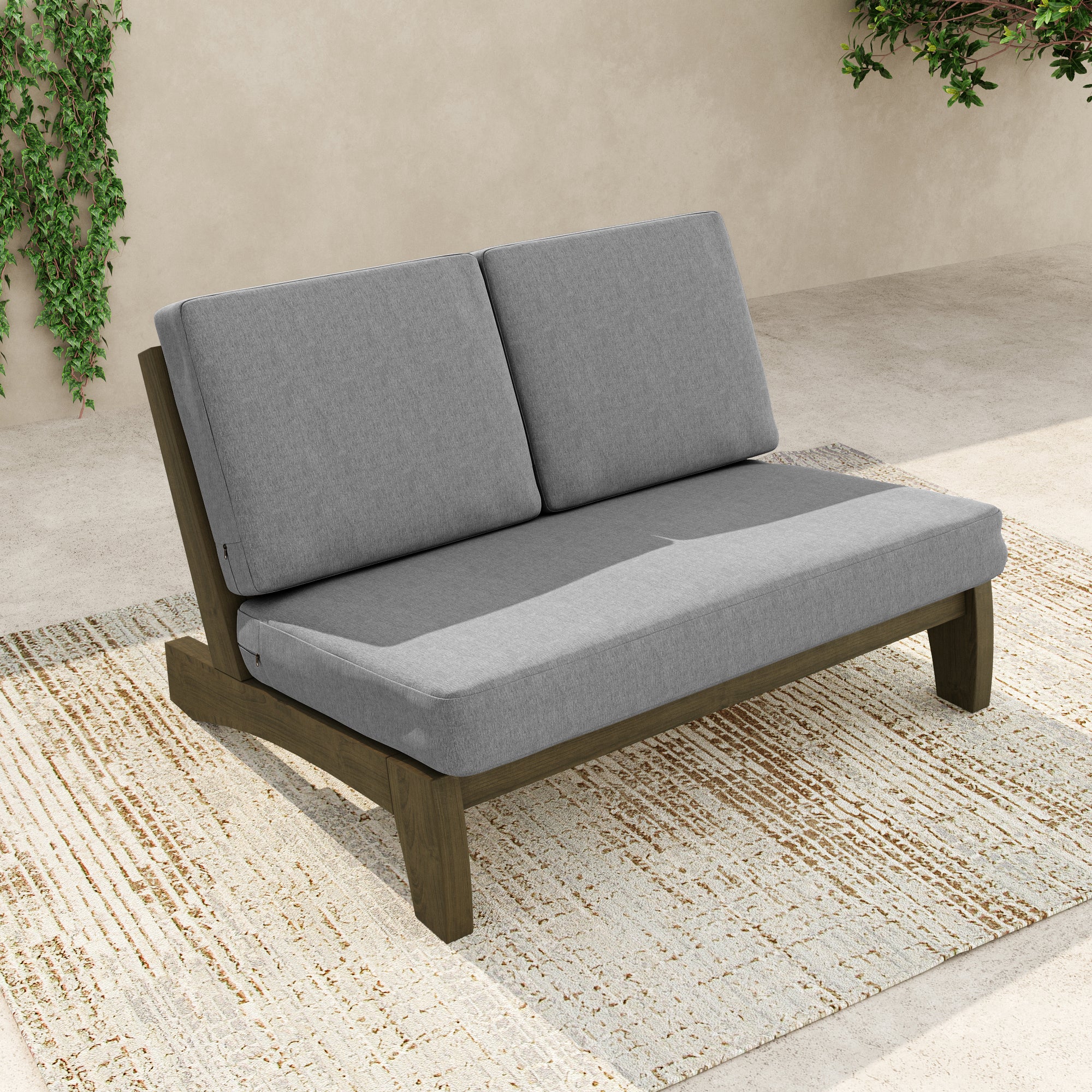 Ease into a two-seat pause that feels tailored, not fussy, with our Gideor Modern Teak Split-Back Outdoor Armless Loveseat. The split-back seam adds a subtle, structured detail while the armless profile keeps the look airy and easy to mix in. A slanted ladder-back sets a relaxed angle, and foam-padded cushions make lingering feel natural. Spill-resistant cotton-blend upholstery helps with everyday drips, and zippered covers make refreshes simple. Teak brings warmth and a clean presence that plays well with everything from compact balconies to wide-open patios.