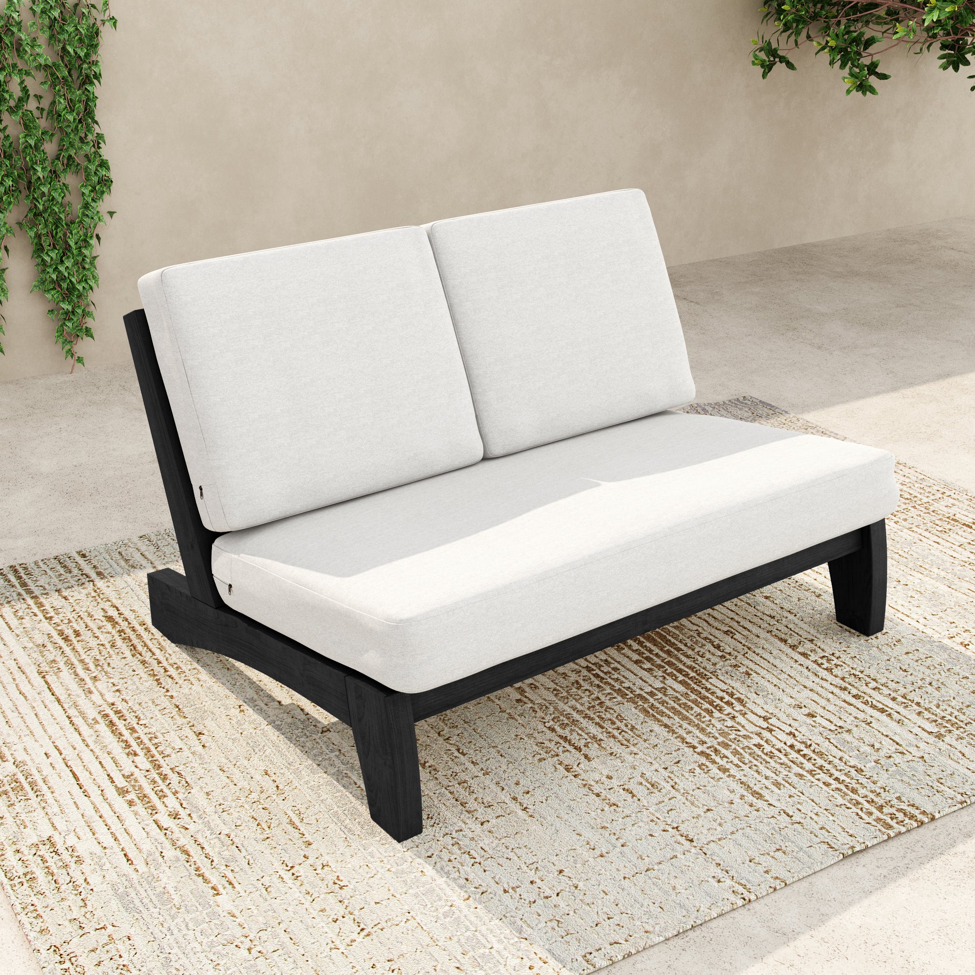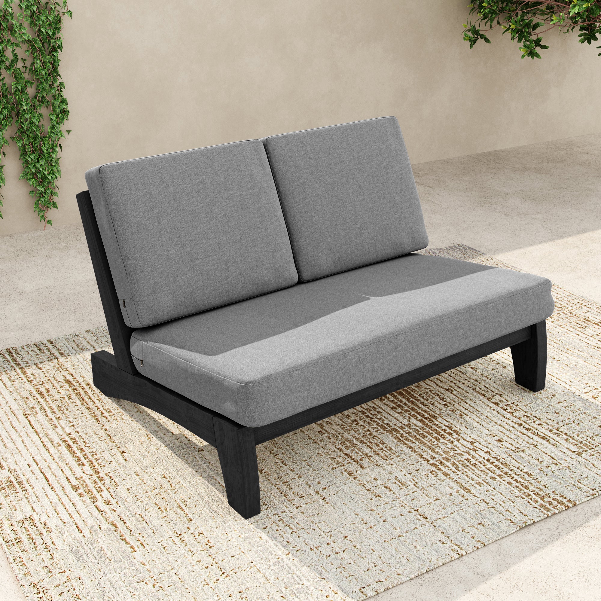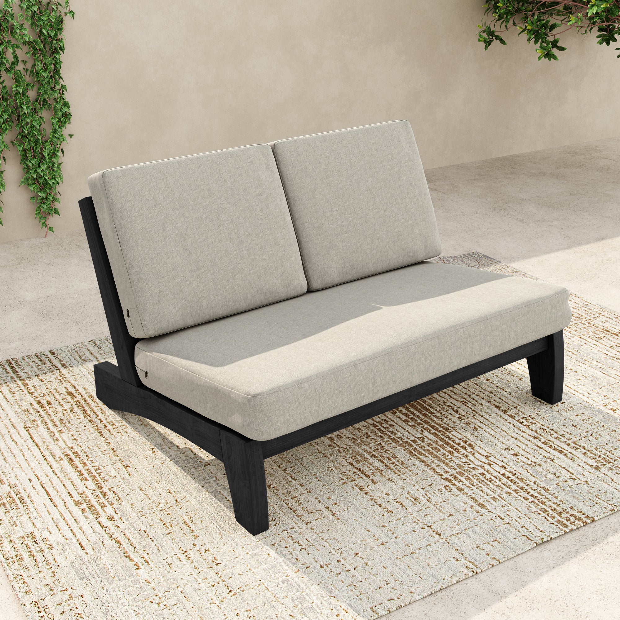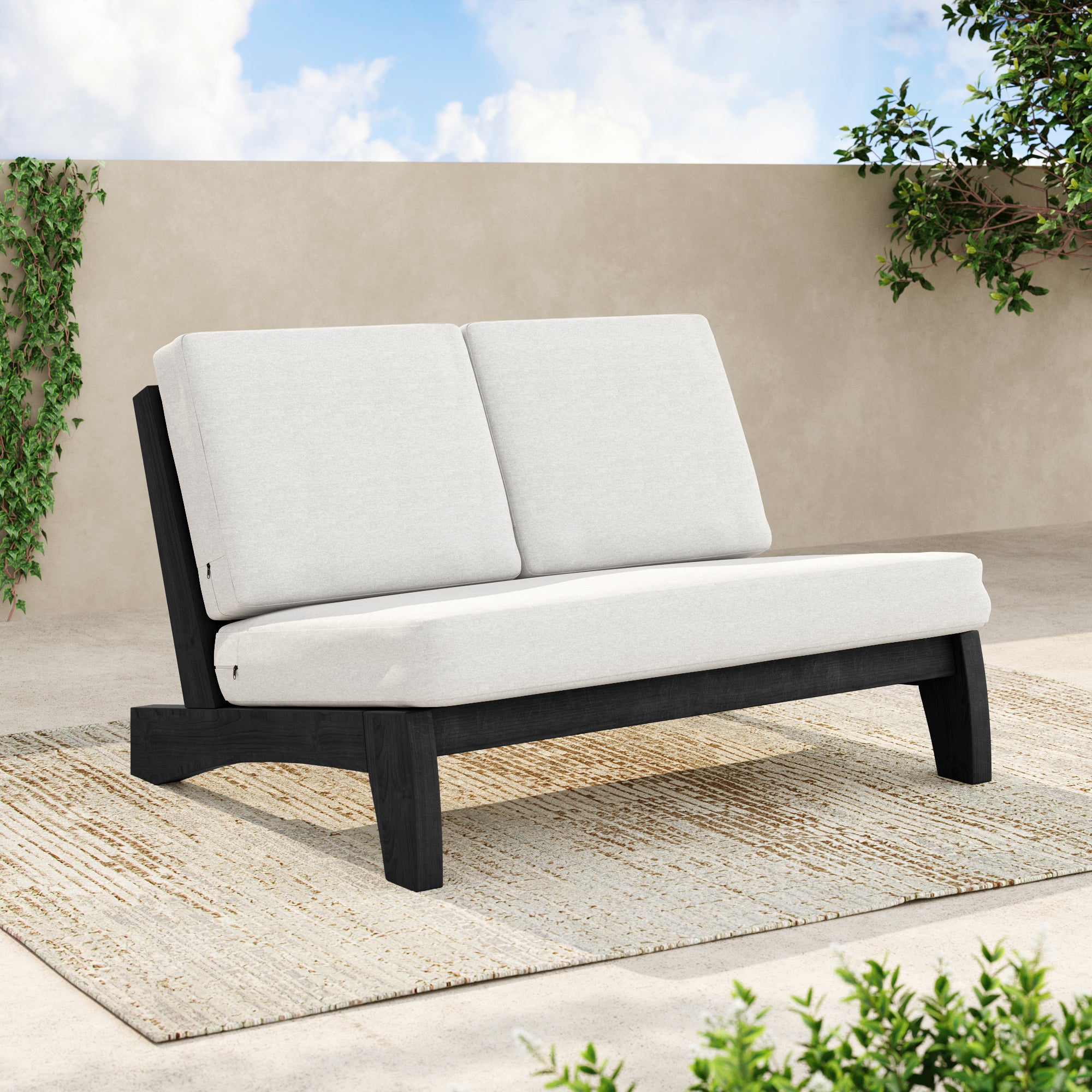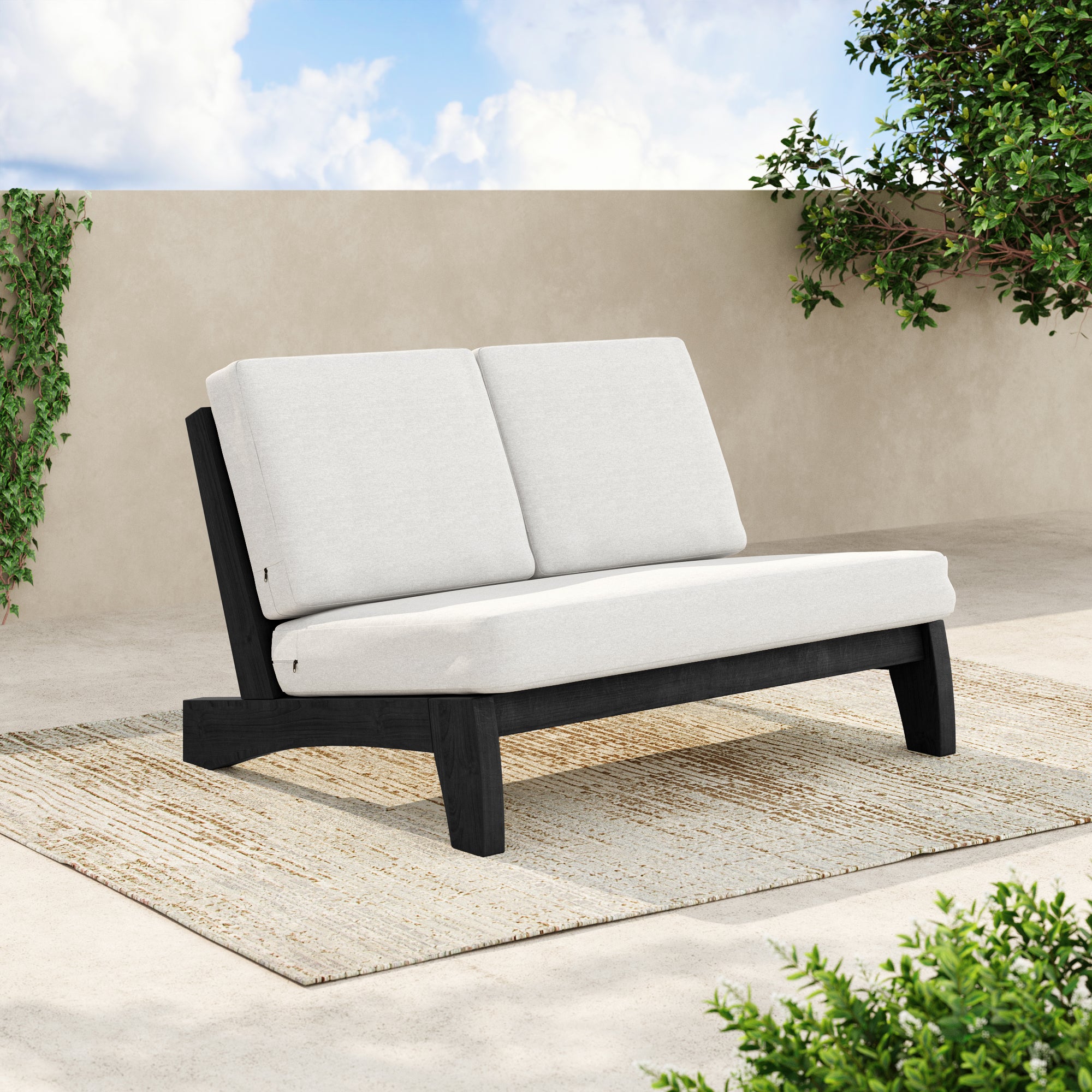 Ease into a two-seat pause that feels tailored, not fussy, with our Gideor Modern Teak Split-Back Outdoor Armless Loveseat. The split-back seam adds a subtle, structured detail while the armless profile keeps the look airy and easy to mix in. A slanted ladder-back sets a relaxed angle, and foam-padded cushions make lingering feel natural. Spill-resistant cotton-blend upholstery helps with everyday drips, and zippered covers make refreshes simple. Teak brings warmth and a clean presence that plays well with everything from compact balconies to wide-open patios.