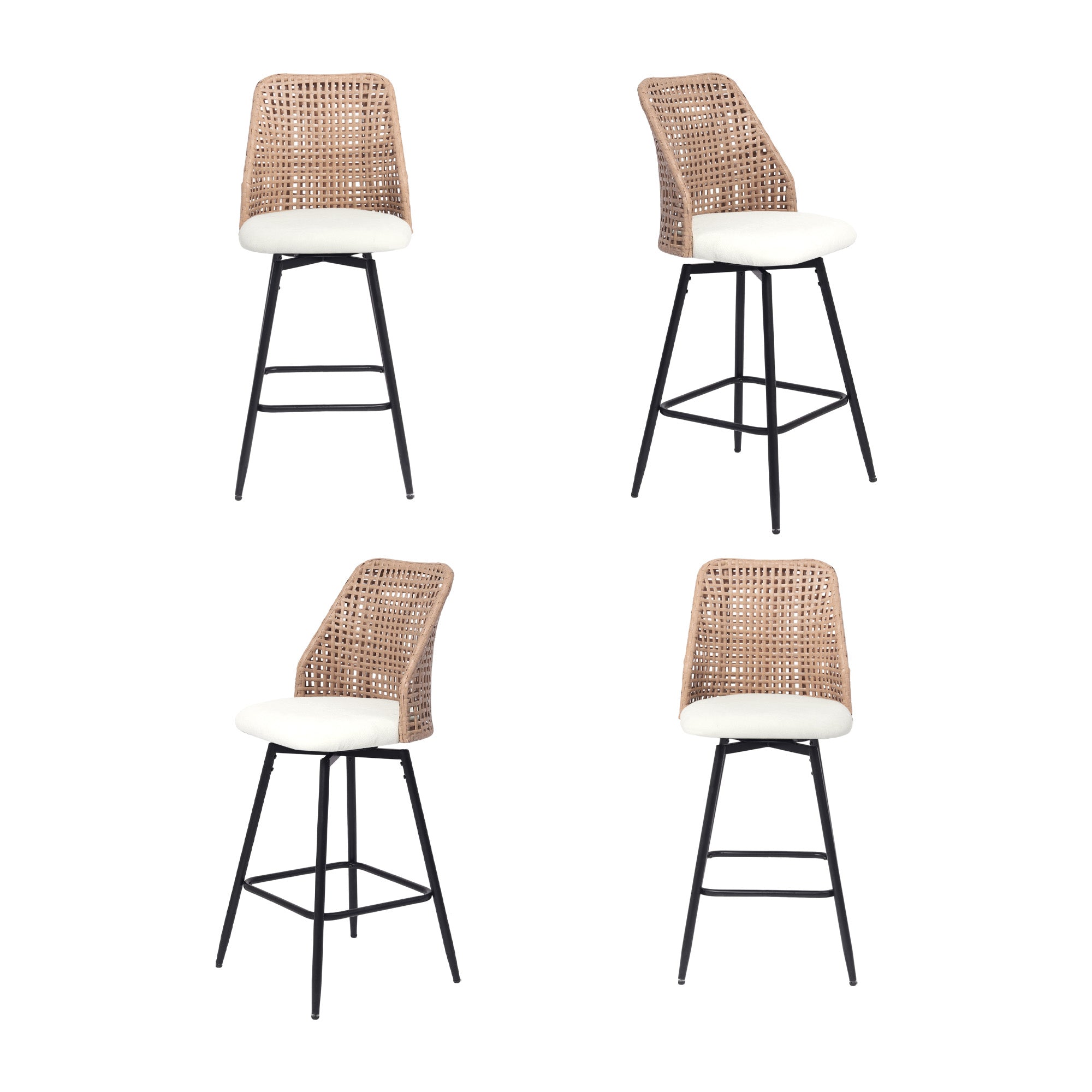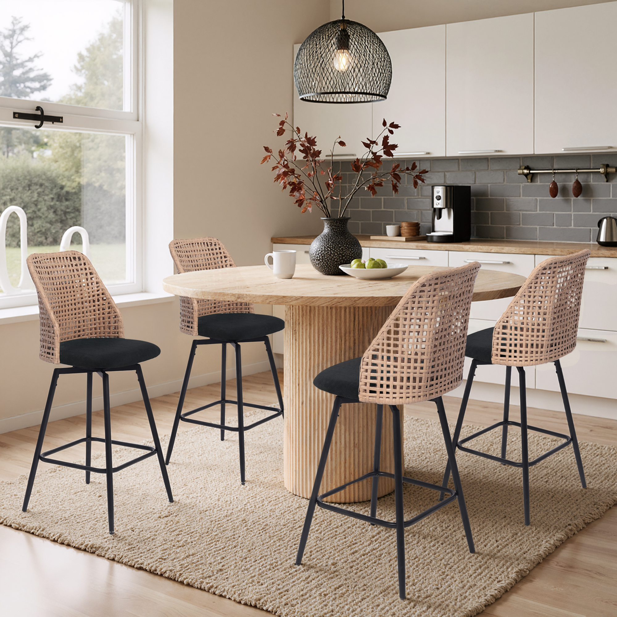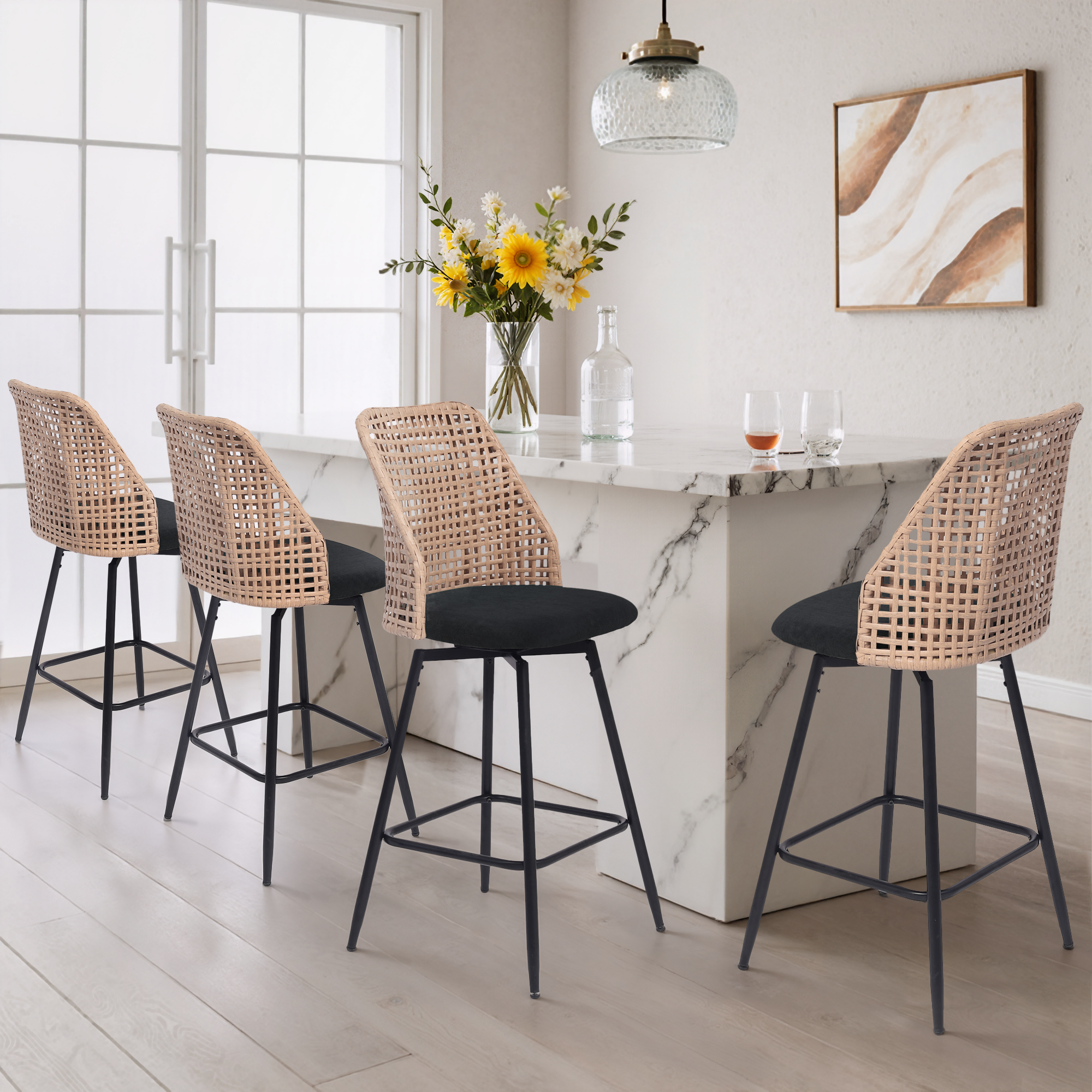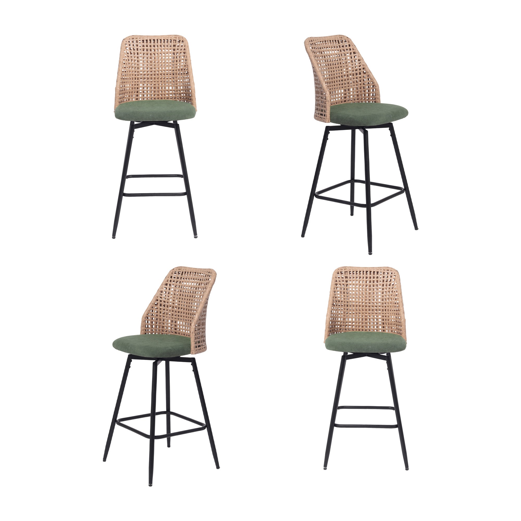 Spin from snack prep to conversation with our Ioneo Wicker Back Swivel Upholstered Bar Stools Set of 4. The mid-height backs use a wicker-style weaving technique that adds airy texture instead of bulk. Plush chenille over foam cushioning makes the round seats comfortable enough for lingering at bar height. A built-in 360-degree swivel plate lets you turn smoothly toward friends, counters, or screens. Slim metal legs, a square footrest, and adjustable levelers steady each 28.7-inch seat so your bar setup feels balanced.