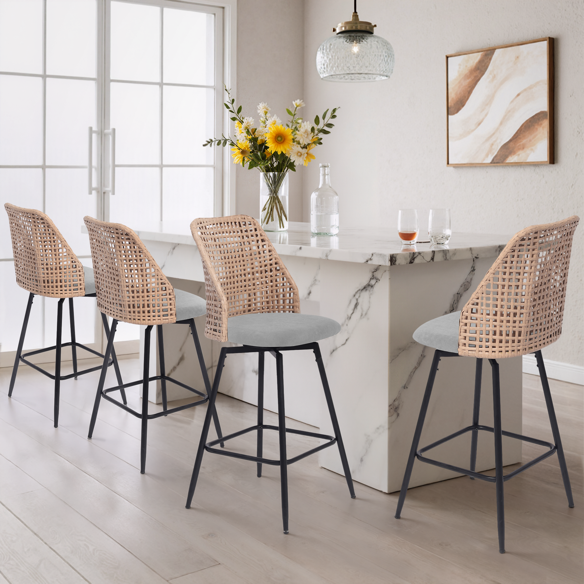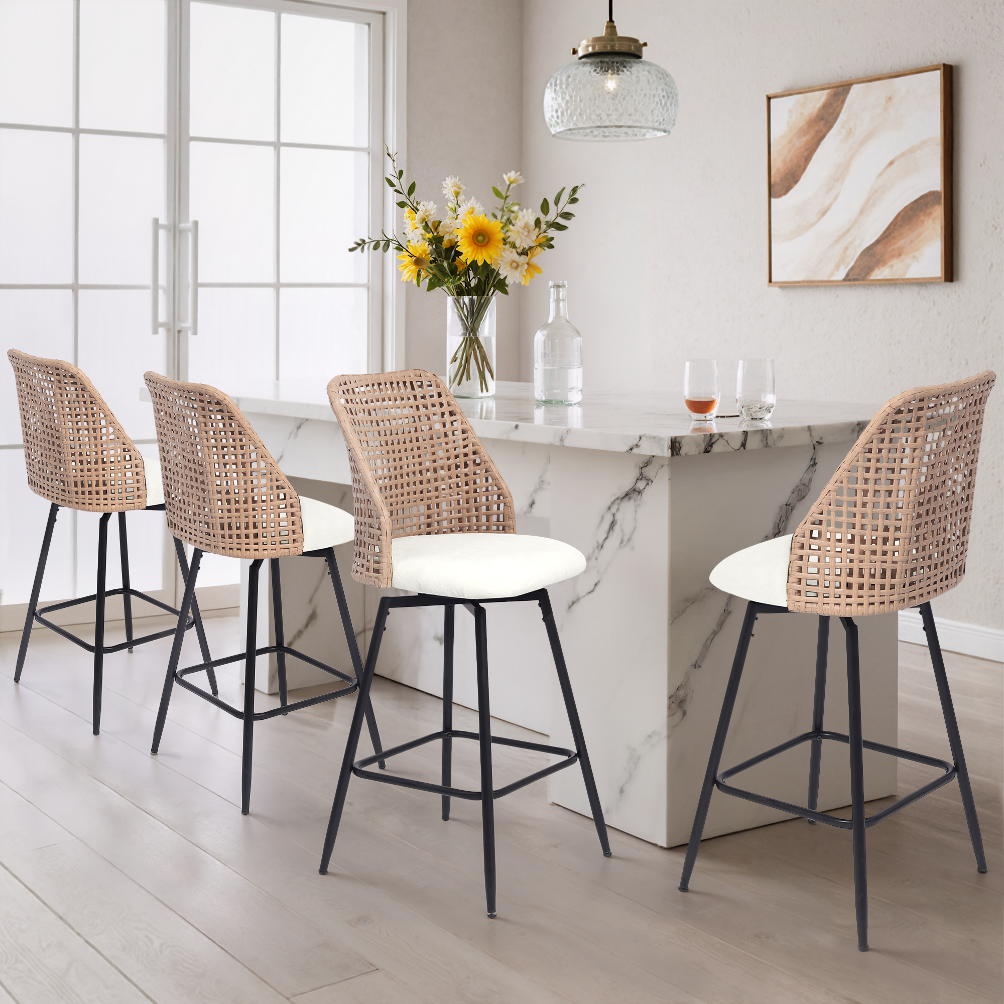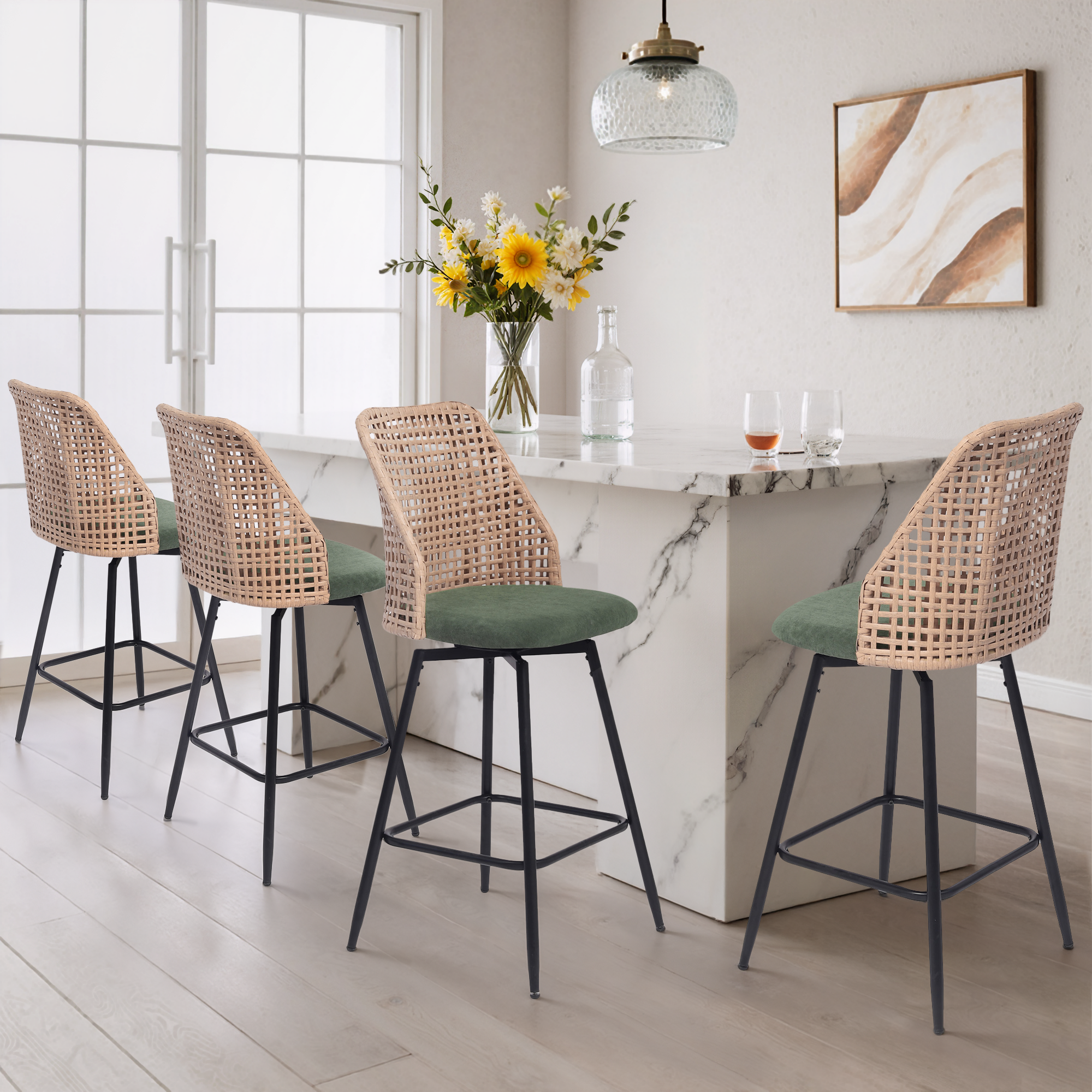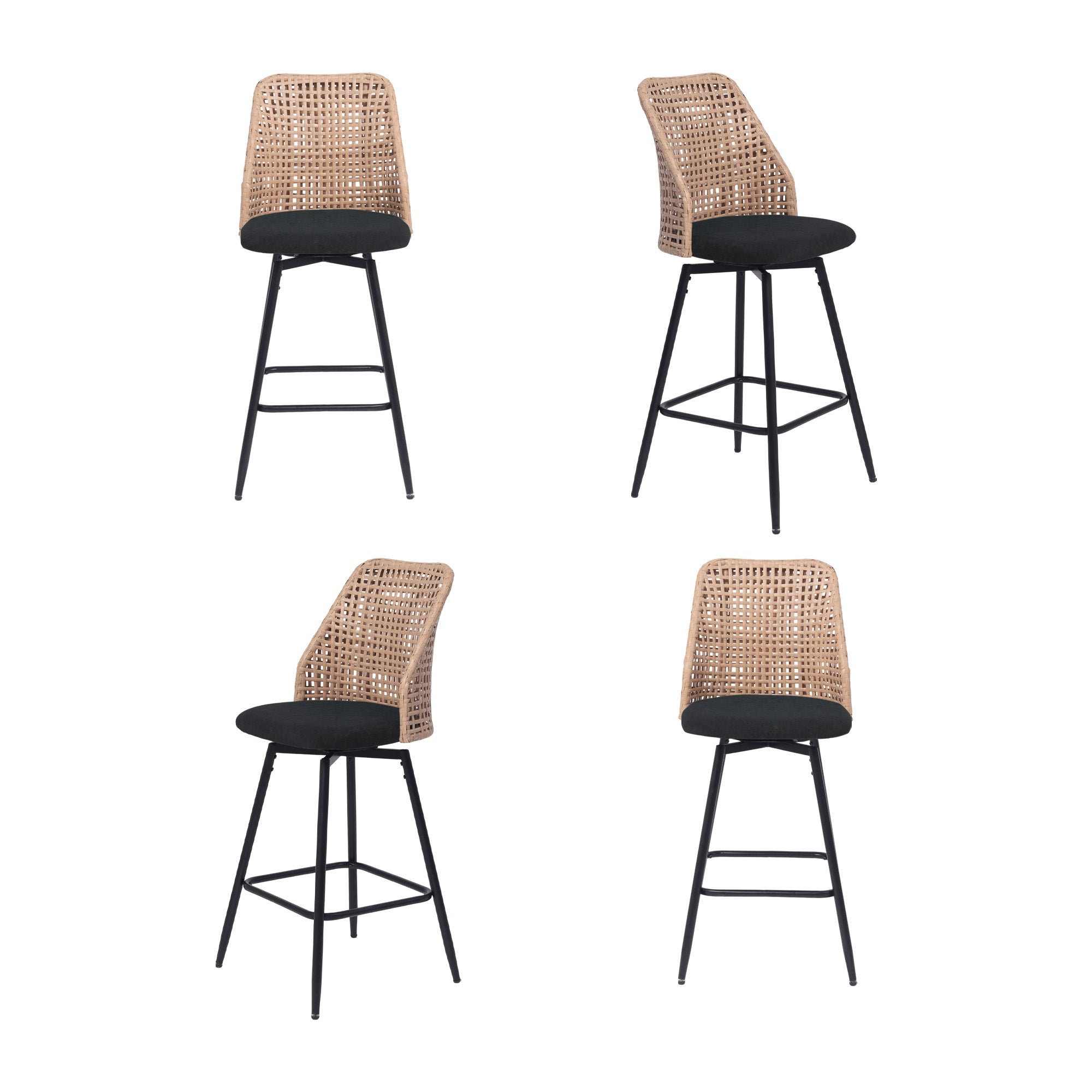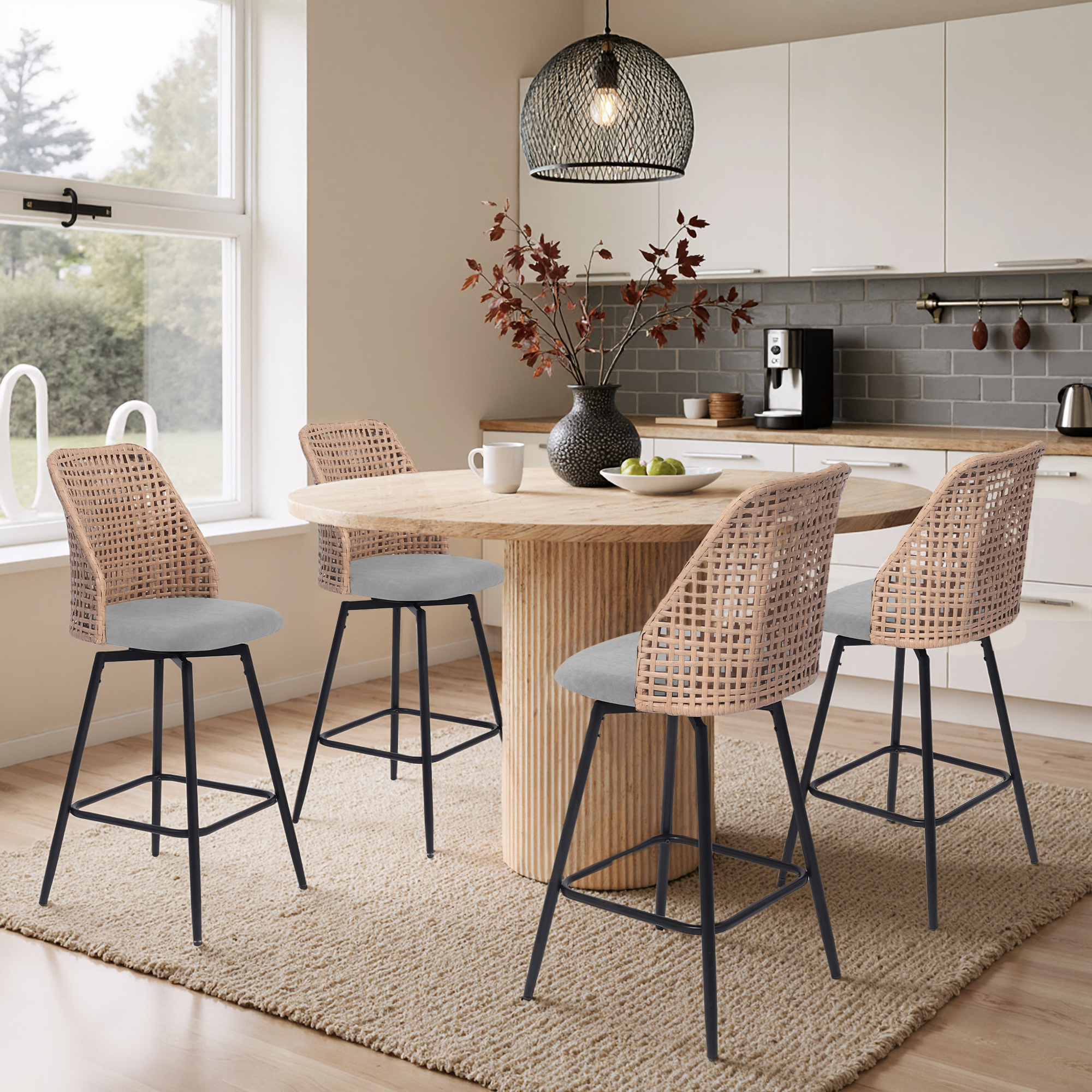 Spin from snack prep to conversation with our Ioneo Wicker Back Swivel Upholstered Bar Stools Set of 4. The mid-height backs use a wicker-style weaving technique that adds airy texture instead of bulk. Plush chenille over foam cushioning makes the round seats comfortable enough for lingering at bar height. A built-in 360-degree swivel plate lets you turn smoothly toward friends, counters, or screens. Slim metal legs, a square footrest, and adjustable levelers steady each 28.7-inch seat so your bar setup feels balanced.