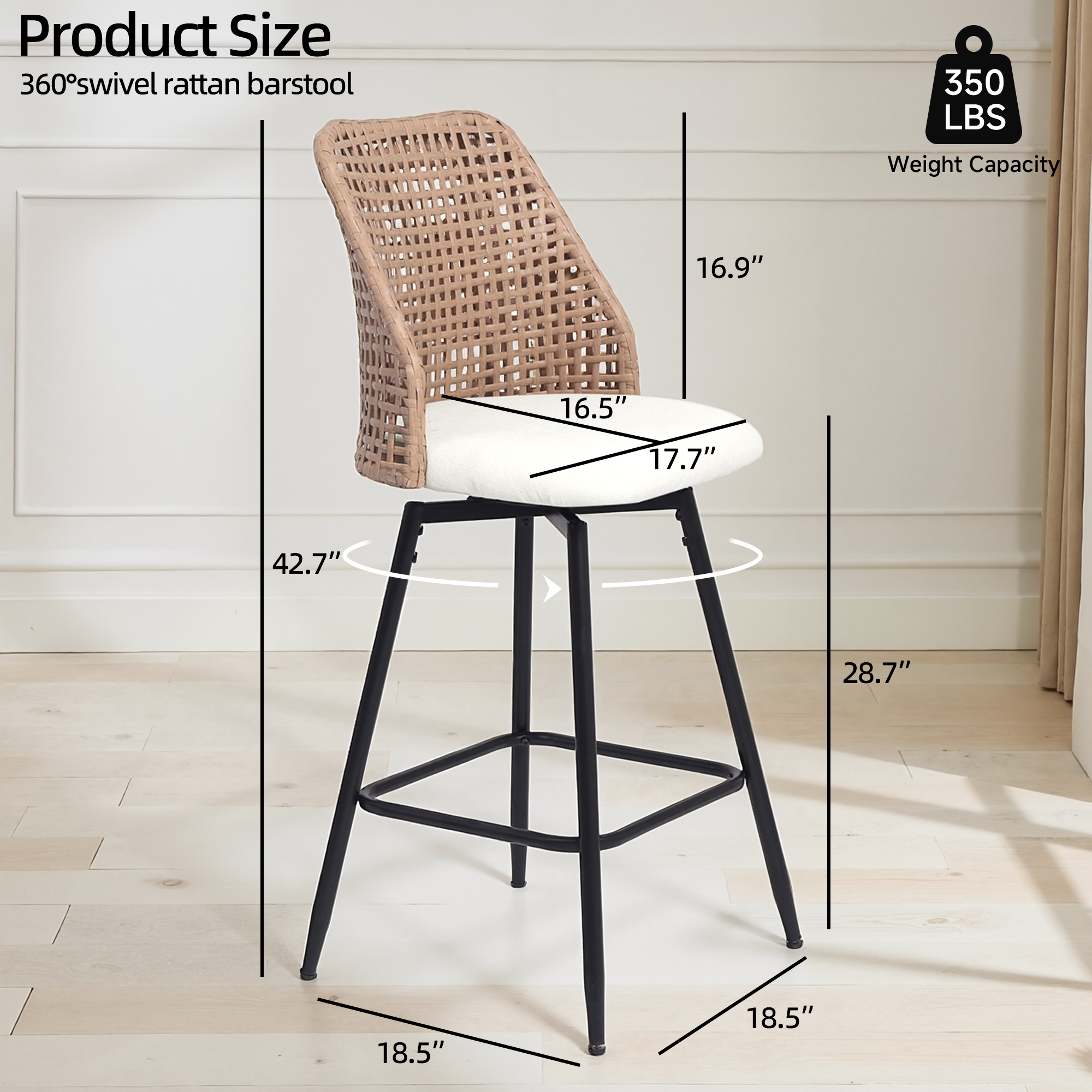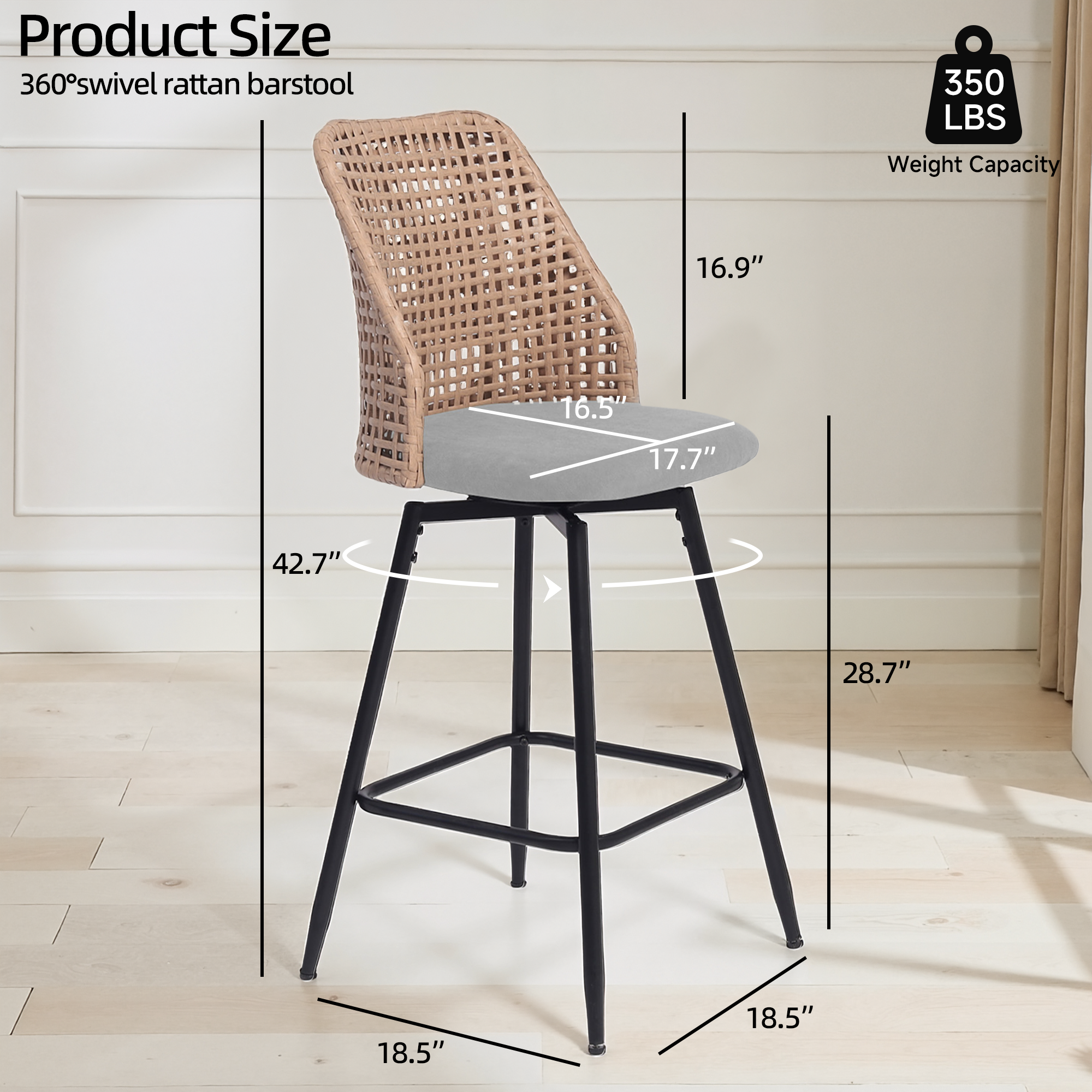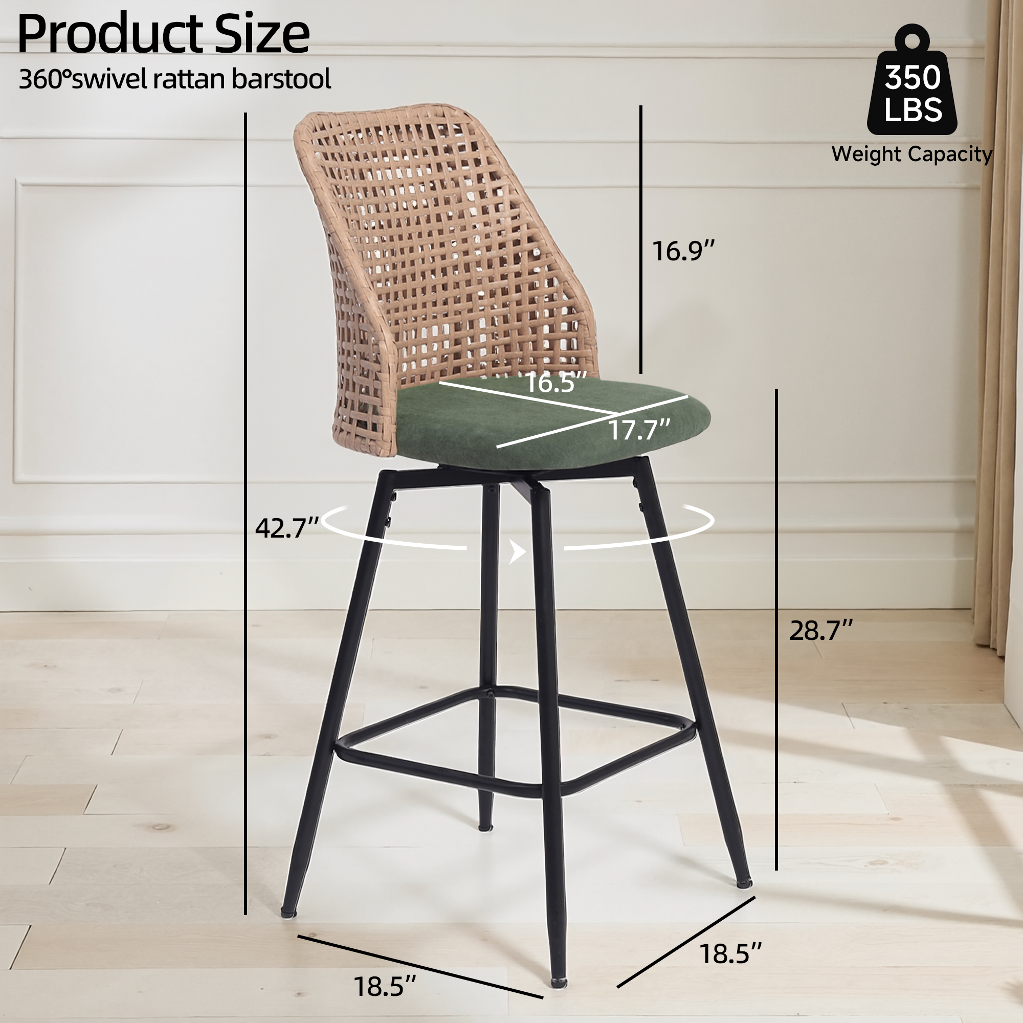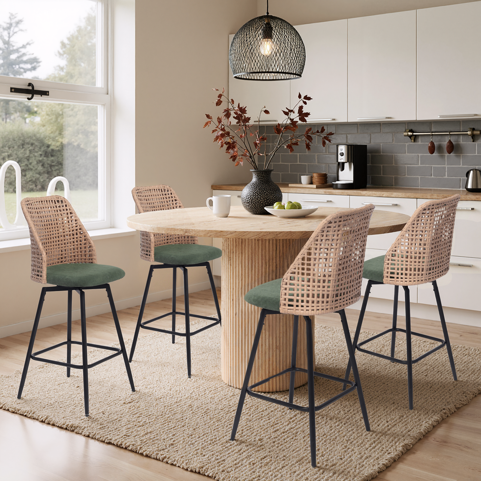Spin from snack prep to conversation with our Ioneo Wicker Back Swivel Upholstered Bar Stools Set of 4. The mid-height backs use a wicker-style weaving technique that adds airy texture instead of bulk. Plush chenille over foam cushioning makes the round seats comfortable enough for lingering at bar height. A built-in 360-degree swivel plate lets you turn smoothly toward friends, counters, or screens. Slim metal legs, a square footrest, and adjustable levelers steady each 28.7-inch seat so your bar setup feels balanced.