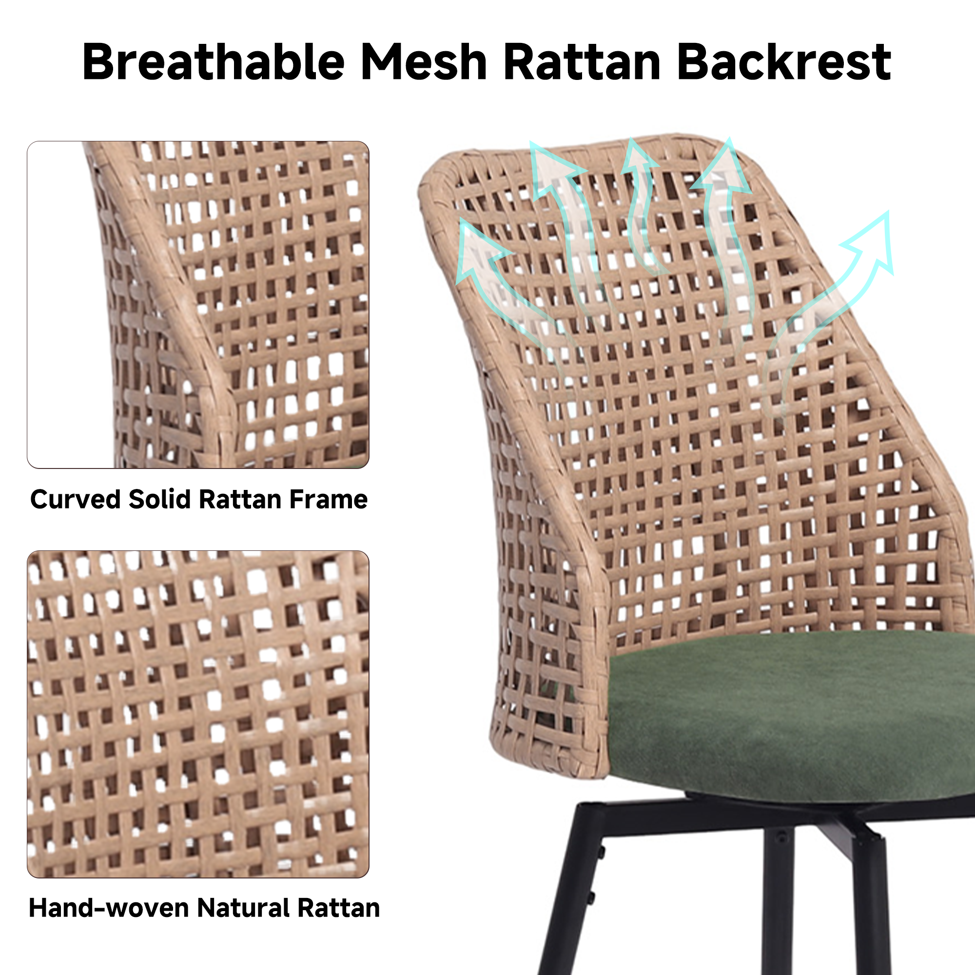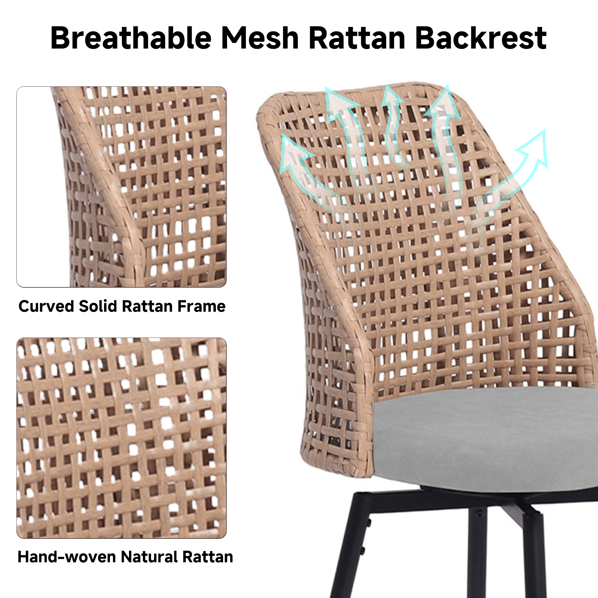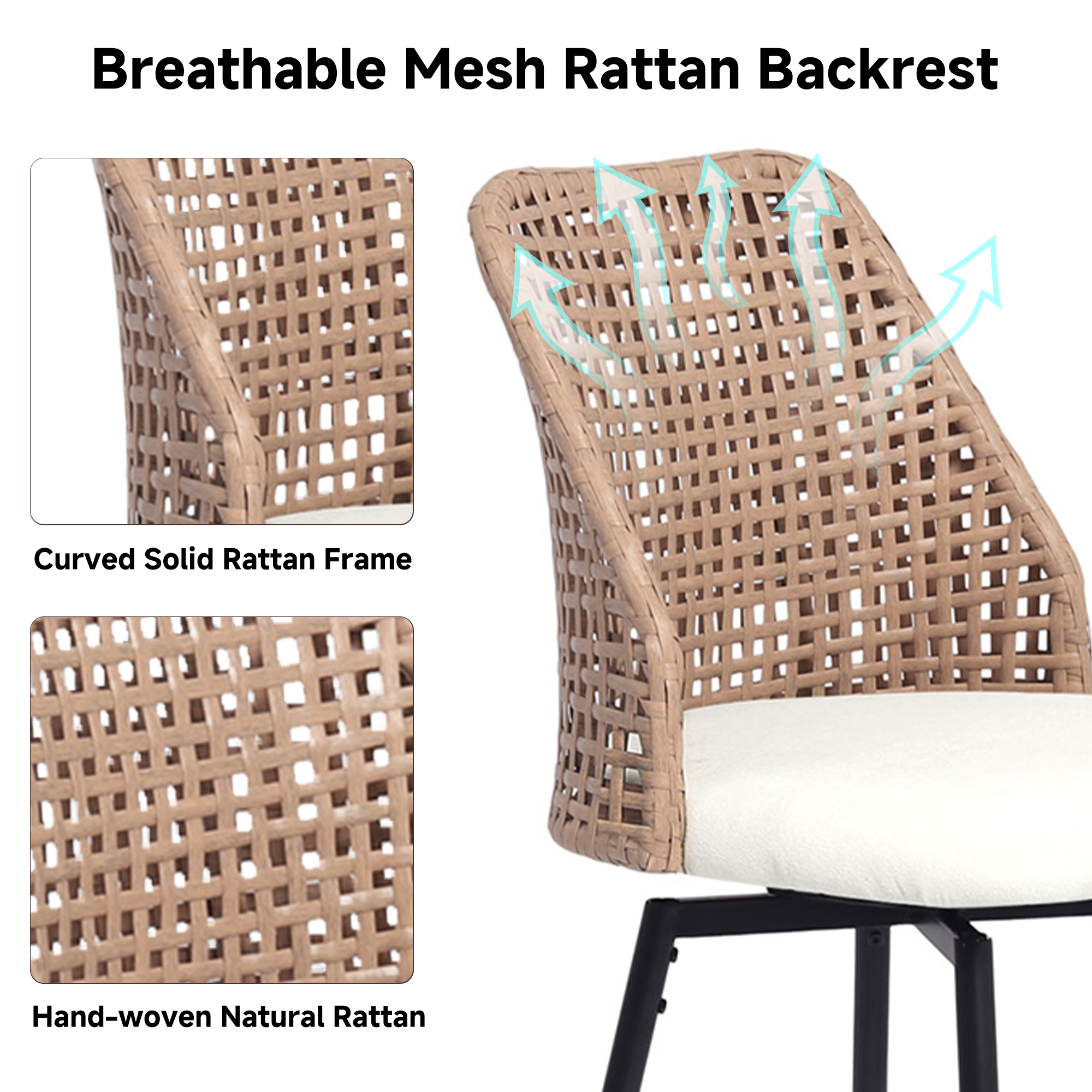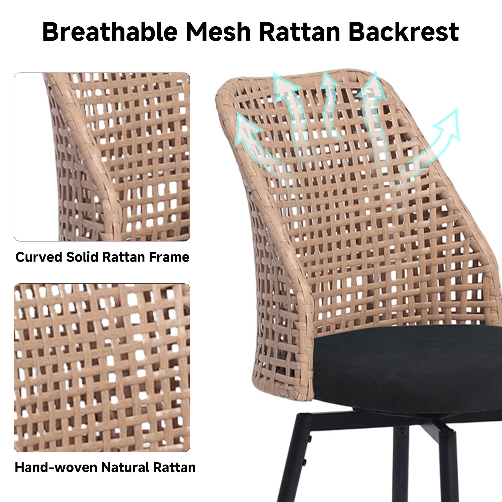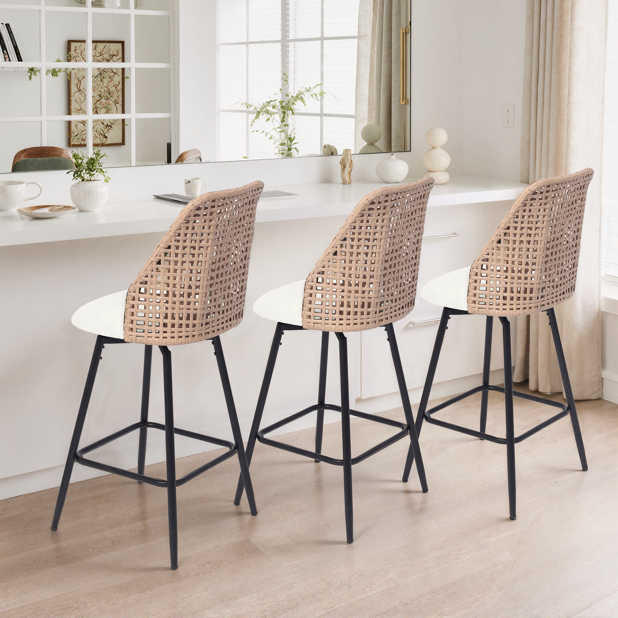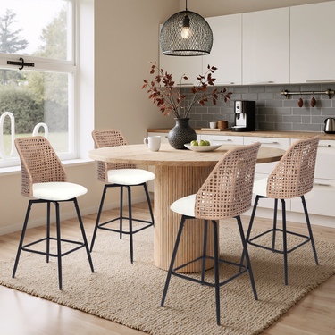 ¡¤ Wicker-style woven backs highlight a coastal-inspired weaving technique while keeping the stools visually light and open