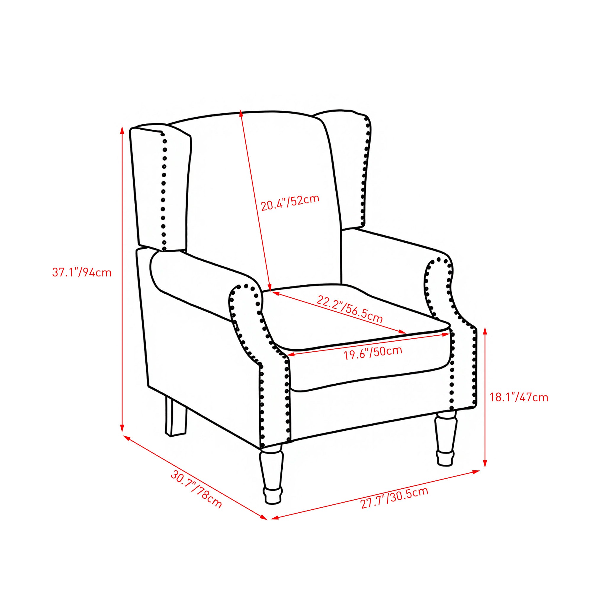 Timeless Wingback Design: Featuring brass nailhead trim and round arms, this chair embodies a classic French country style with a touch of elegance.