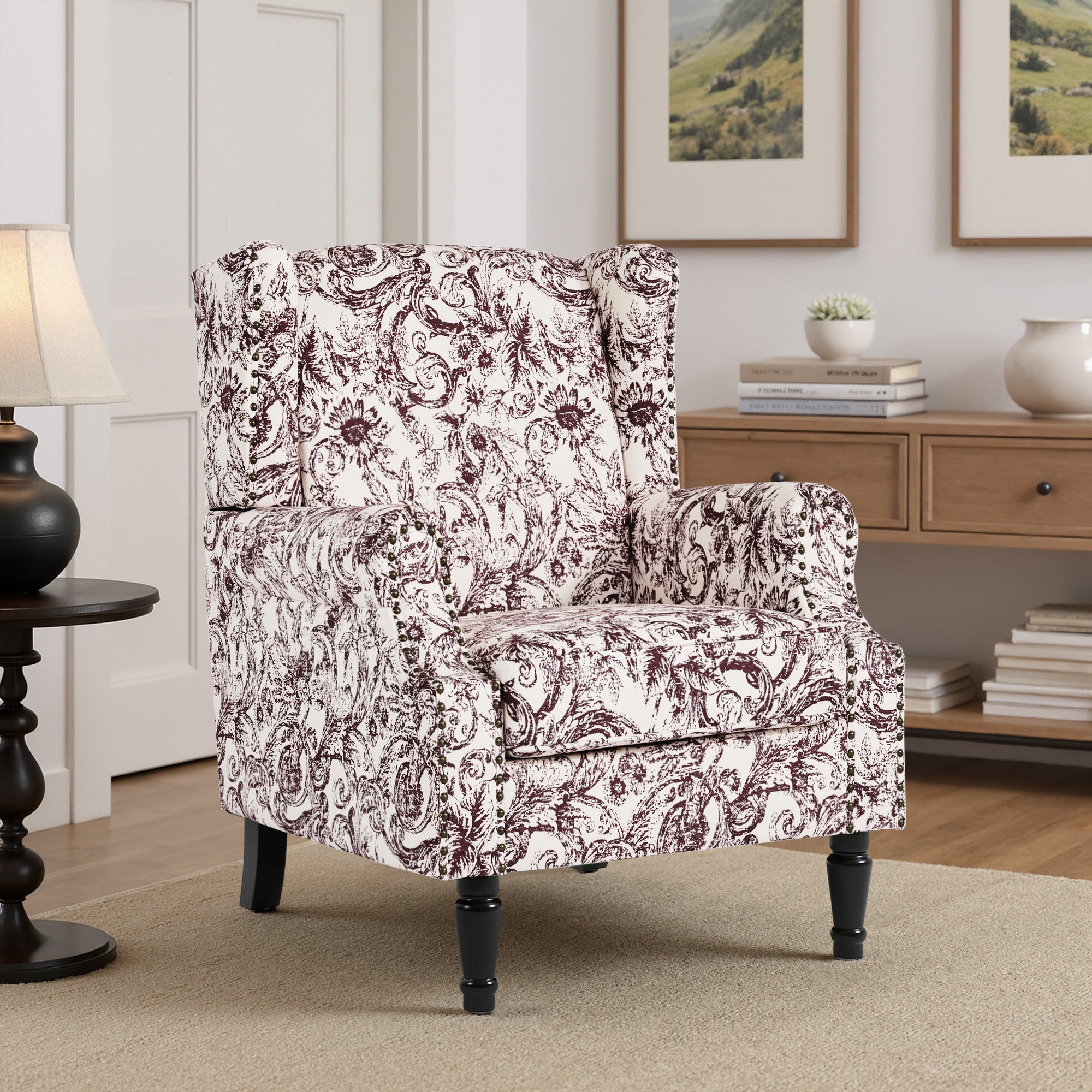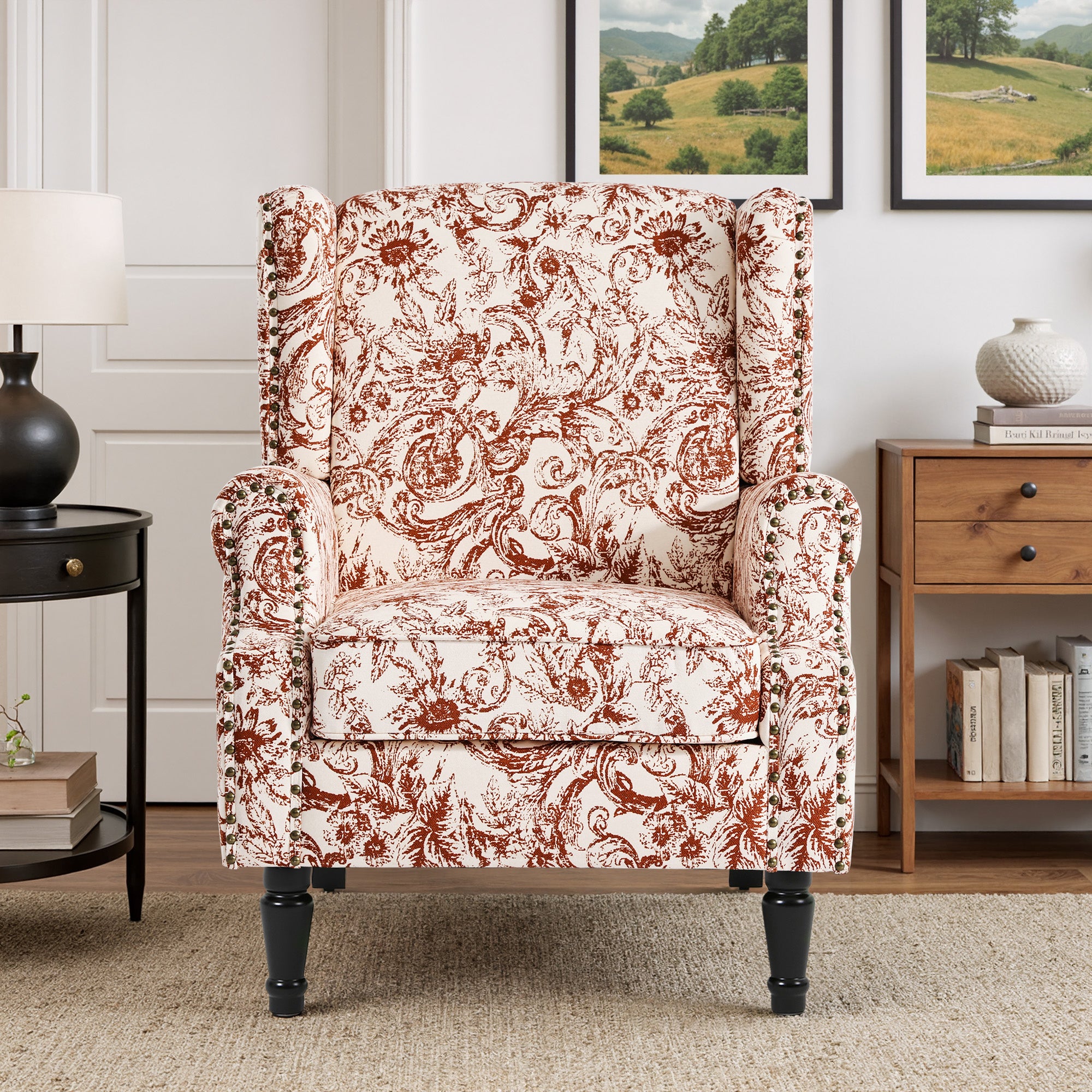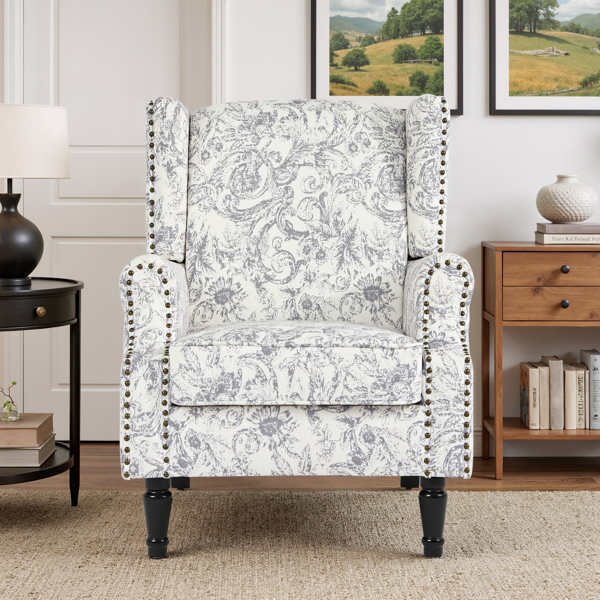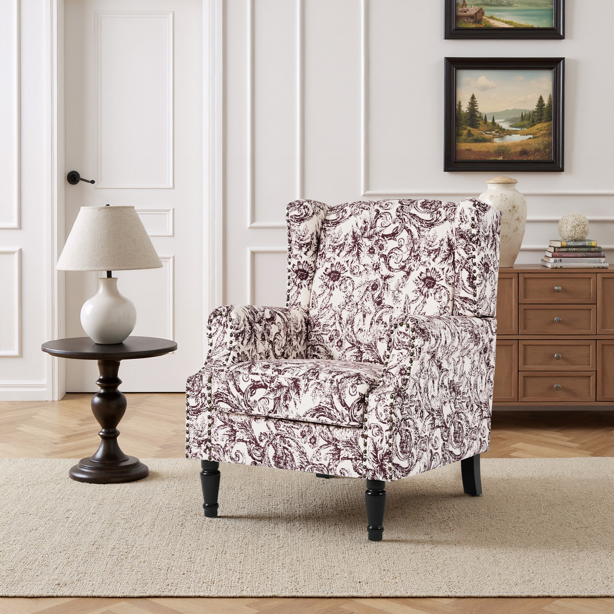 Elevate your home décor with this elegant wingback accent chair, designed to bring a vintage French country charm to any room. Featuring a solid wood frame, tapered walnut legs, and floral upholstery, it combines timeless style with modern comfort. The brass nailhead trim and high-density foam cushioning ensure both luxury and relaxation in your living space.