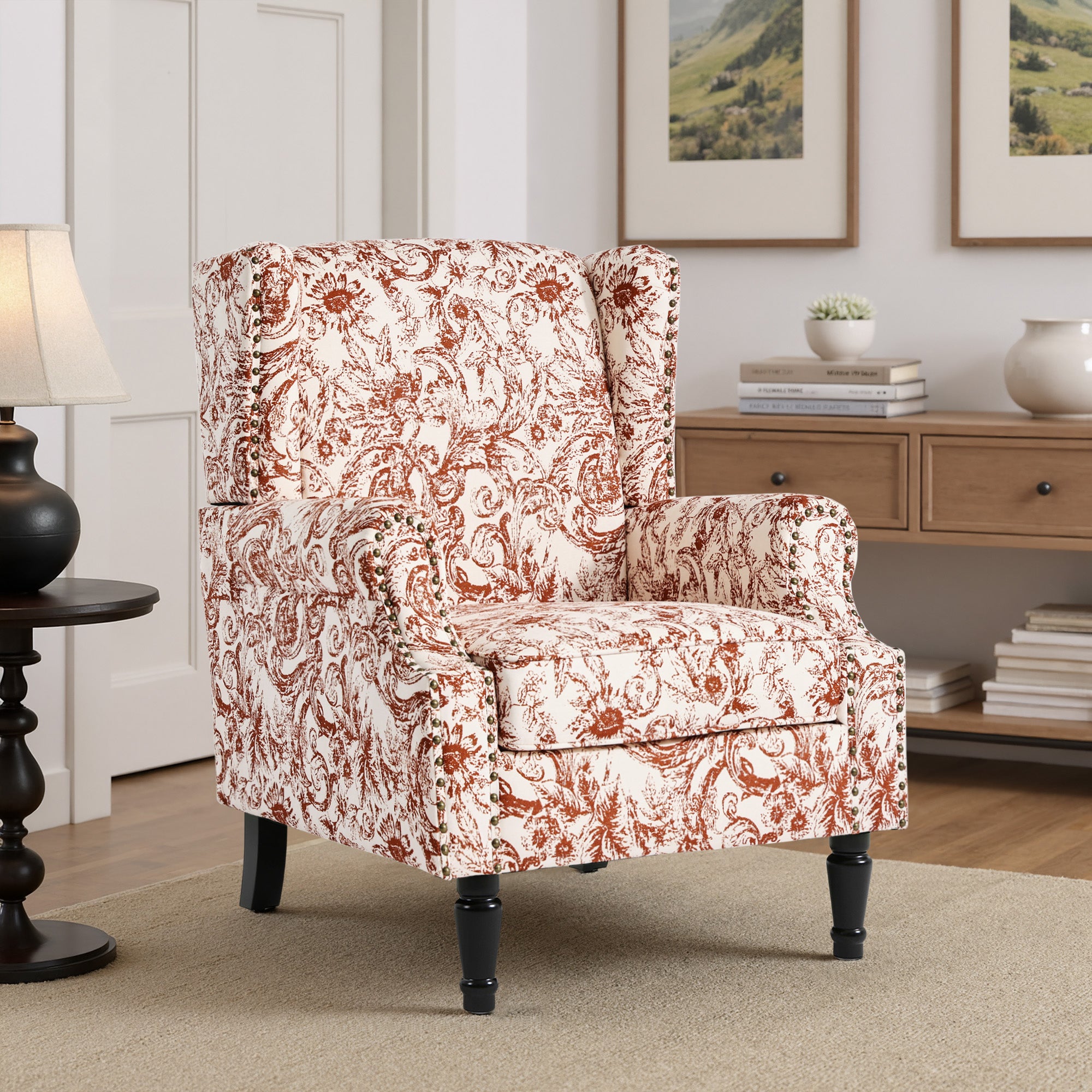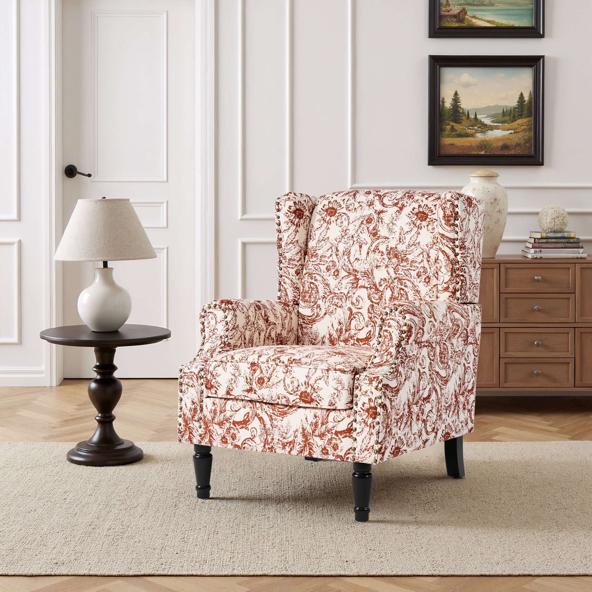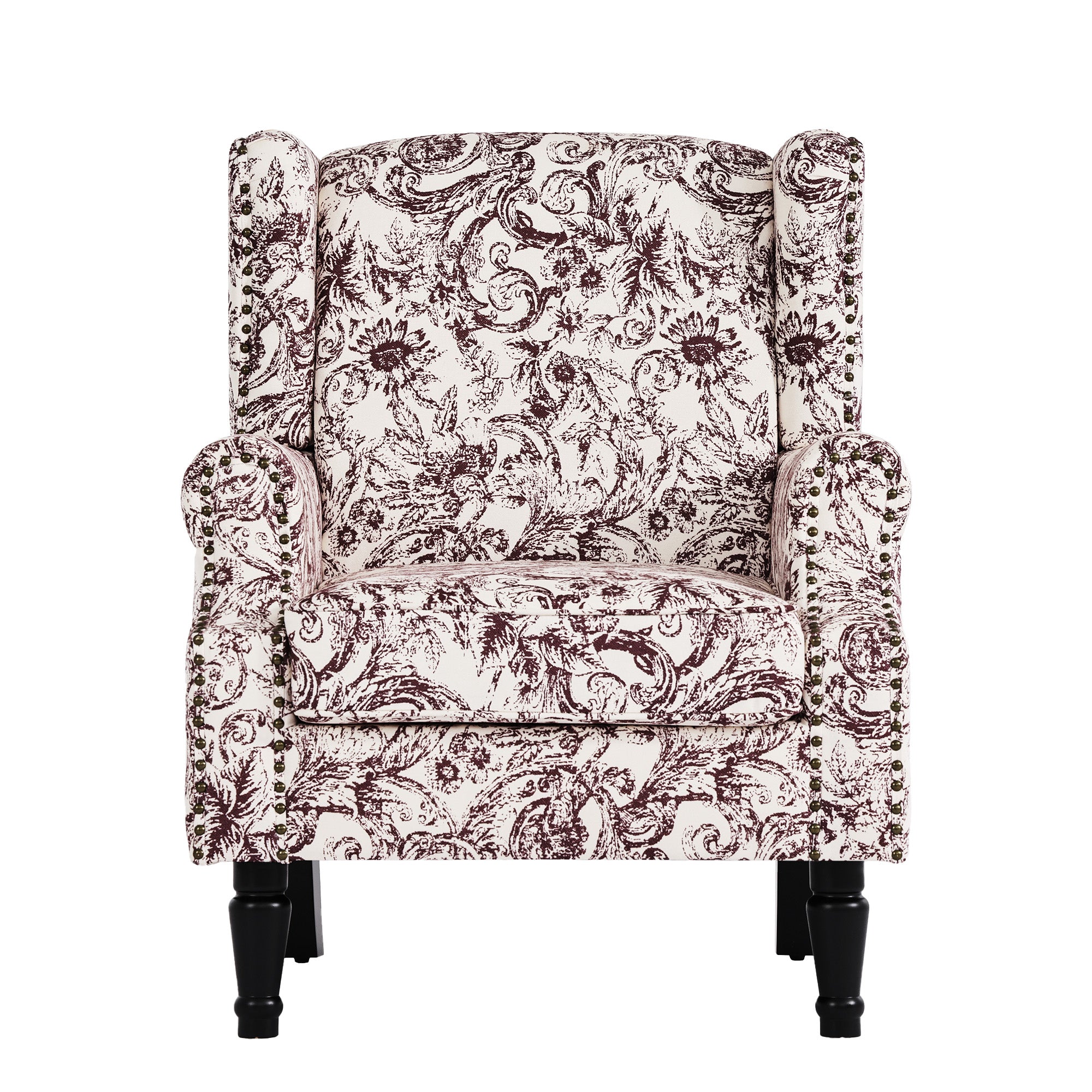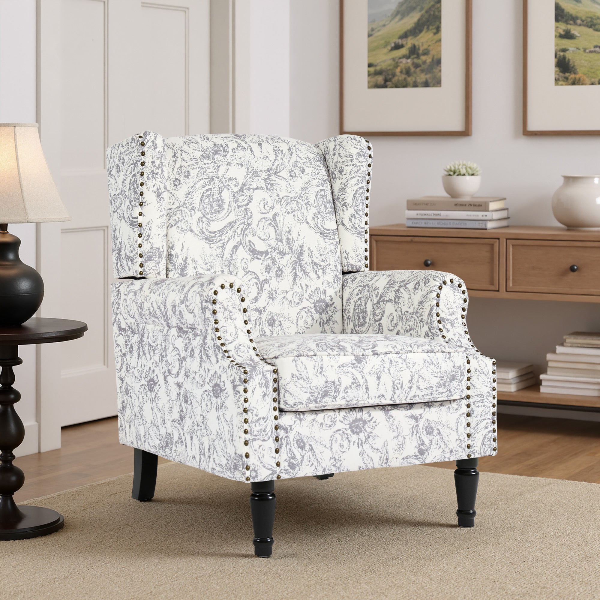 Elevate your home décor with this elegant wingback accent chair, designed to bring a vintage French country charm to any room. Featuring a solid wood frame, tapered walnut legs, and floral upholstery, it combines timeless style with modern comfort. The brass nailhead trim and high-density foam cushioning ensure both luxury and relaxation in your living space.