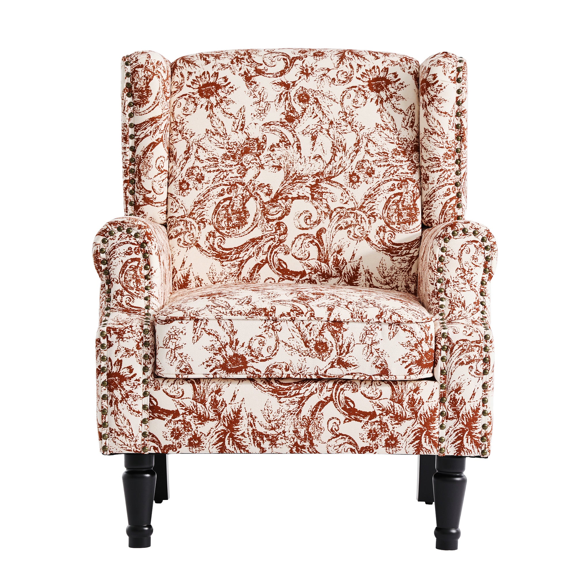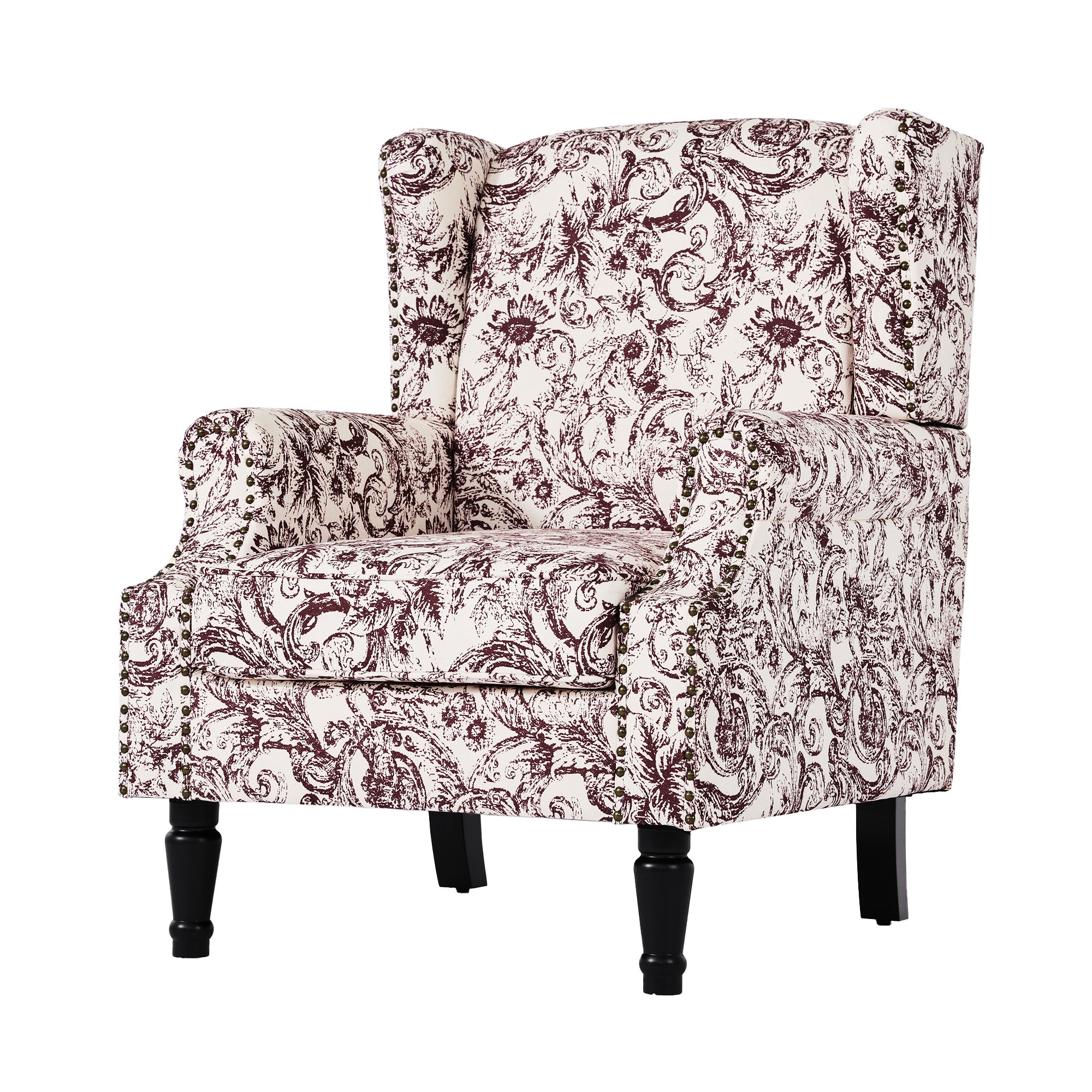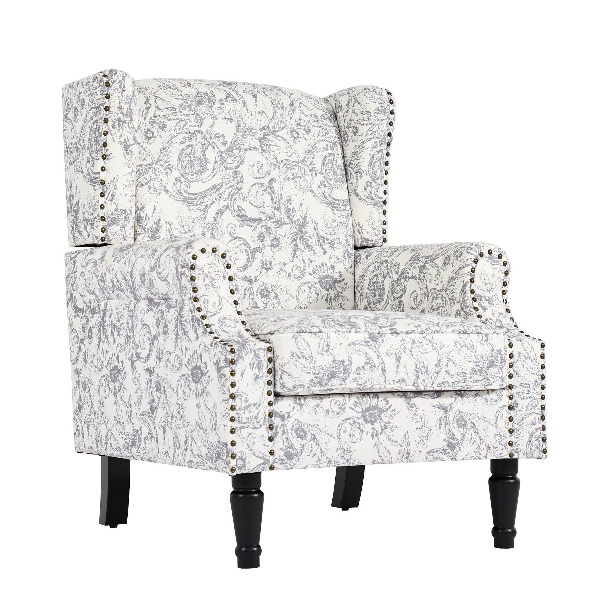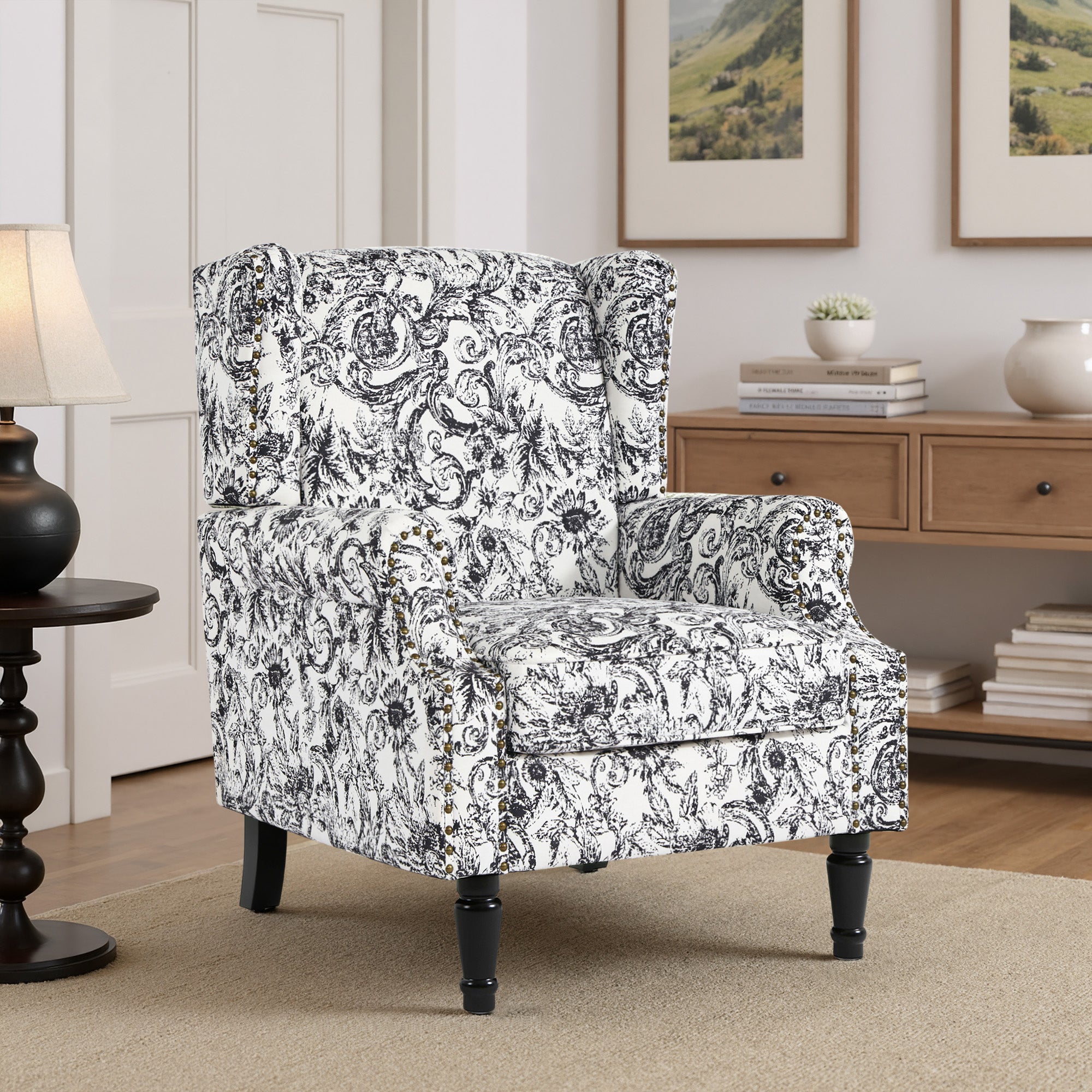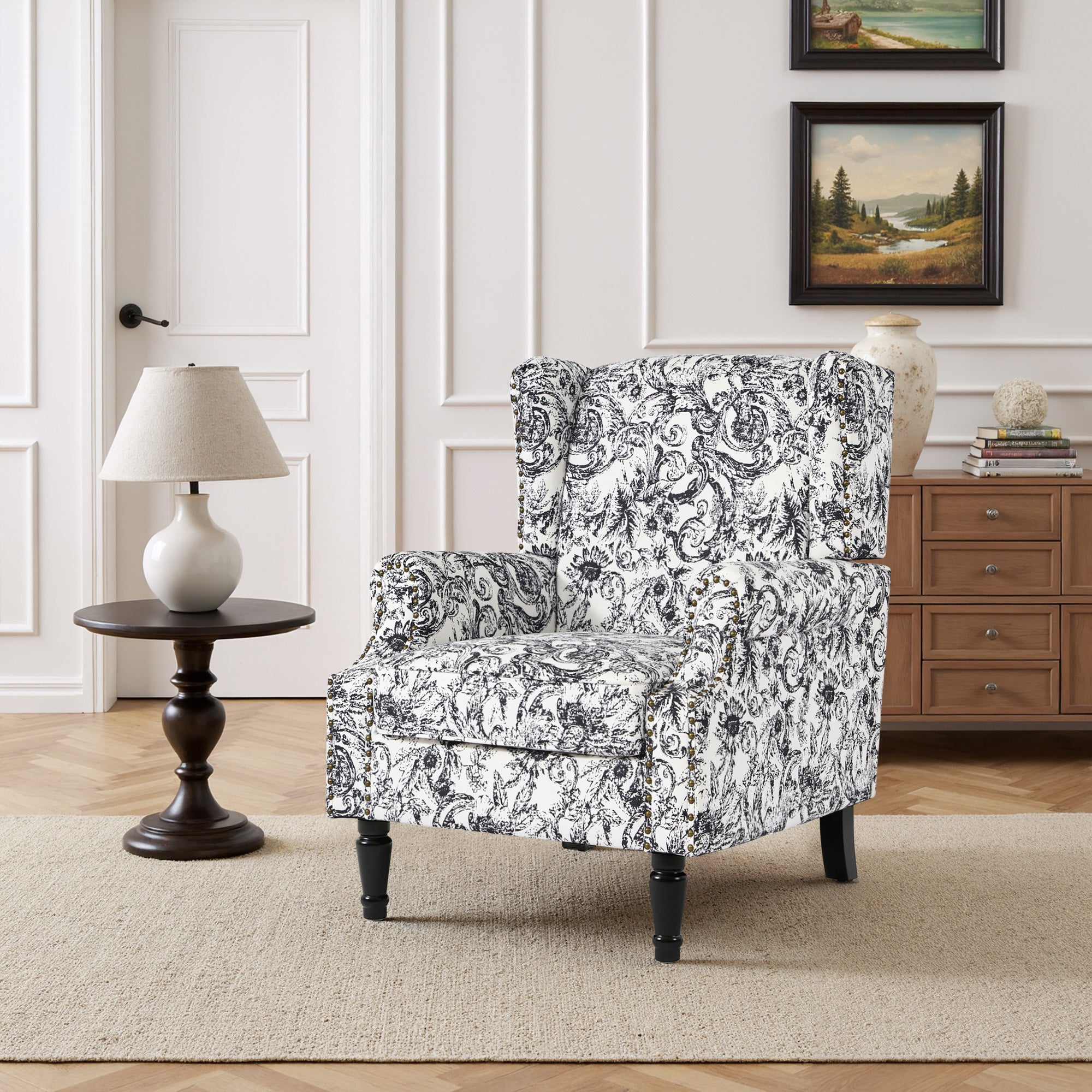Elevate your home décor with this elegant wingback accent chair, designed to bring a vintage French country charm to any room. Featuring a solid wood frame, tapered walnut legs, and floral upholstery, it combines timeless style with modern comfort. The brass nailhead trim and high-density foam cushioning ensure both luxury and relaxation in your living space.