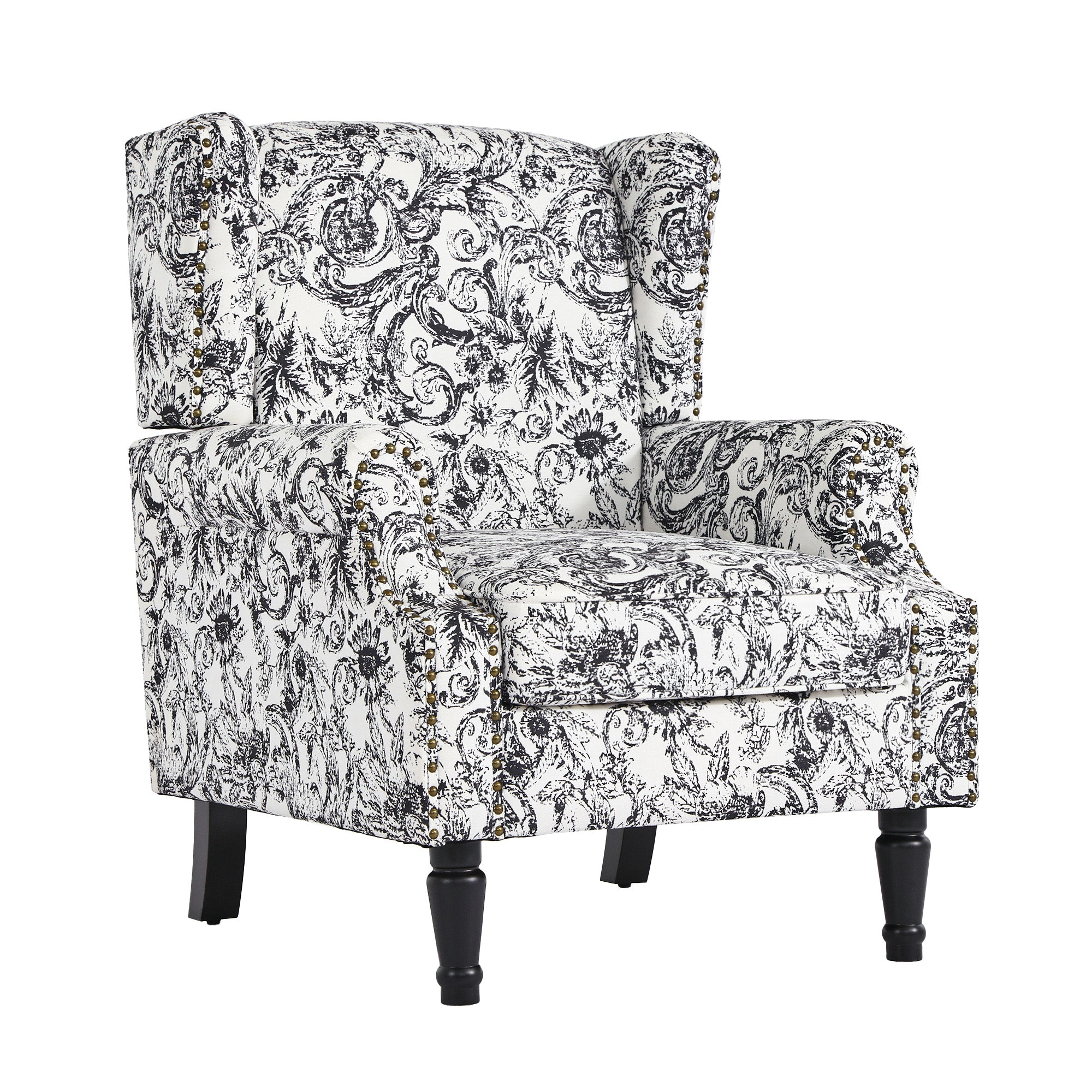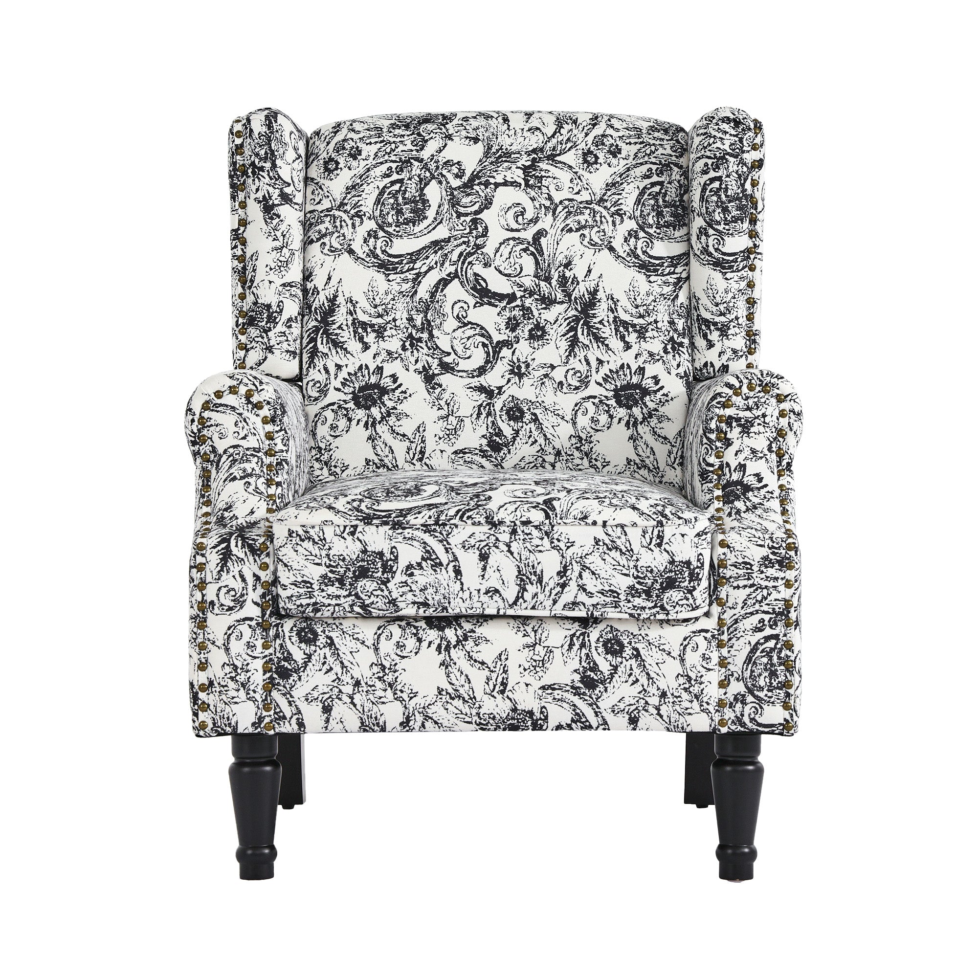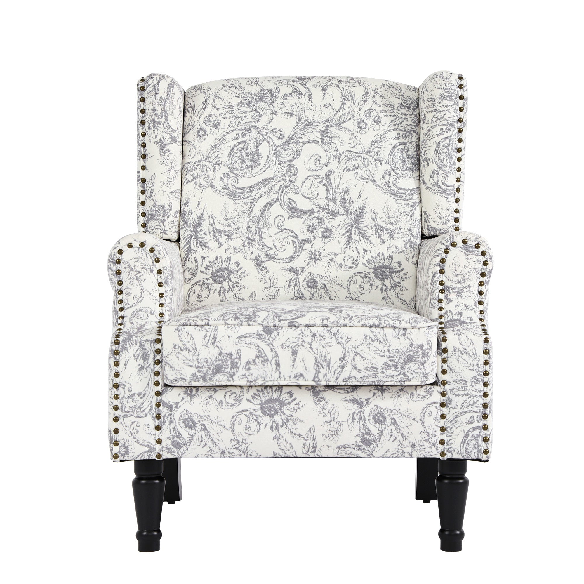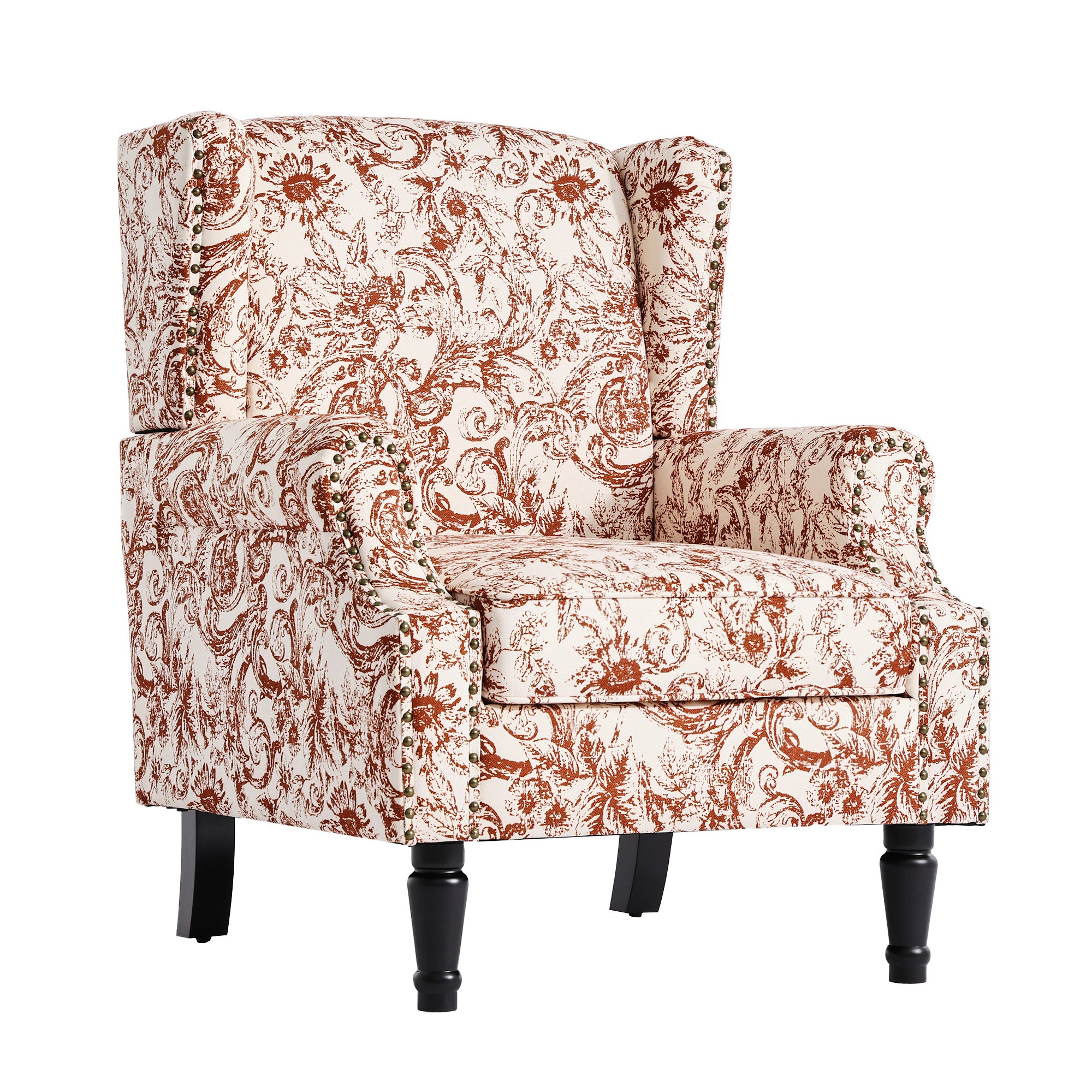 Elevate your home décor with this elegant wingback accent chair, designed to bring a vintage French country charm to any room. Featuring a solid wood frame, tapered walnut legs, and floral upholstery, it combines timeless style with modern comfort. The brass nailhead trim and high-density foam cushioning ensure both luxury and relaxation in your living space.