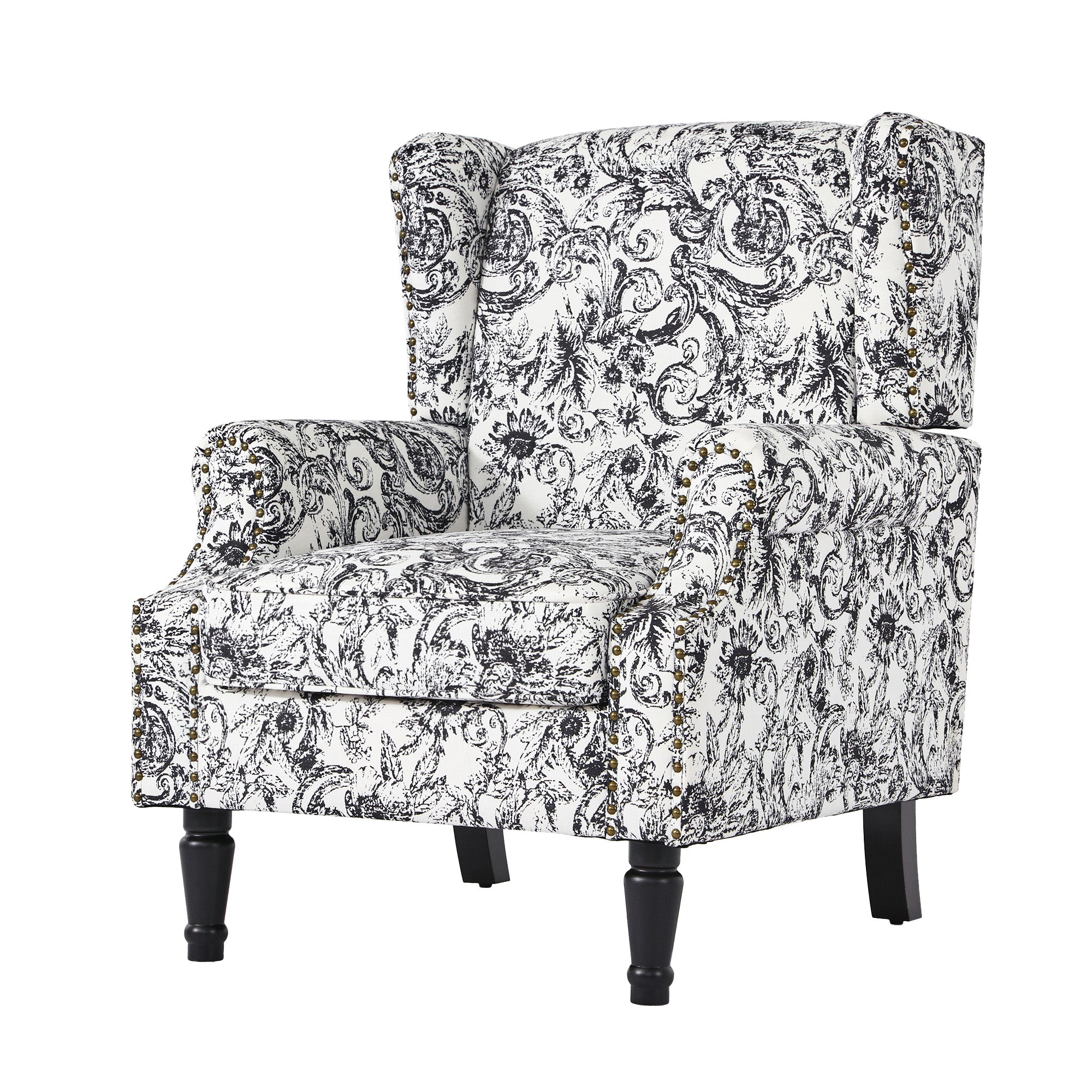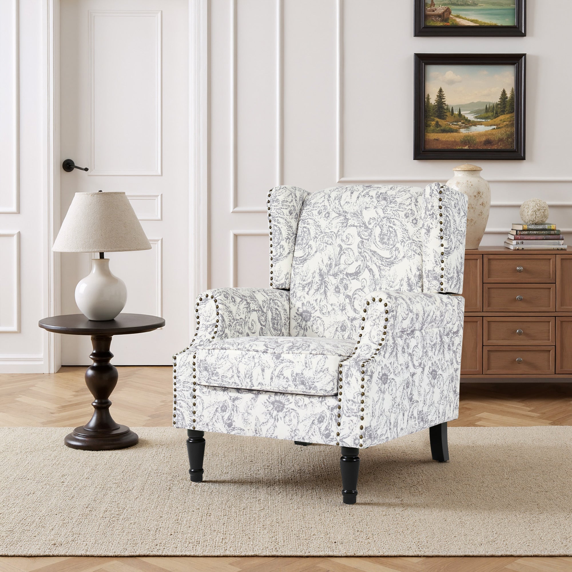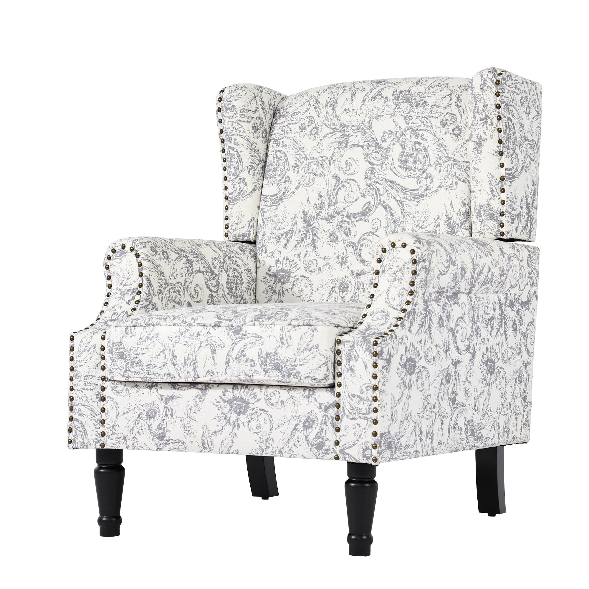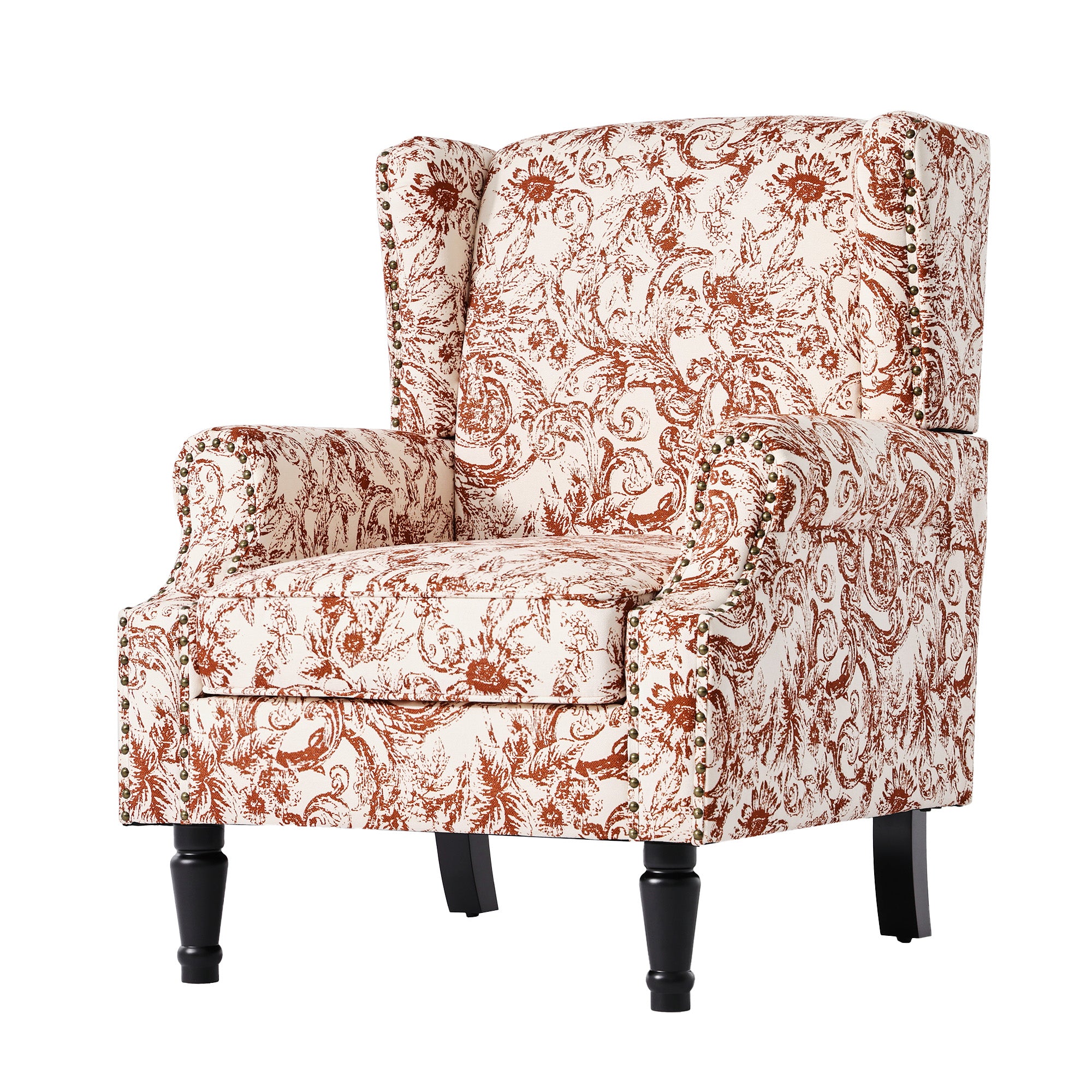 Elevate your home décor with this elegant wingback accent chair, designed to bring a vintage French country charm to any room. Featuring a solid wood frame, tapered walnut legs, and floral upholstery, it combines timeless style with modern comfort. The brass nailhead trim and high-density foam cushioning ensure both luxury and relaxation in your living space.