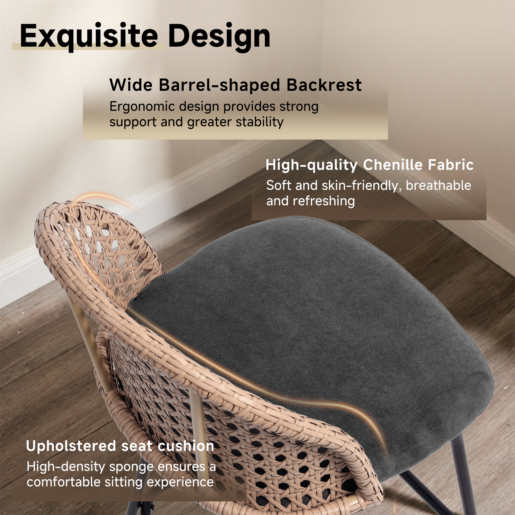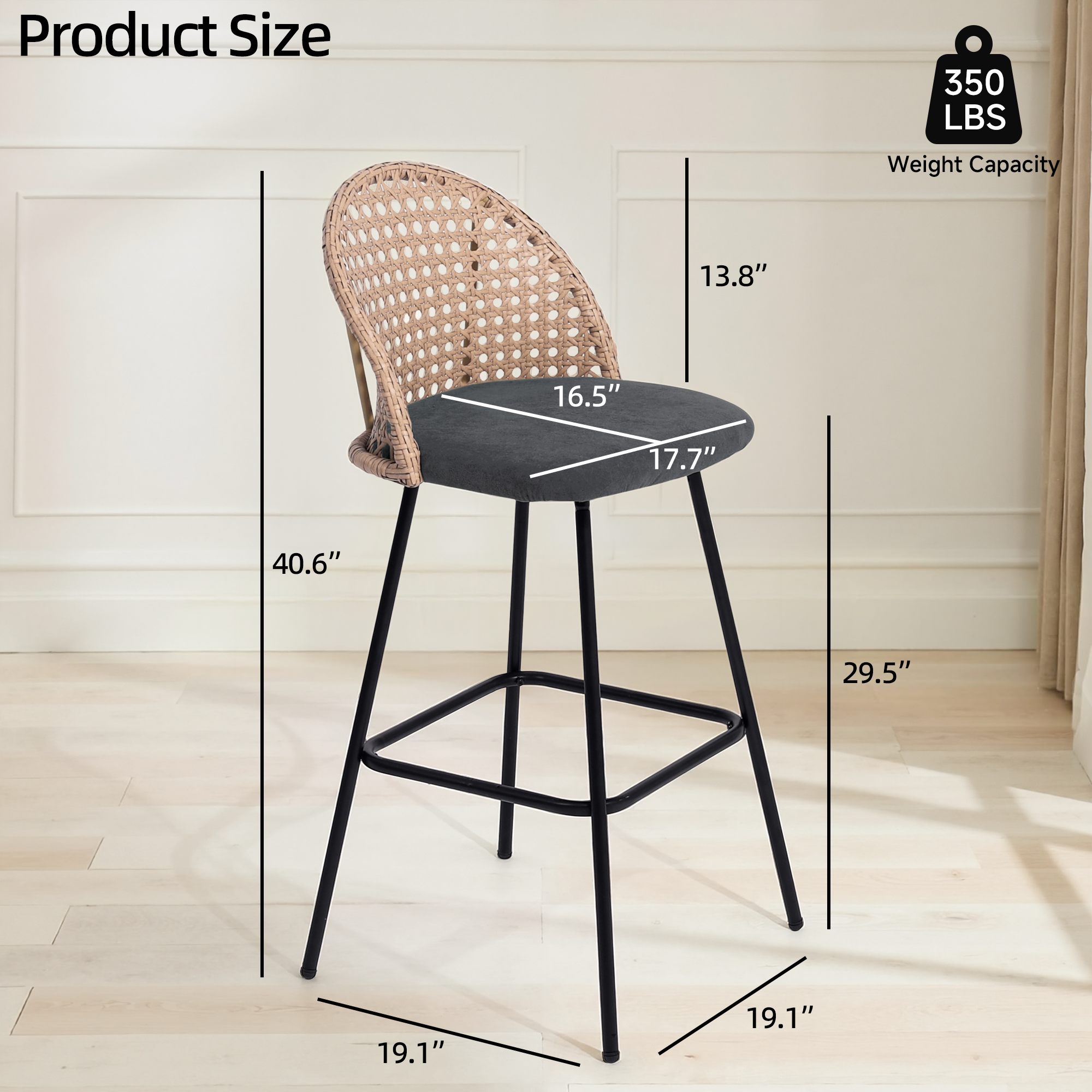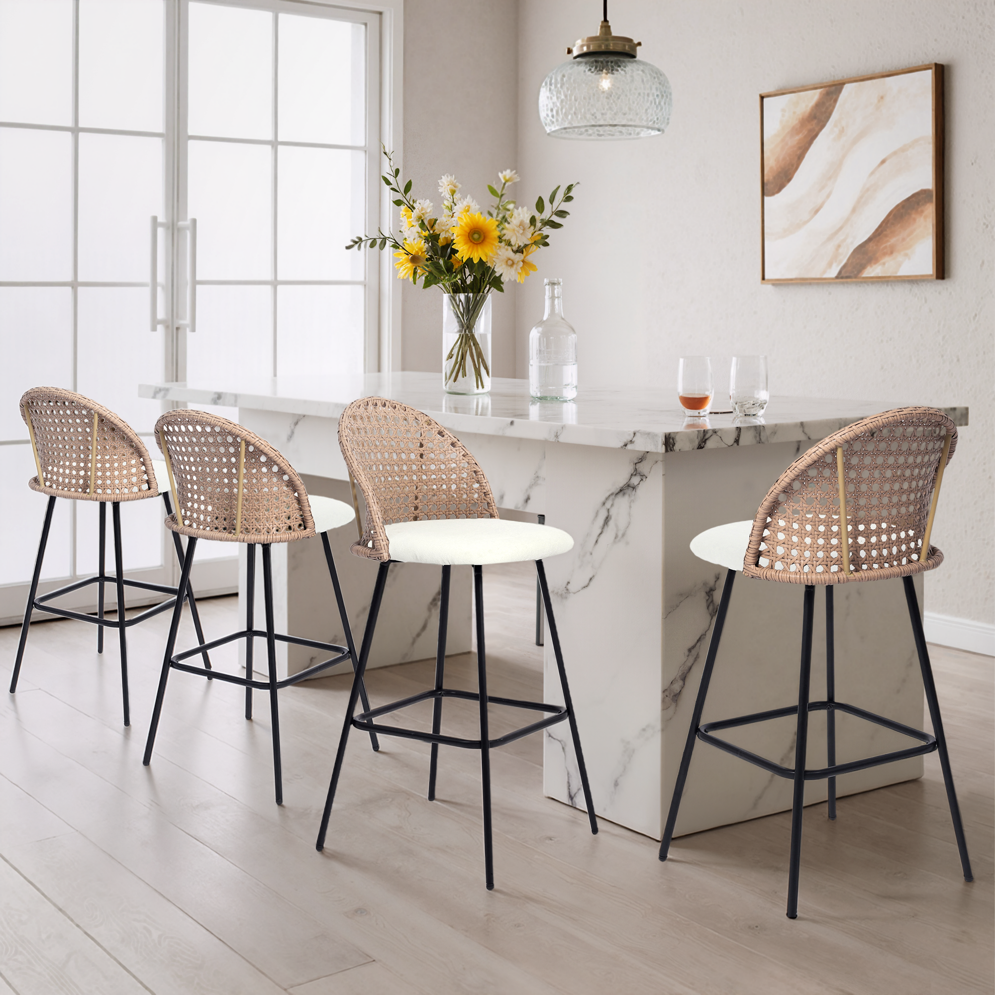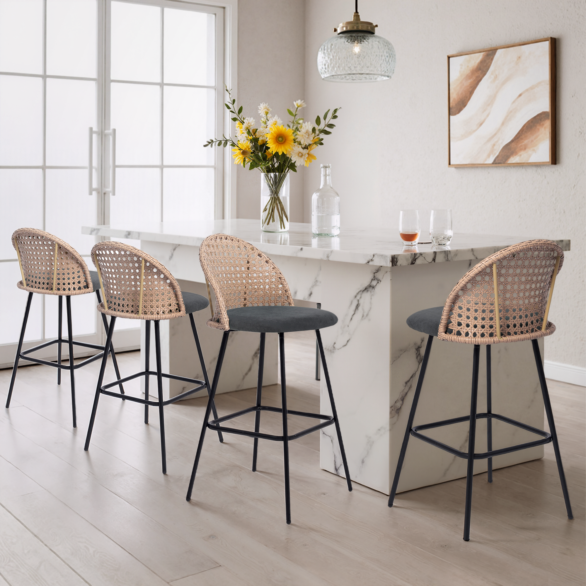 Bring an easy, breezy coastal mood to your home bar with our Oonagh Chenille Upholstered Wicker Back Bar Stools Set of 4. Curved backs showcase a wicker-style weaving technique that nods to rattan caf¨¦ seating while keeping the silhouettes light and open. Foam-padded chenille seats feel softly cushioned for long chats over drinks at bar height. Slender metal legs with a square footrest keep each perch feeling steady without looking heavy. Moreover, adjustable levelers at the feet help all four 29.5-inch seats sit even, so a full bar setup stays relaxed and balanced.