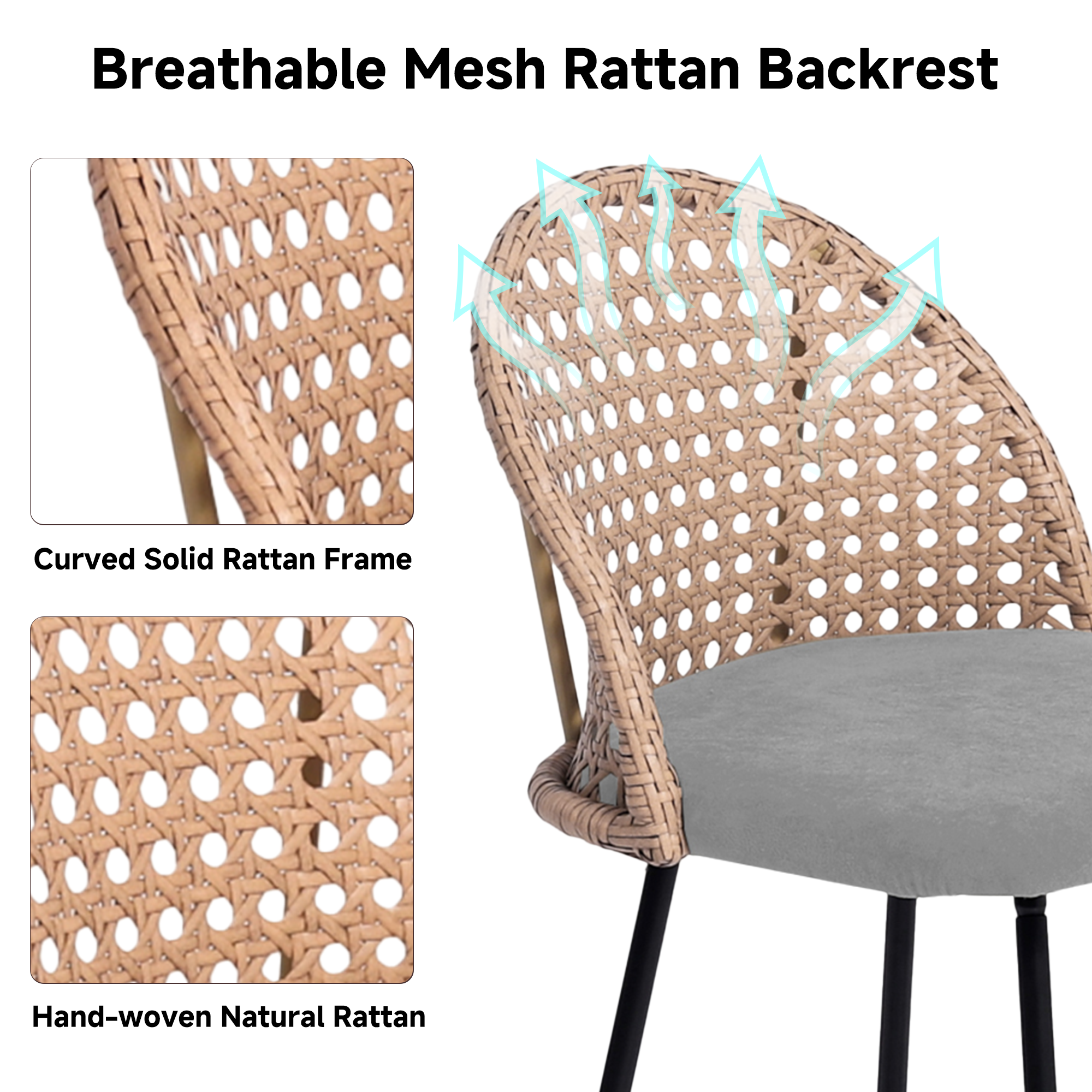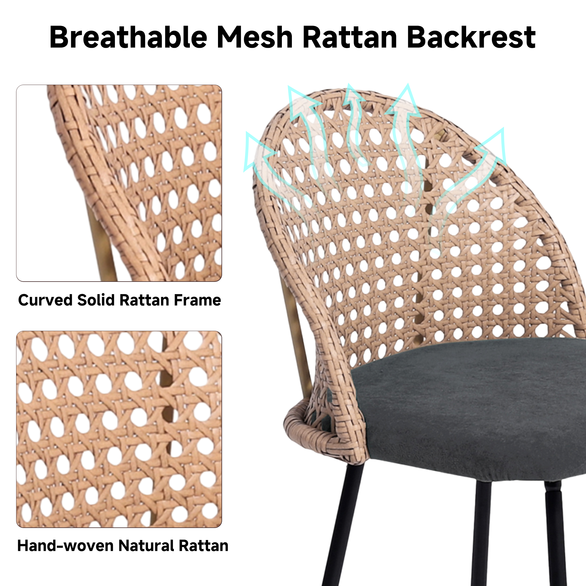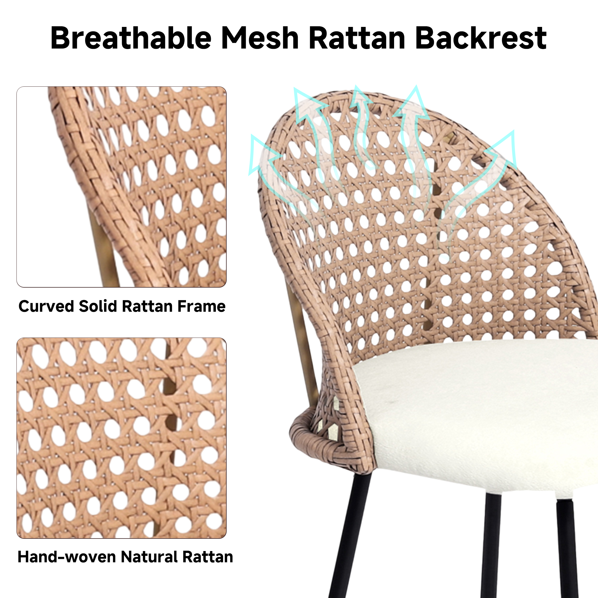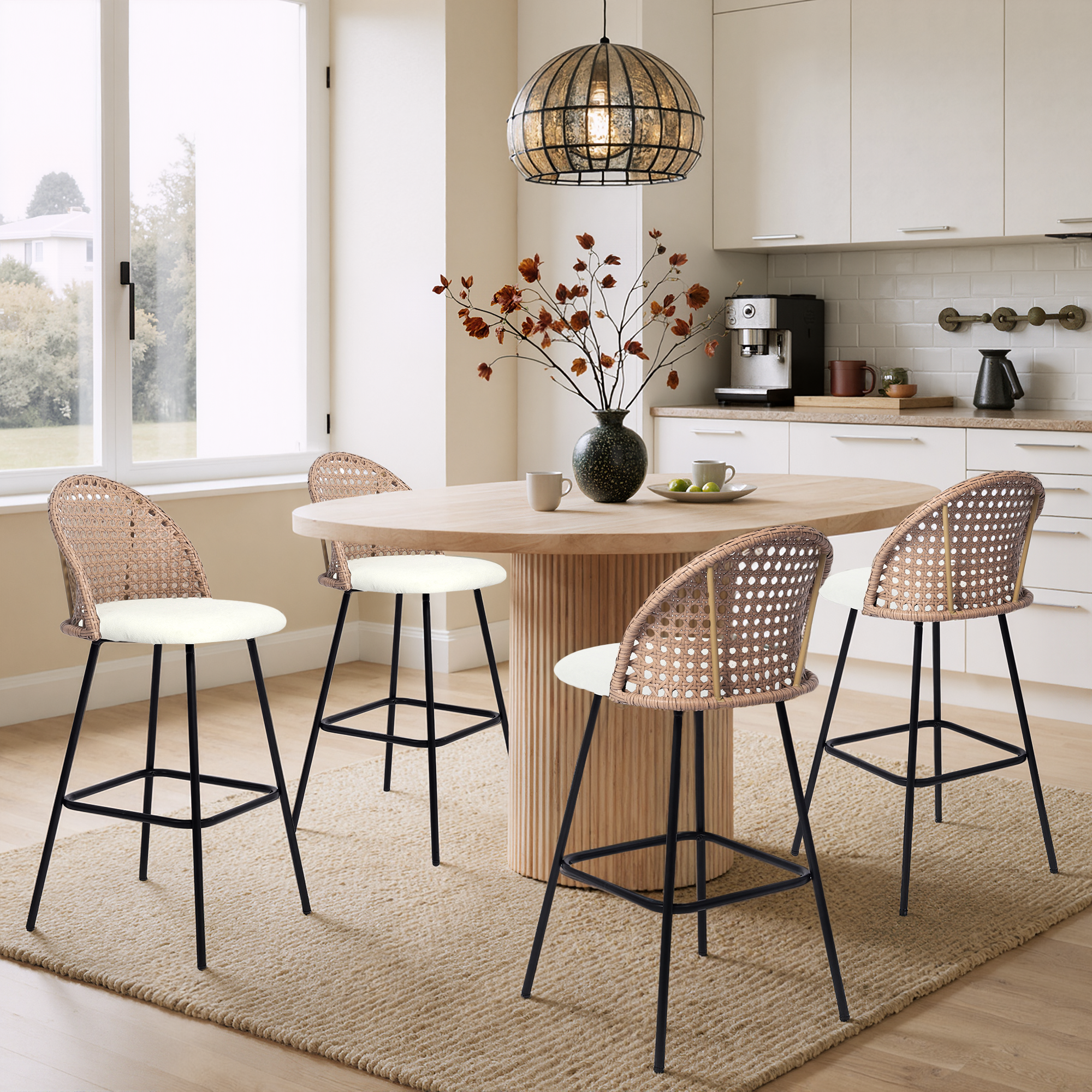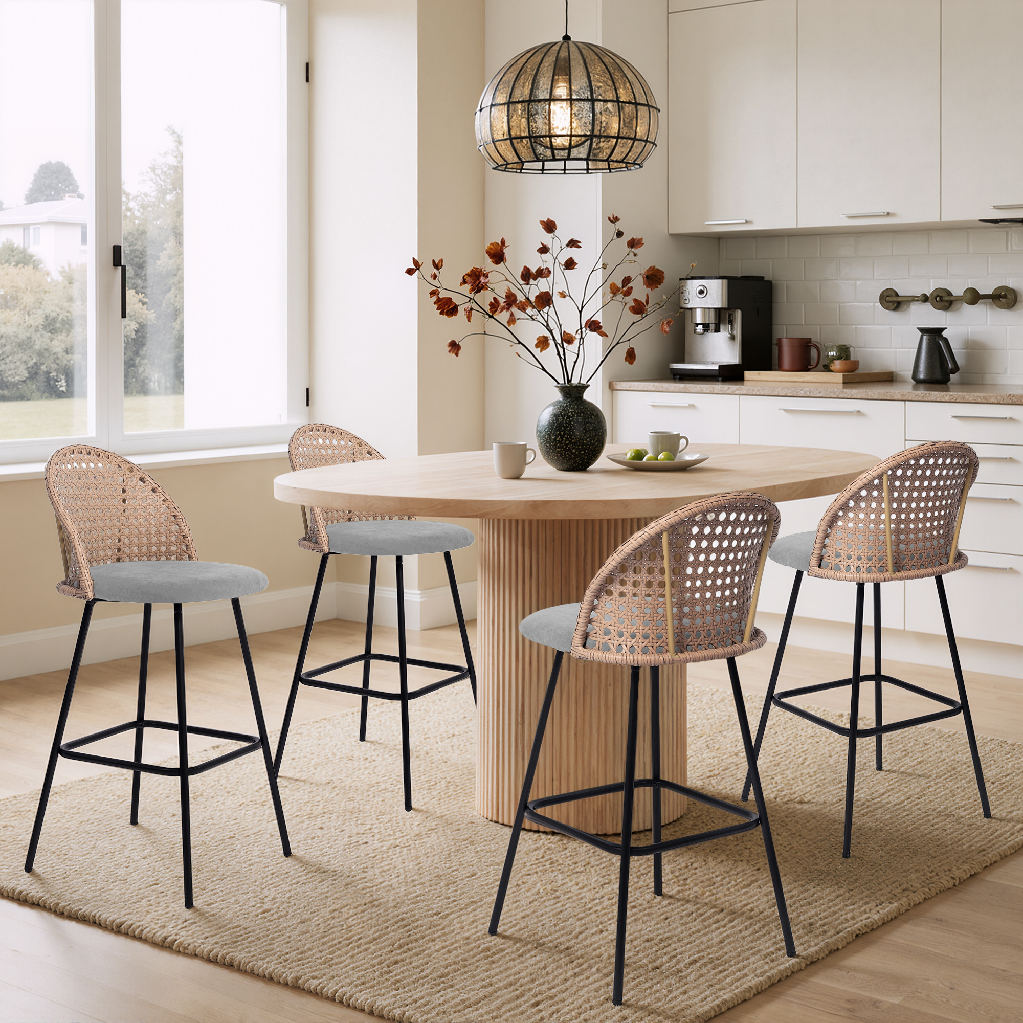 ¡¤ Wicker-style woven backs highlight a coastal-inspired weaving technique that keeps the stools feeling airy