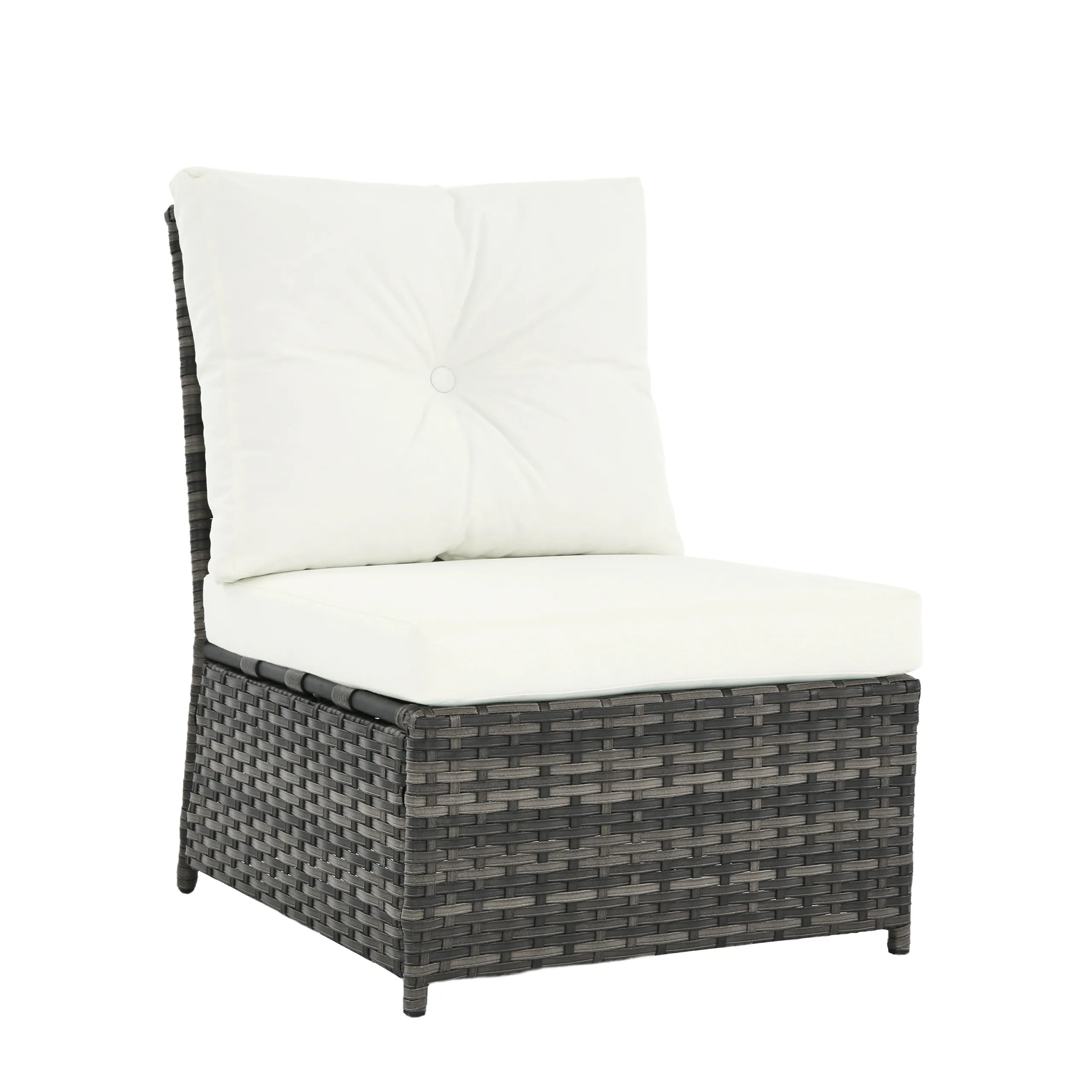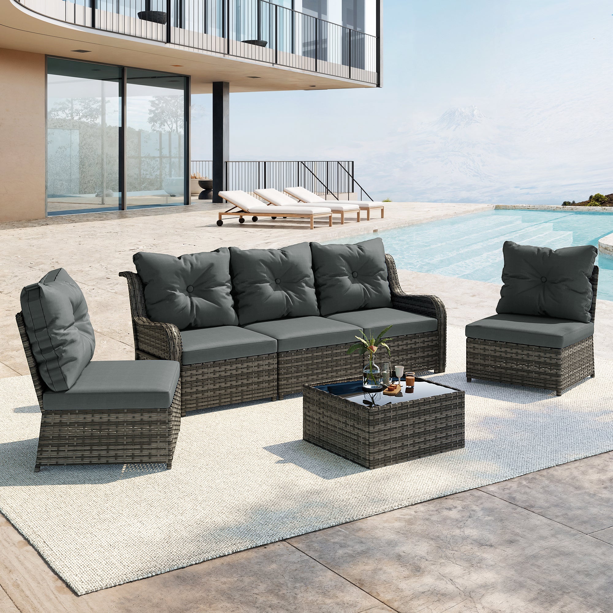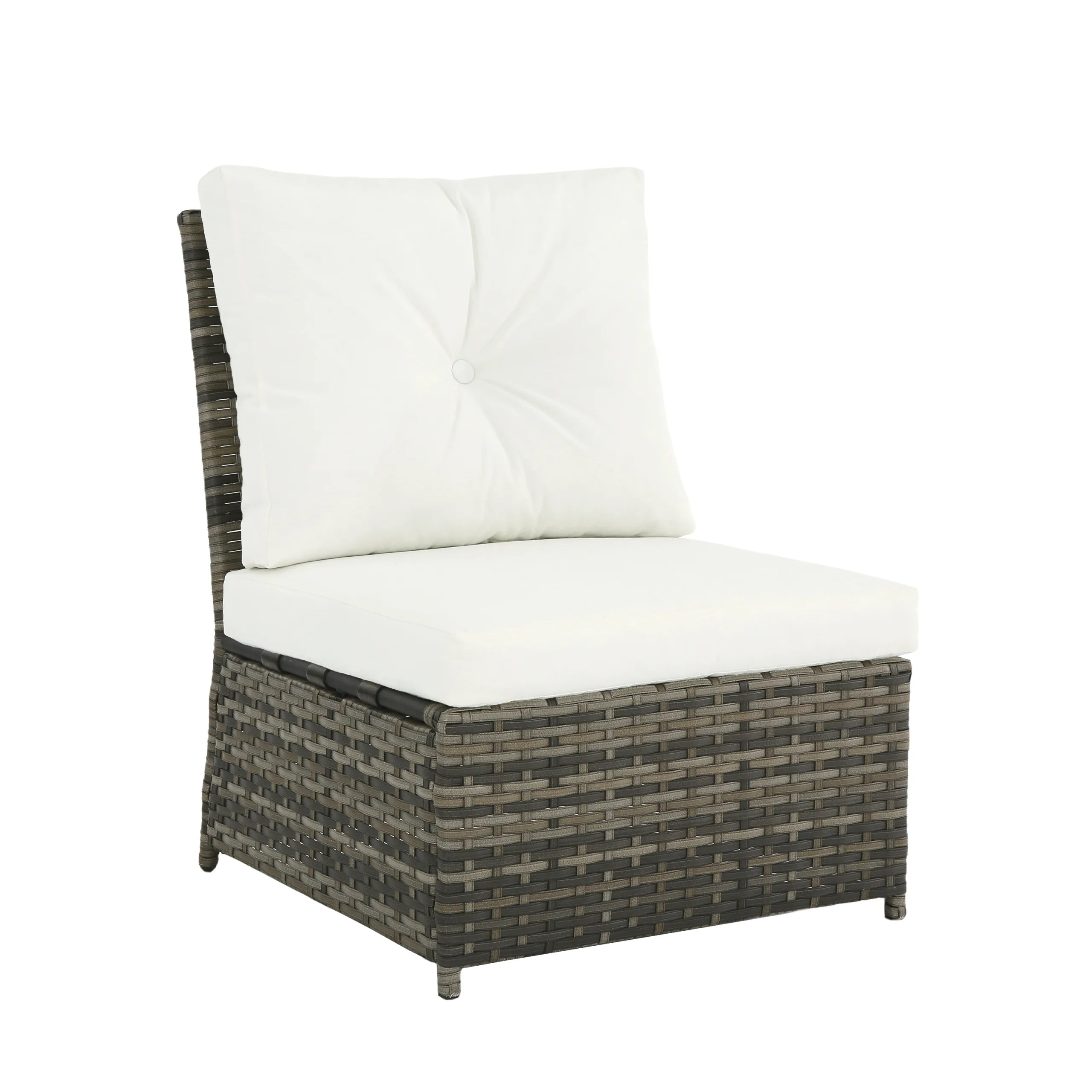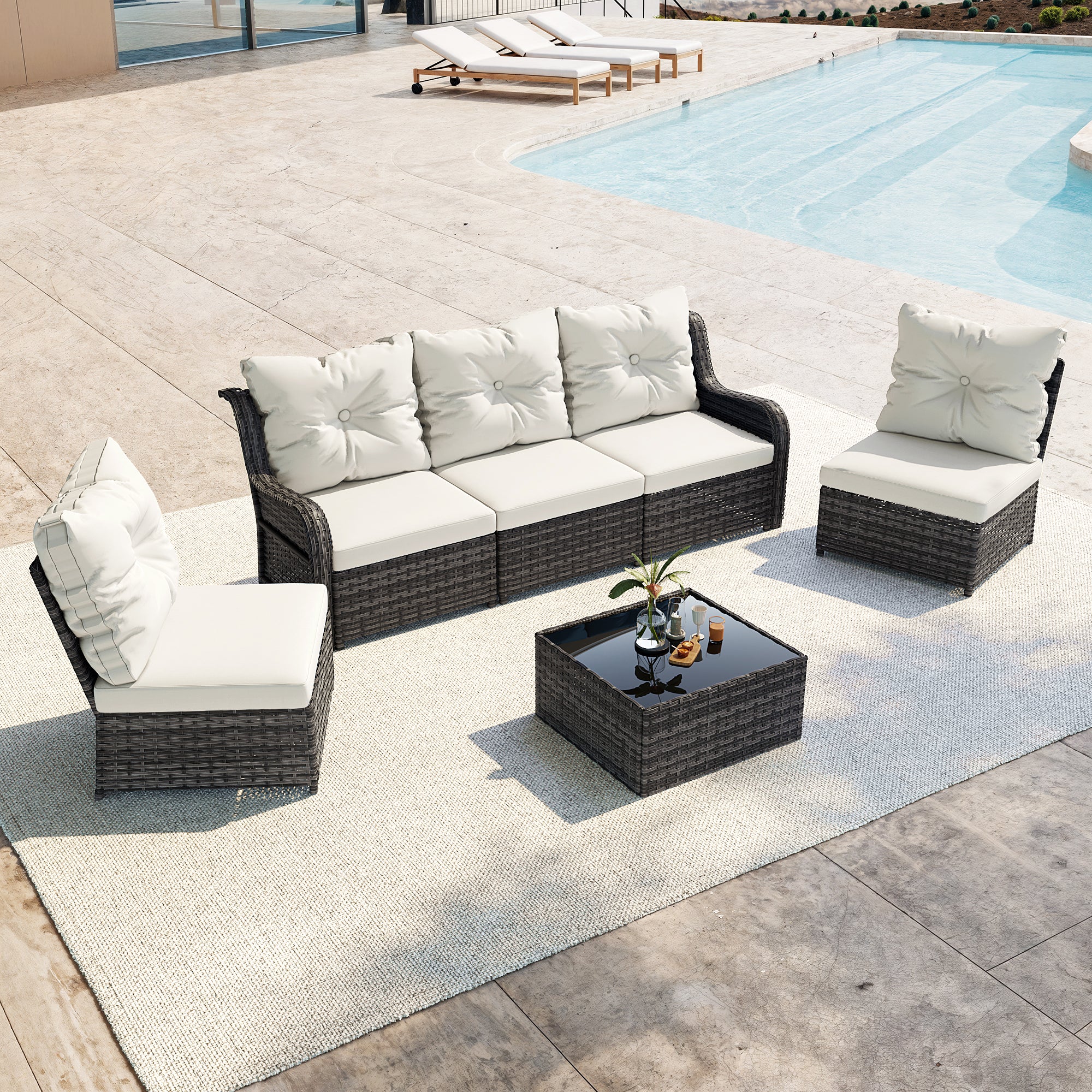Turn your backyard into a relaxing retreat with our Elara 6-Piece PE Wicker Cushioned Outdoor Patio Set with Table. This versatile set includes three armless chairs, two single-arm chairs, and a tempered-glass coffee table, allowing you to create a sofa arrangement, separate seating, or a mix of both. Handwoven in water-resistant PE wicker over powder-coated steel frames, the set is available in a light or deep wicker tone to suit your style. Curved armrests provide a comfortable perch, while each back cushion features a single button tuft for a polished look. The tempered-glass table top cleans easily after drinks and snacks, keeping your outdoor space neat, comfortable, and ready for gatherings.