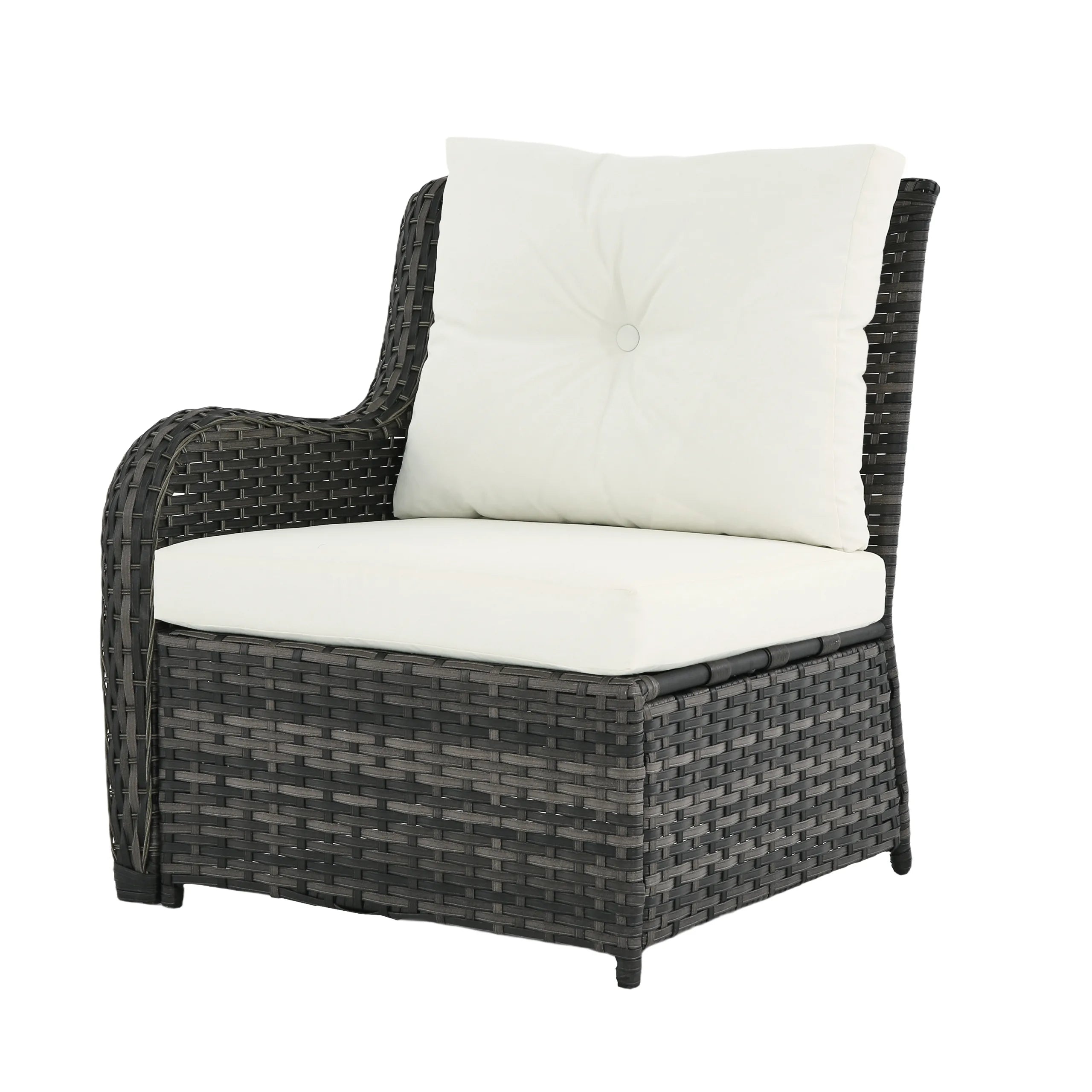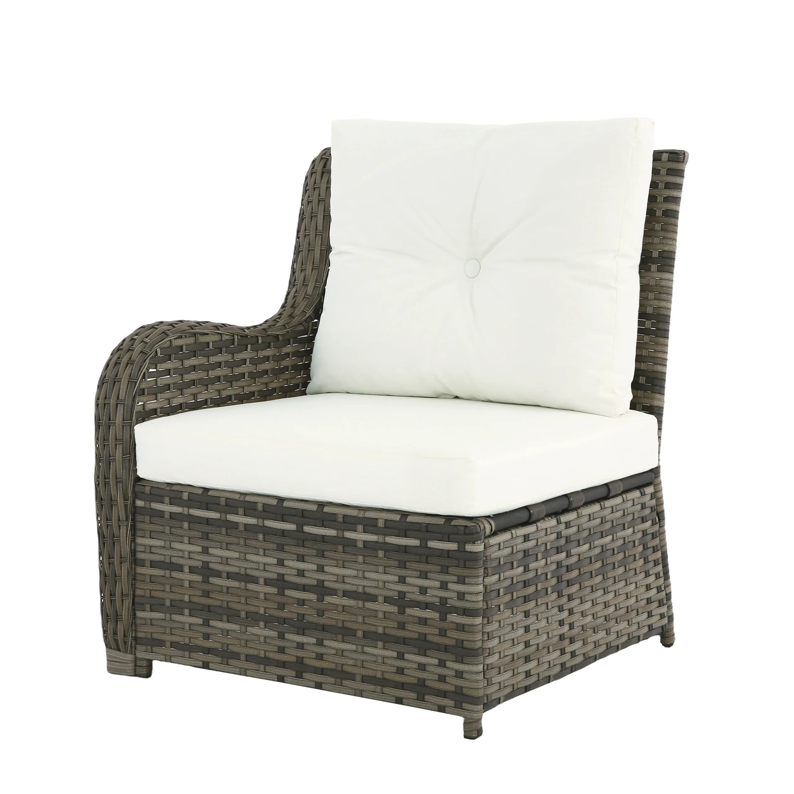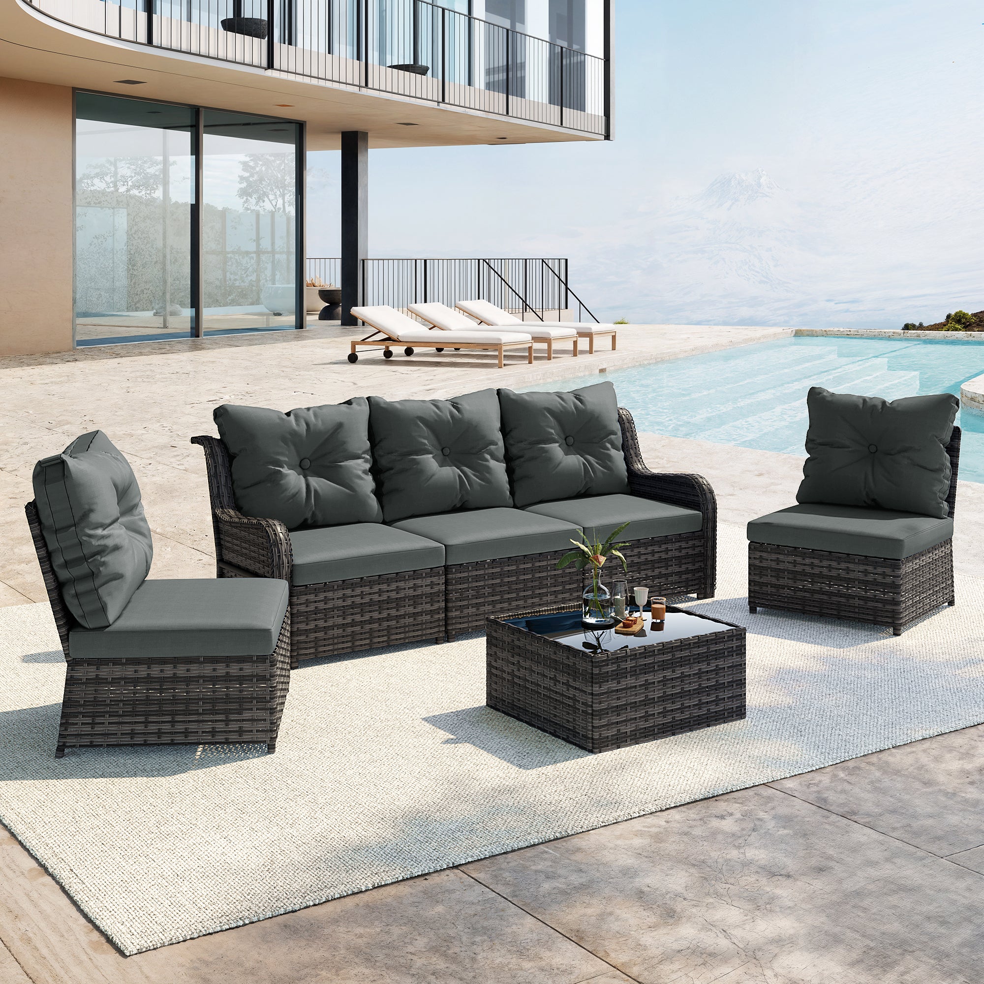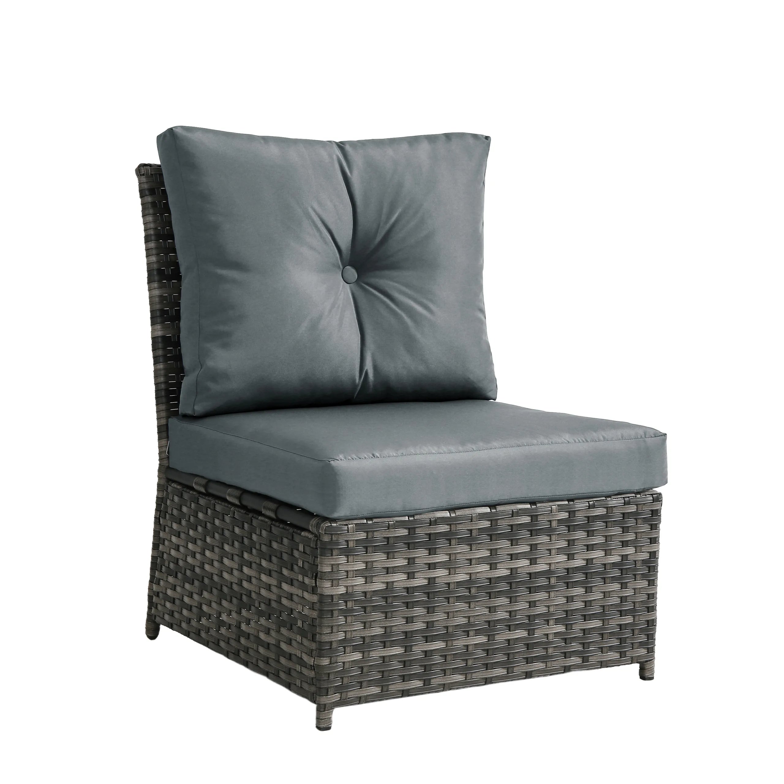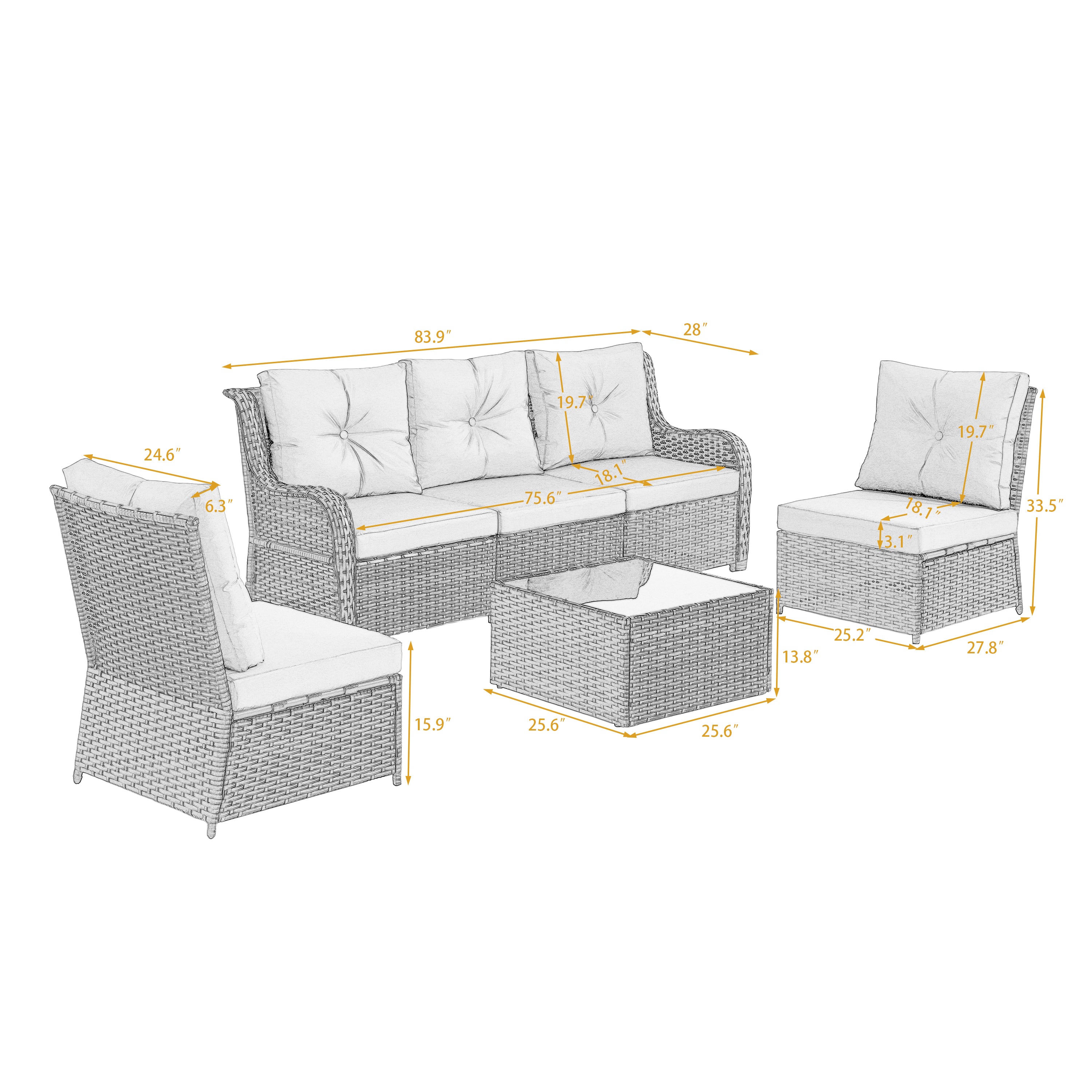 Turn your backyard into a relaxing retreat with our Elara 6-Piece PE Wicker Cushioned Outdoor Patio Set with Table. This versatile set includes three armless chairs, two single-arm chairs, and a tempered-glass coffee table, allowing you to create a sofa arrangement, separate seating, or a mix of both. Handwoven in water-resistant PE wicker over powder-coated steel frames, the set is available in a light or deep wicker tone to suit your style. Curved armrests provide a comfortable perch, while each back cushion features a single button tuft for a polished look. The tempered-glass table top cleans easily after drinks and snacks, keeping your outdoor space neat, comfortable, and ready for gatherings.