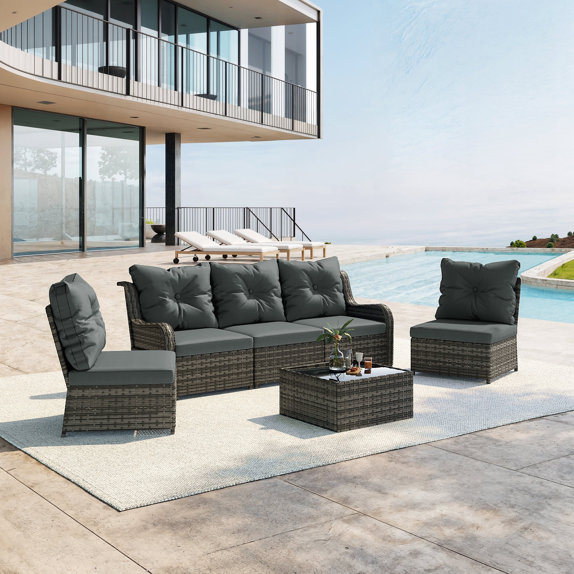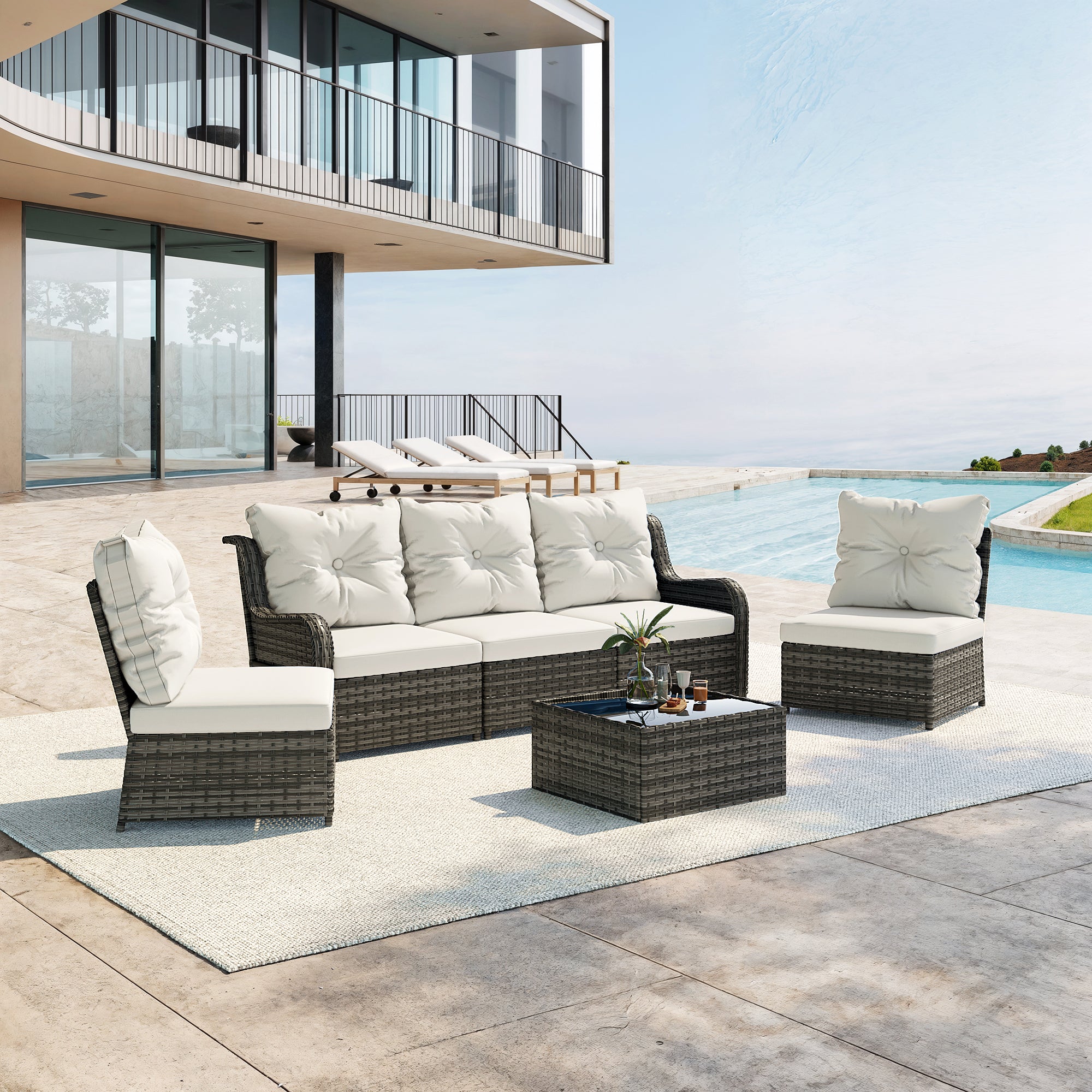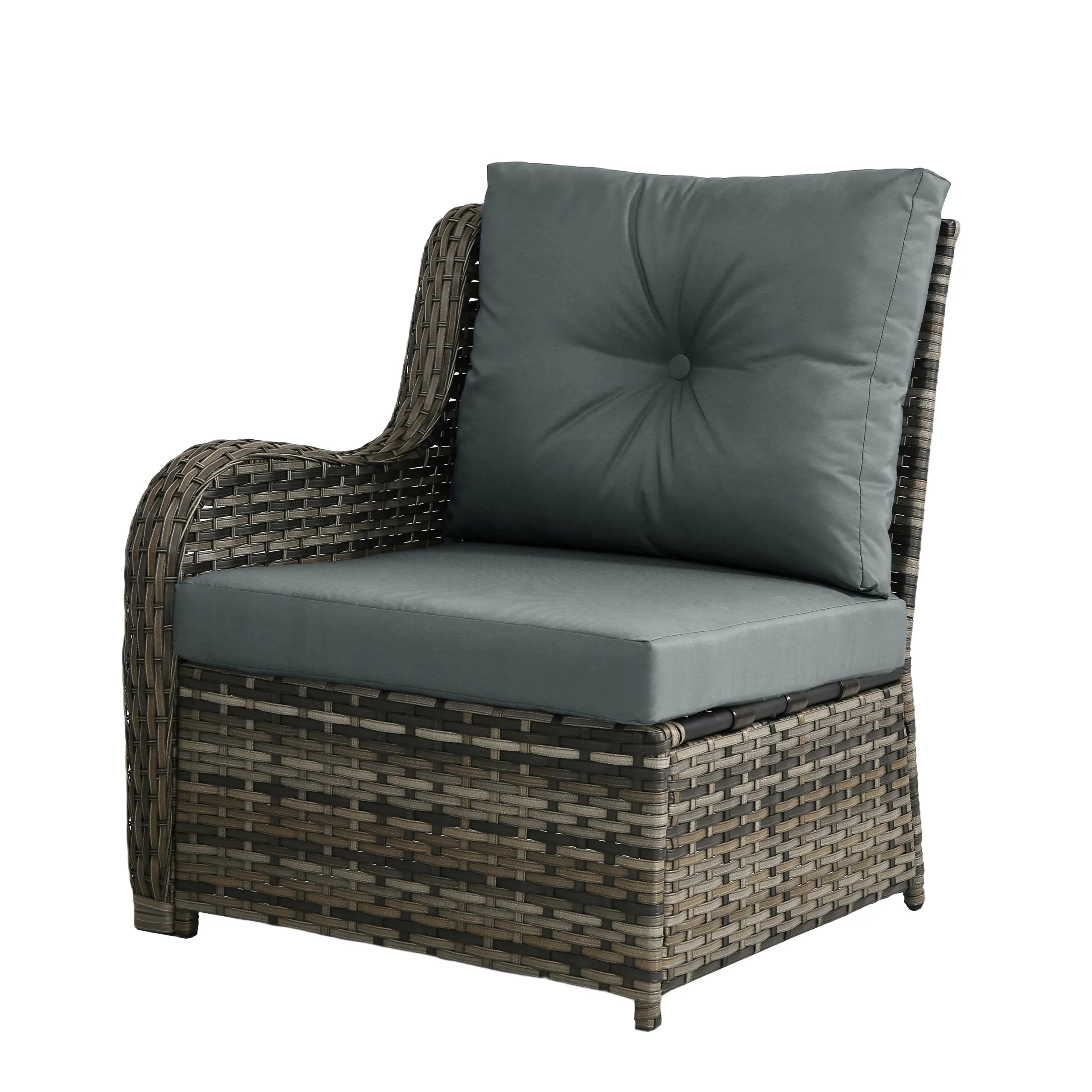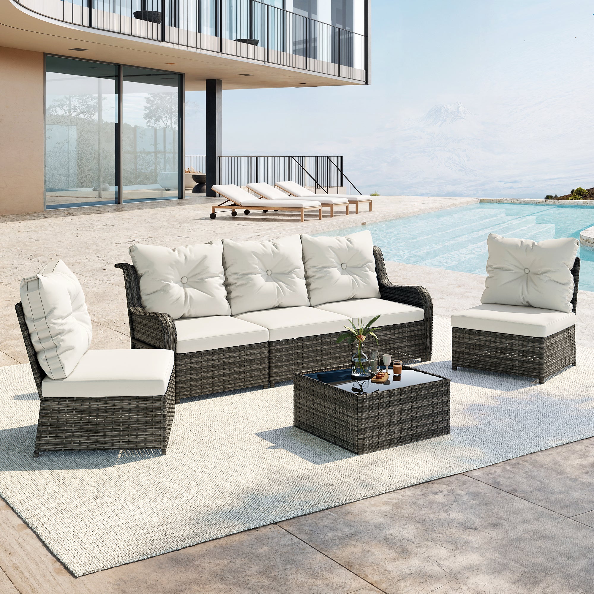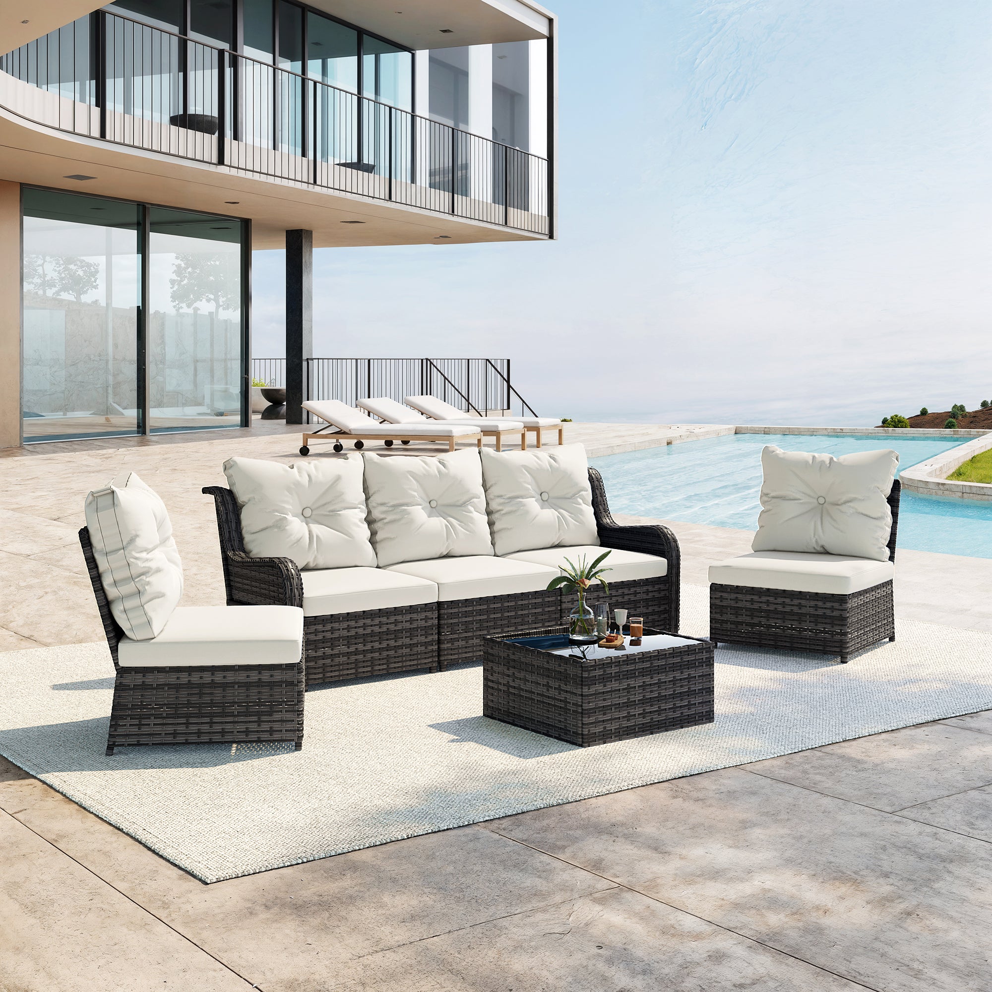 Turn your backyard into a relaxing retreat with our Elara 6-Piece PE Wicker Cushioned Outdoor Patio Set with Table. This versatile set includes three armless chairs, two single-arm chairs, and a tempered-glass coffee table, allowing you to create a sofa arrangement, separate seating, or a mix of both. Handwoven in water-resistant PE wicker over powder-coated steel frames, the set is available in a light or deep wicker tone to suit your style. Curved armrests provide a comfortable perch, while each back cushion features a single button tuft for a polished look. The tempered-glass table top cleans easily after drinks and snacks, keeping your outdoor space neat, comfortable, and ready for gatherings.