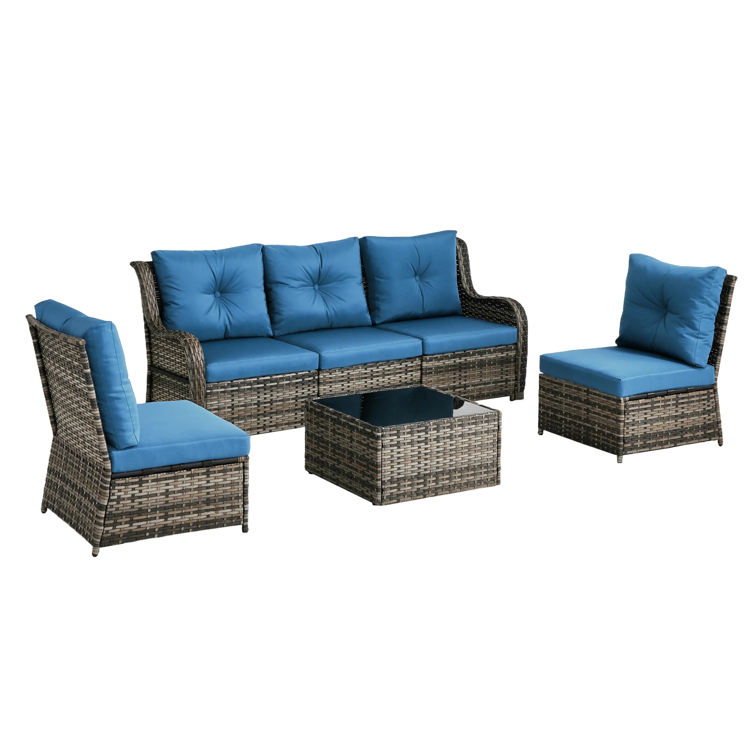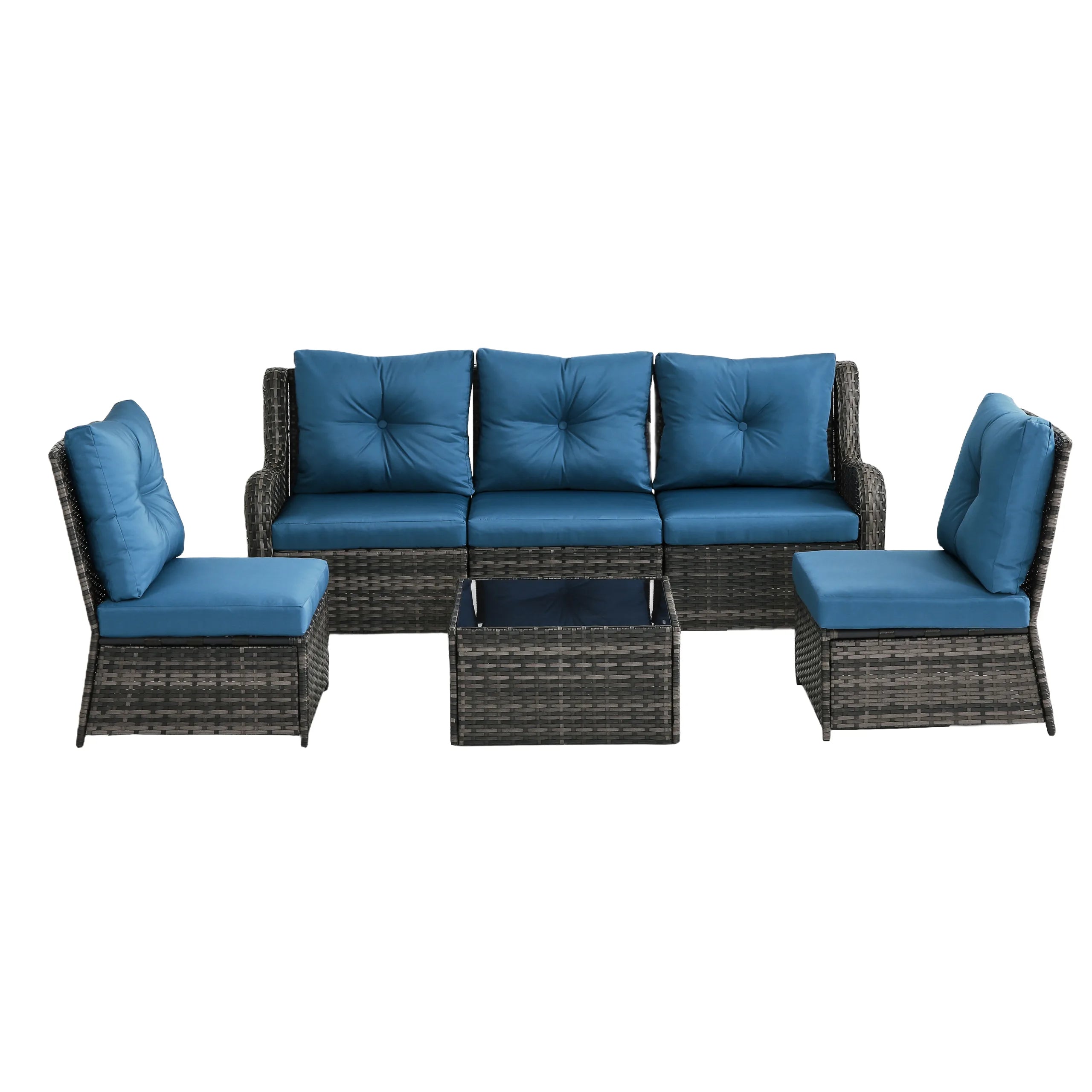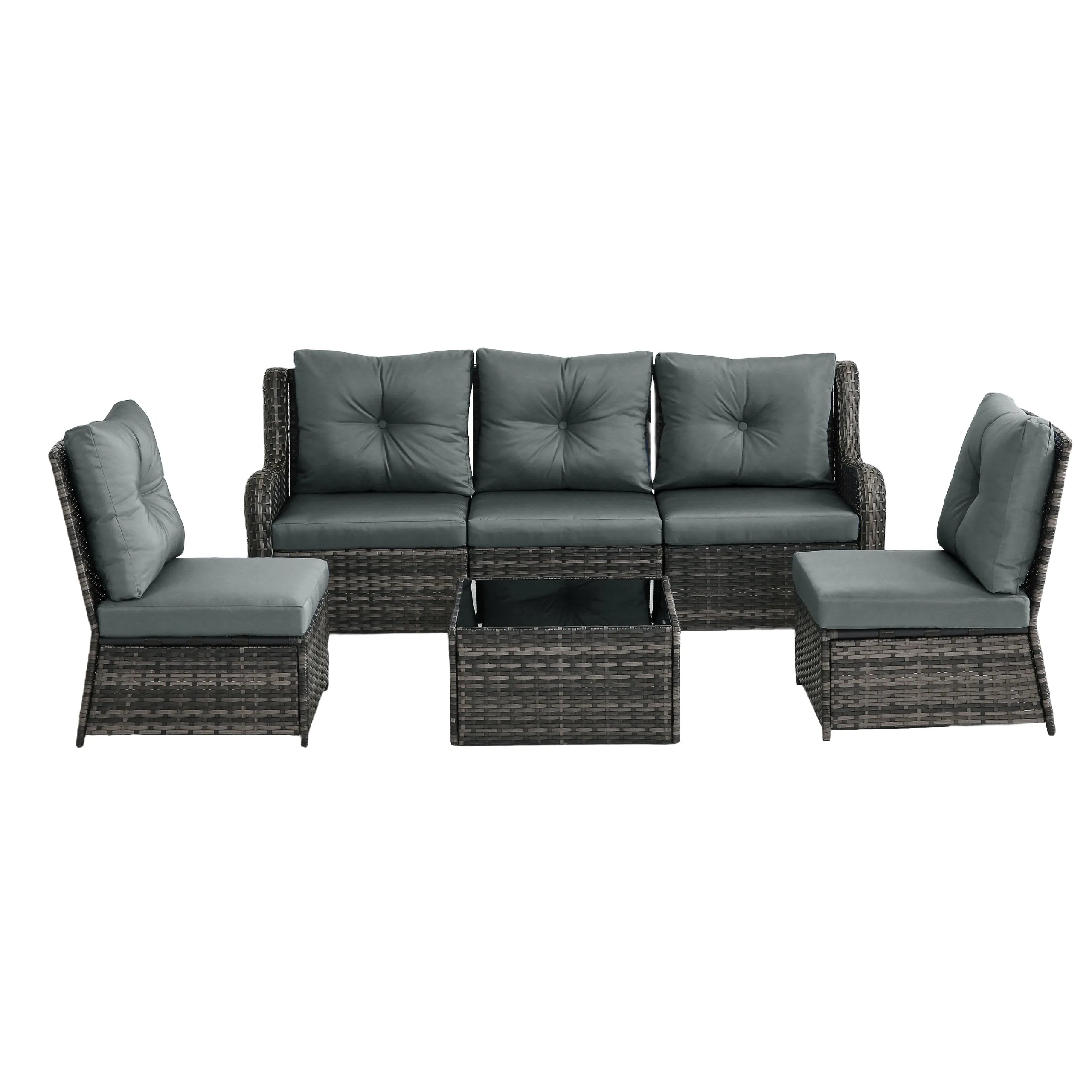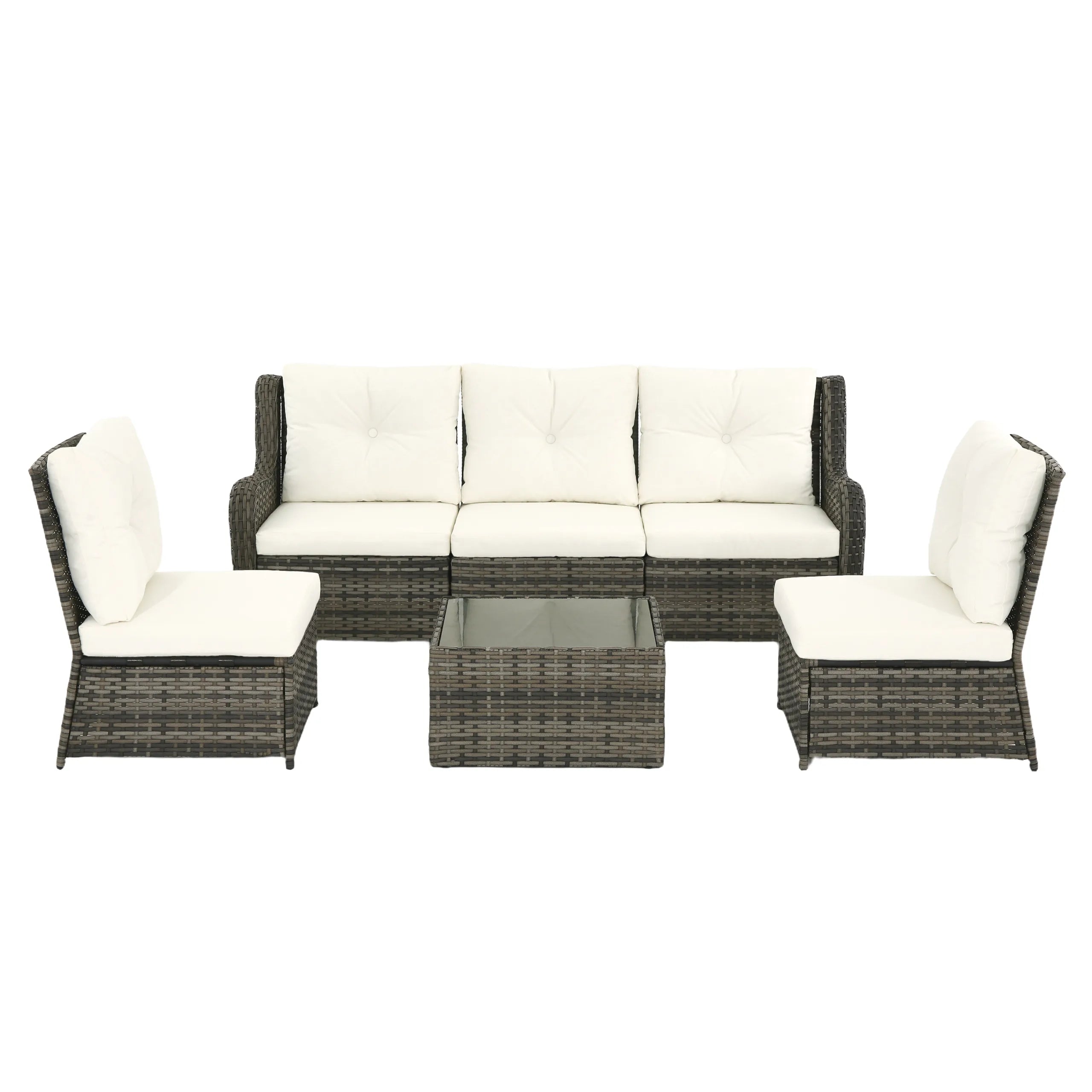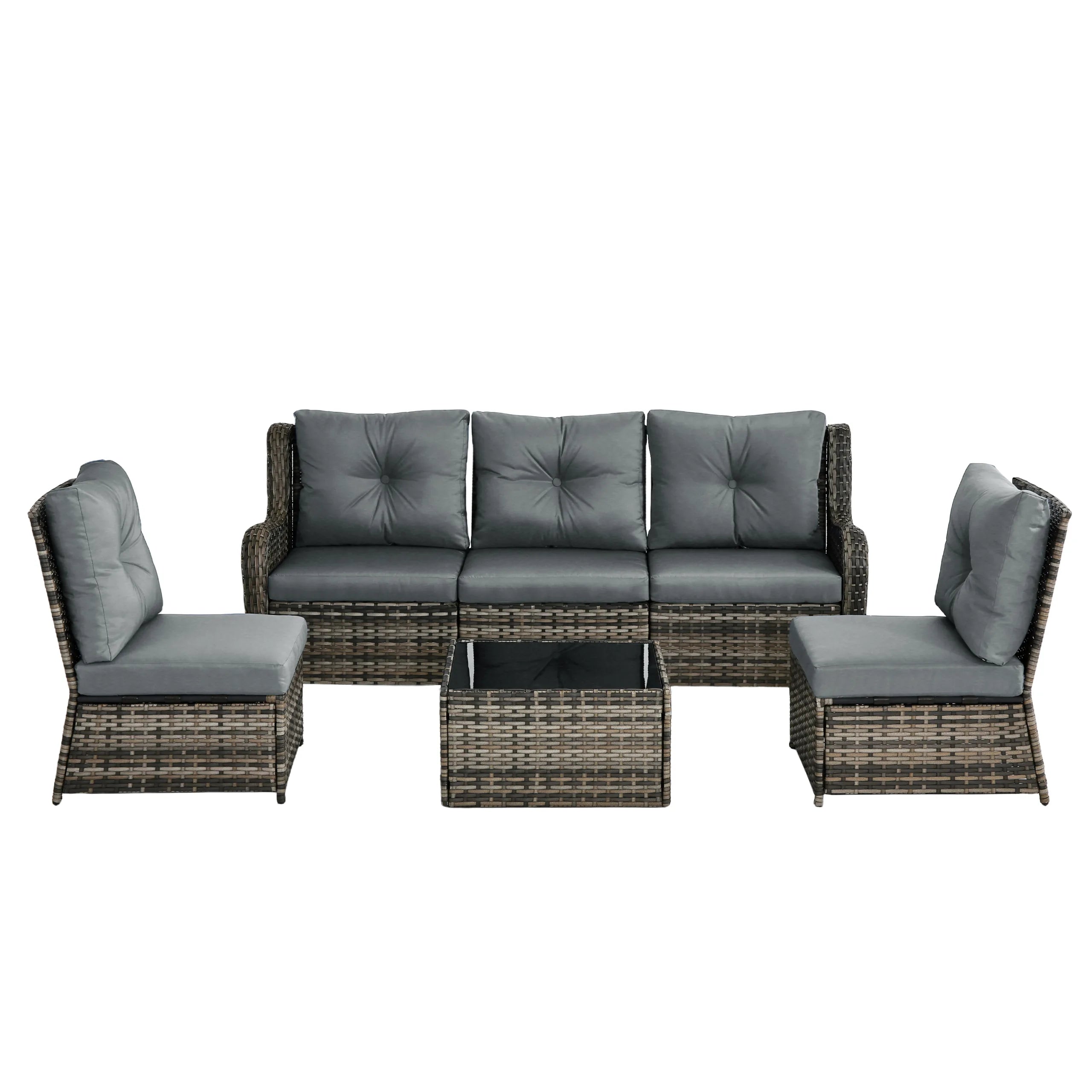 Includes 3 armless chairs, 2 single-arm chairs, and 1 tempered-glass coffee table for flexible patio arrangements.